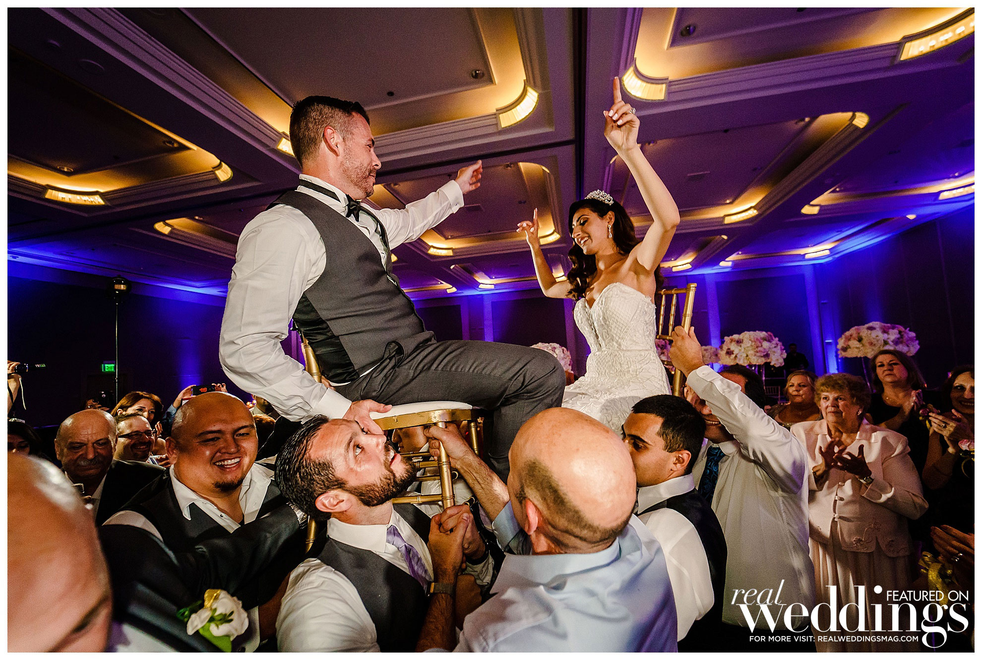 During their reception at the Hyatt Regency Sacramento, the couple danced to an Arabic song into the ballroom, where they met the wedding party and immediate family on the dance floor. “It’s tradition for the bride and groom to be surrounded by the wedding party and immediate family during this introduction, as it’s the first dance to celebrate us as husband and wife,” she says. They also did a chair dance, where the bride was lifted on a chair and the groom was sitting on his groomsmen’s shoulders, and they included “Dabke,” a popular folk dance in Palestinian culture.