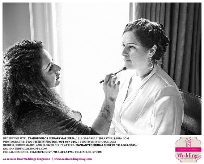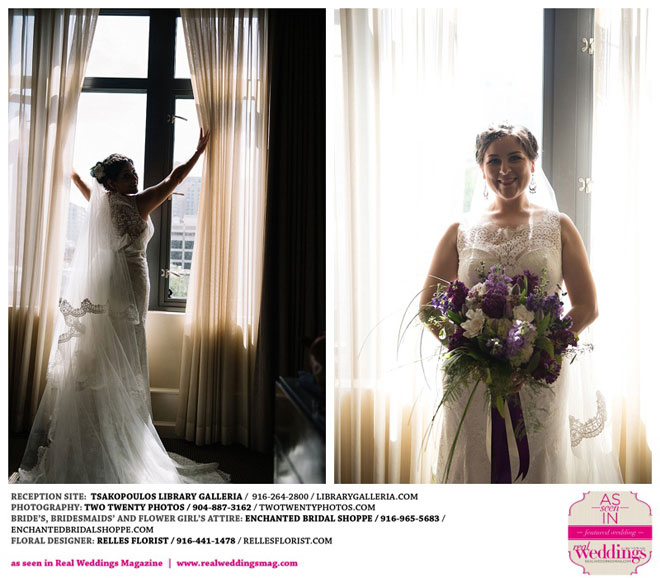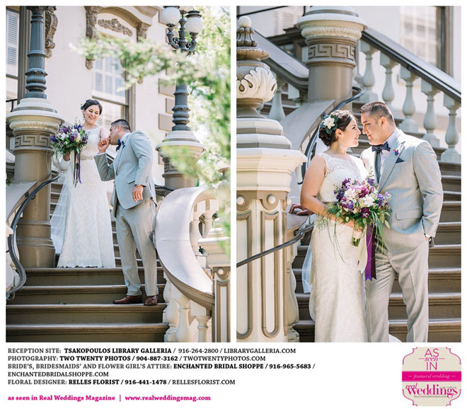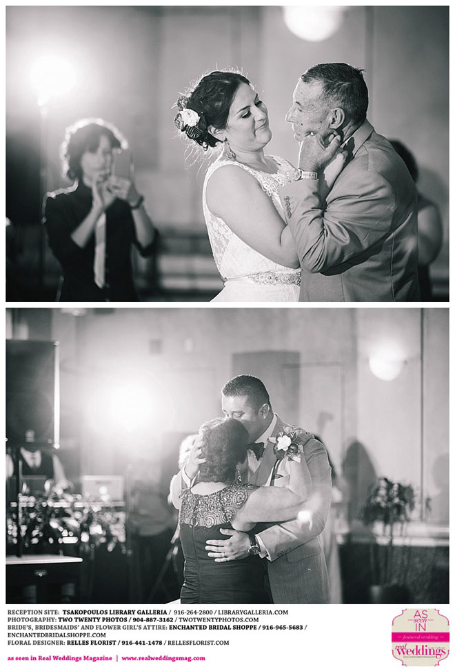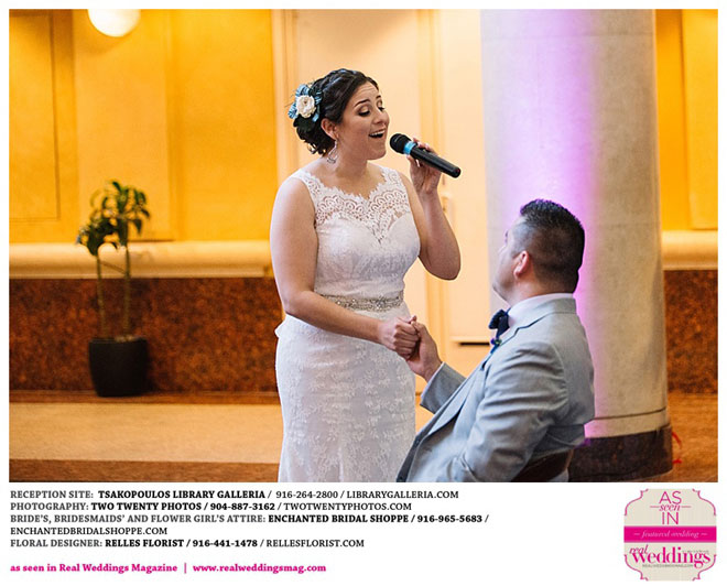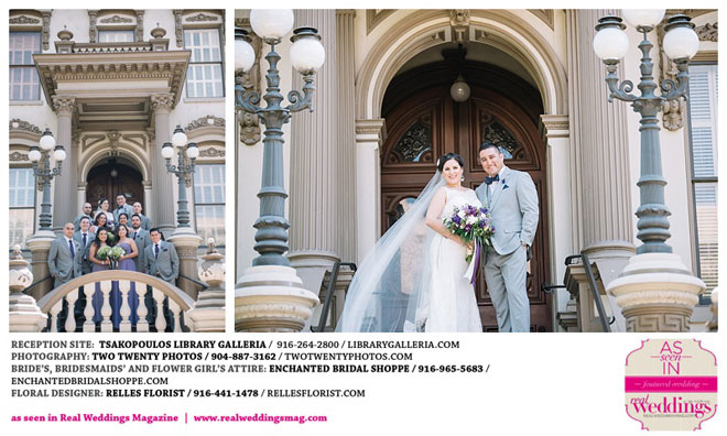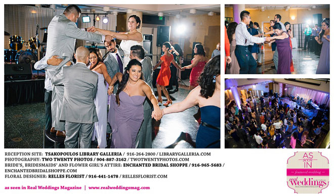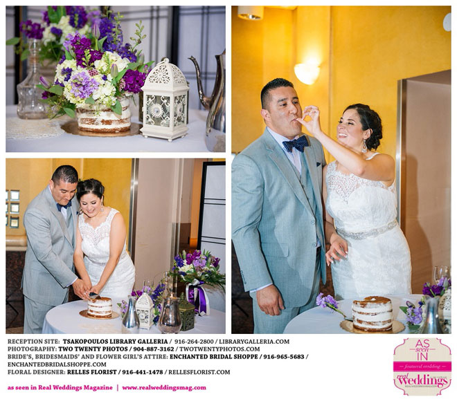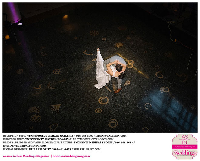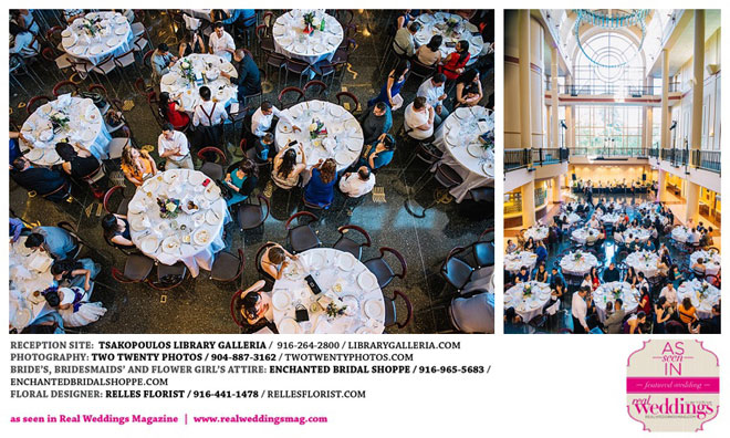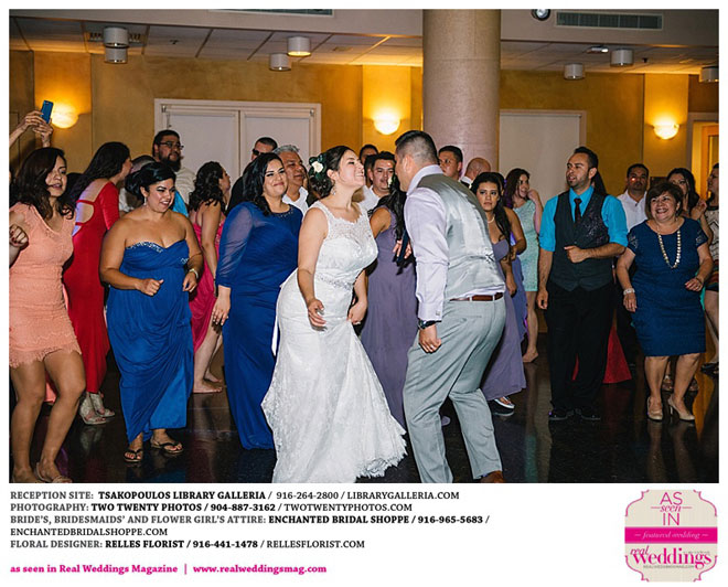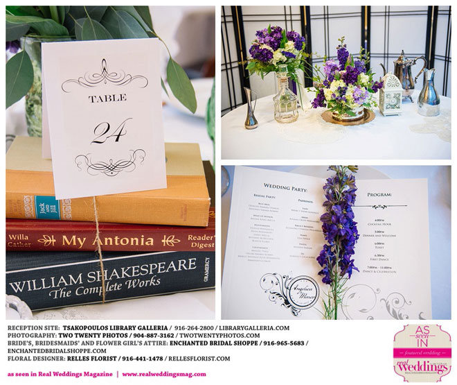 The reception at Tsakopoulos Library Galleria was modern but showcased vintage flair. An old typewriter was displayed at the sign-in table. The couple designed their own centerpieces with old books – different stacks for each table. Angelica, a teacher and “huge bibliophile” (book lover), had collected the books for over a year. Guests got to take the books home as favors.