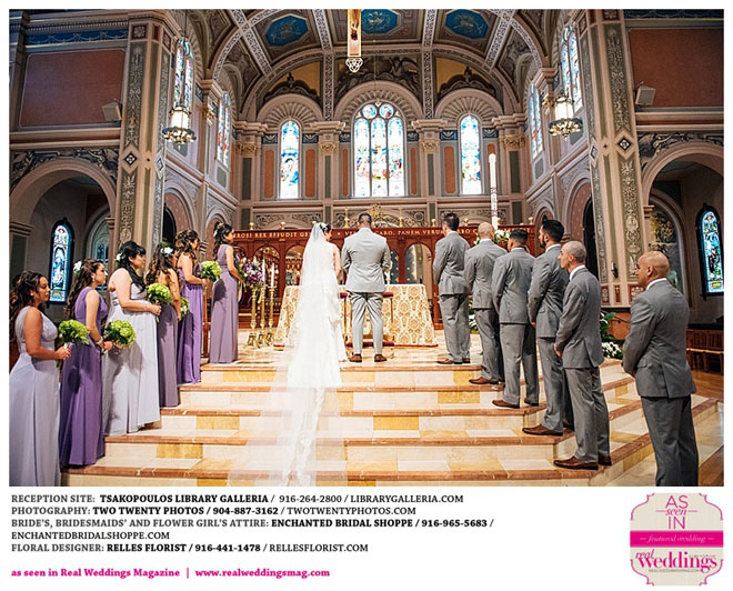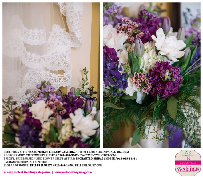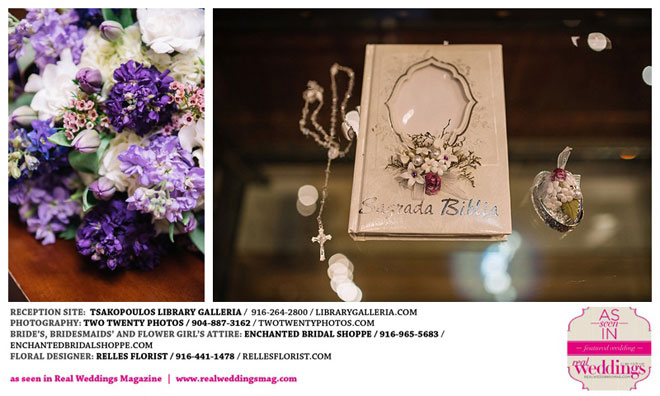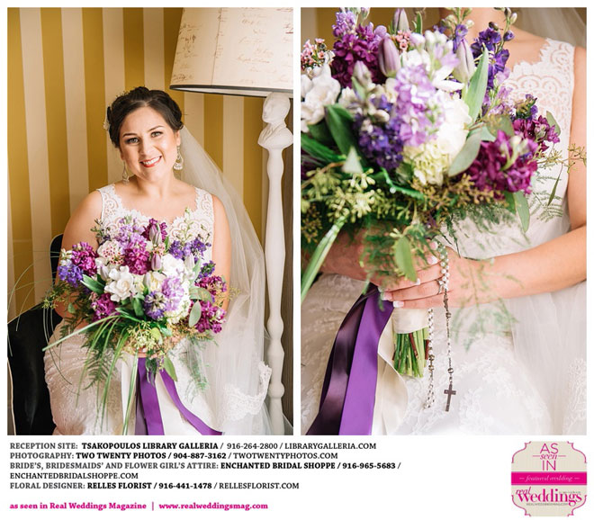 The “fresh, spring” color scheme was purple, green and cream. The bride’s bouquet was wrapped with the rosary her grandmother used at her own wedding.