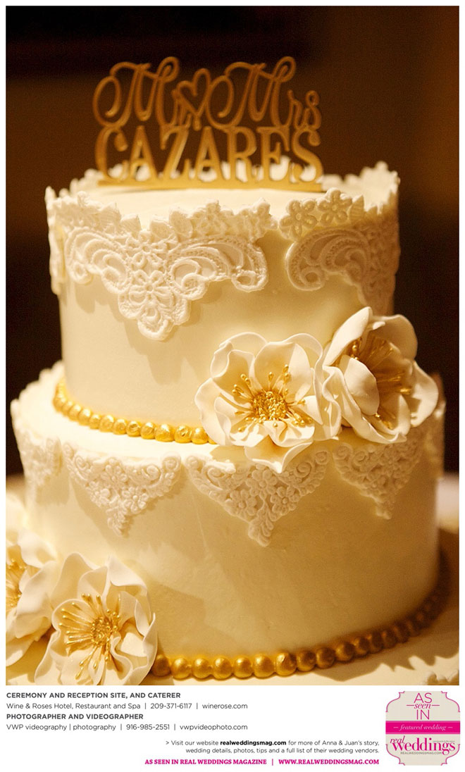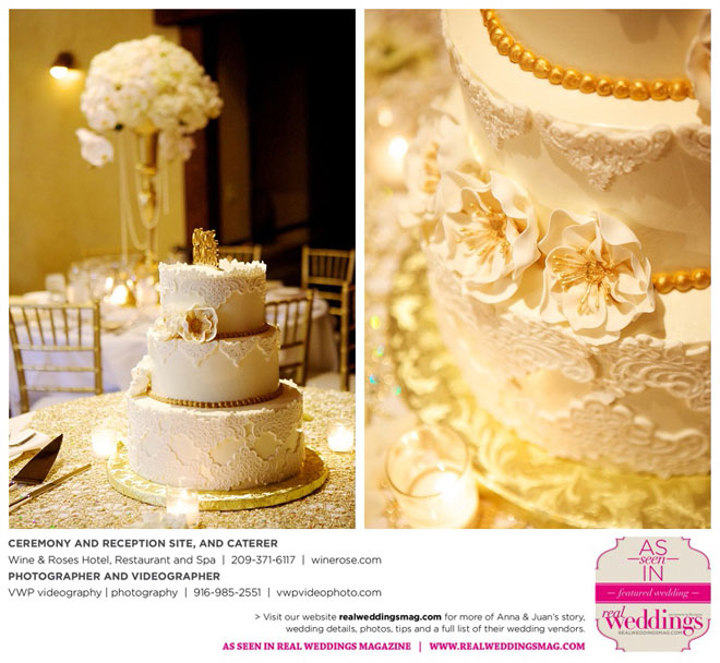 The reception that followed was exactly what the couple envisioned: small enough that they were able to speak with each guest personally and tell them how much it meant for them to be there. The three-tier cake adorned with gold and lace highlighted the sumptuous décor. “The cake by Freeport Bakery was amazing—they even added a lace pattern that matched my dress,” Anna says.