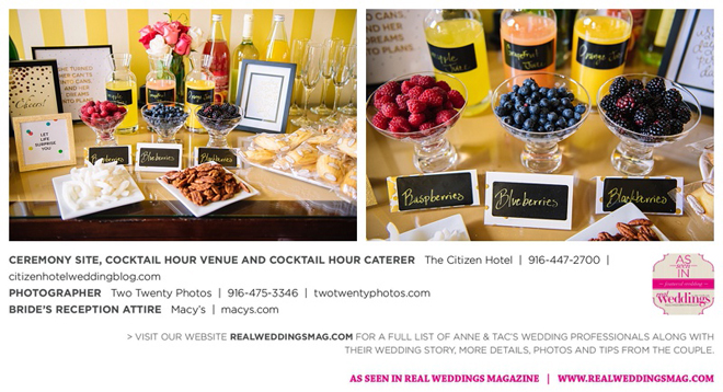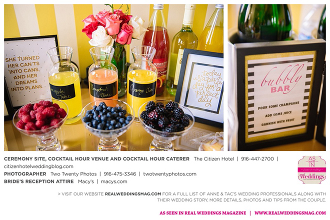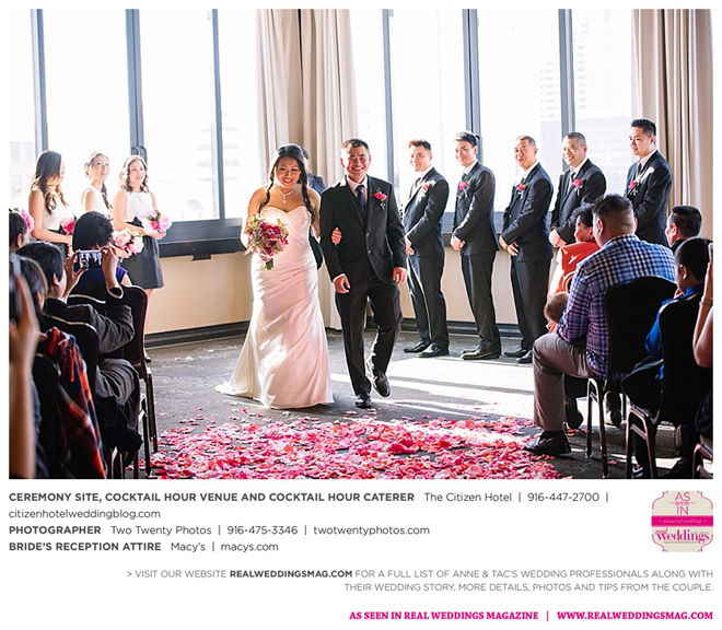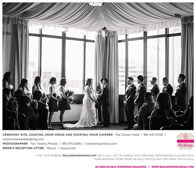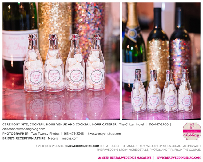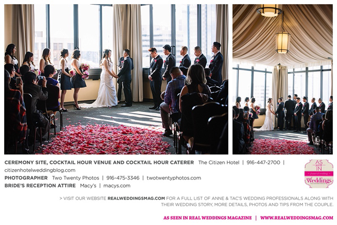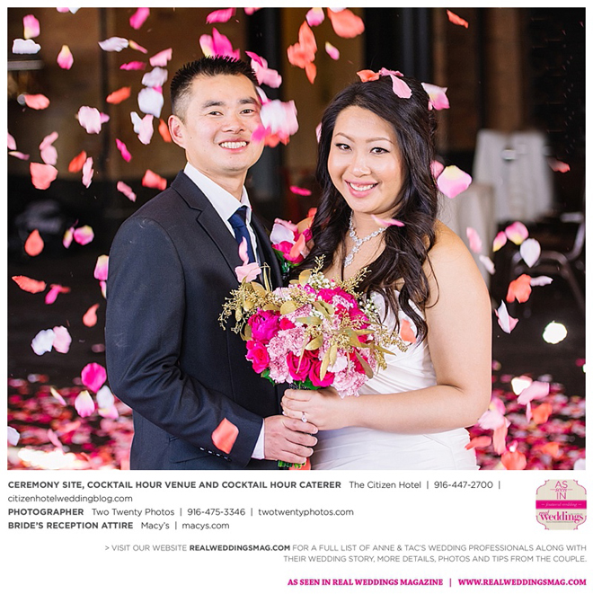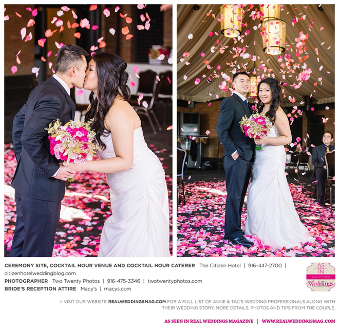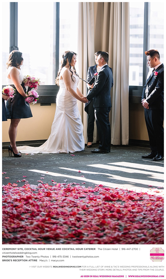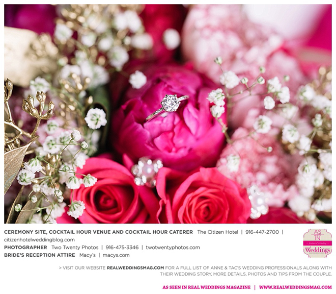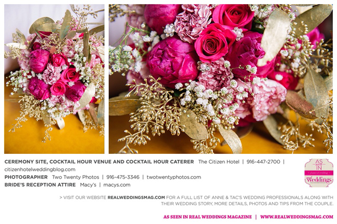 They married later that day at The Citizen Hotel. “We had scattered about 10,000 different colored rose petals as the aisle runner and had about 60 to 70 people in attendance for the ceremony,” says Anne, explaining they wanted an intimate ceremony since 400 guests attended the reception.