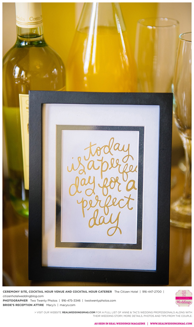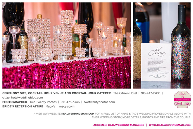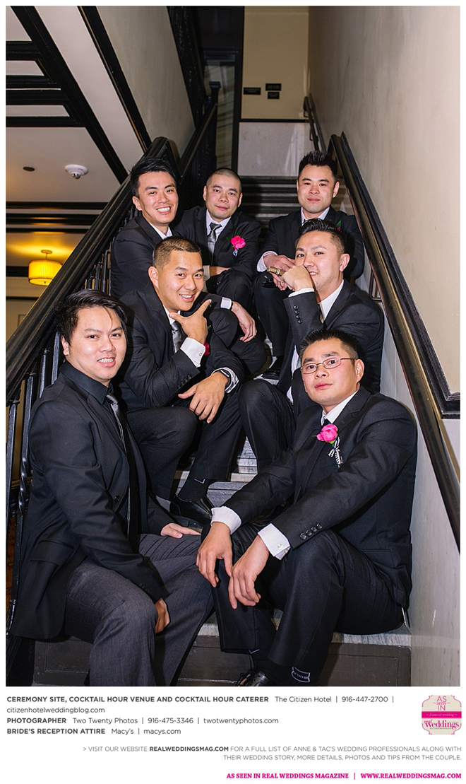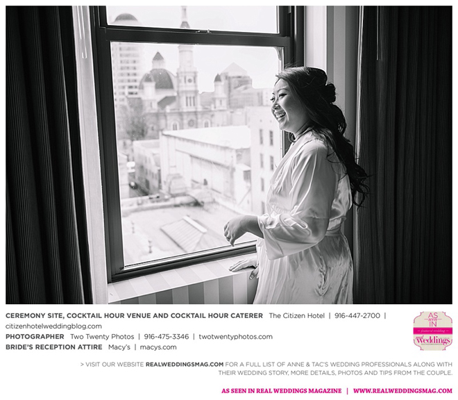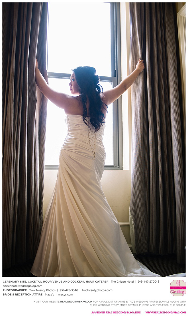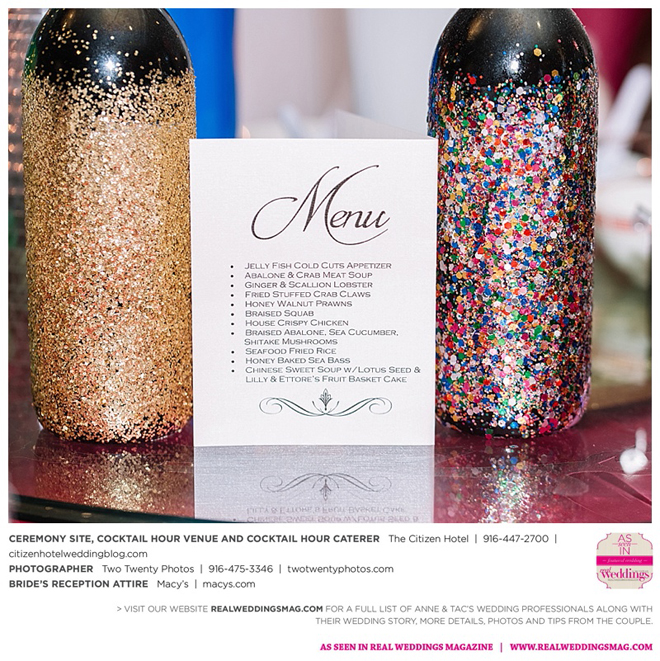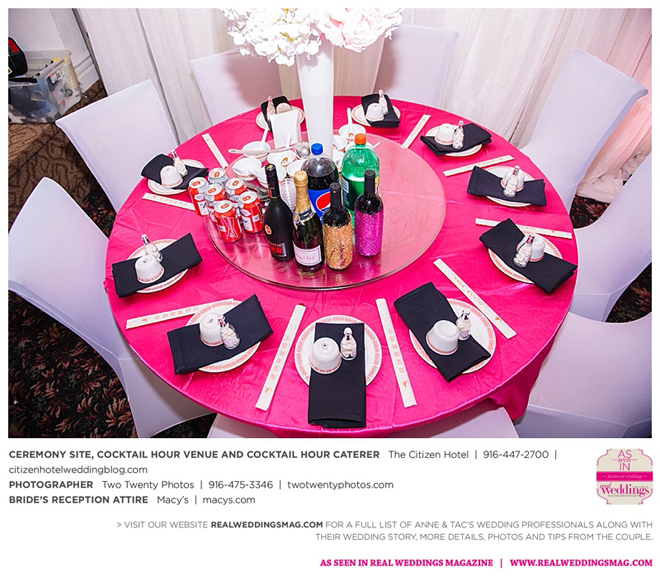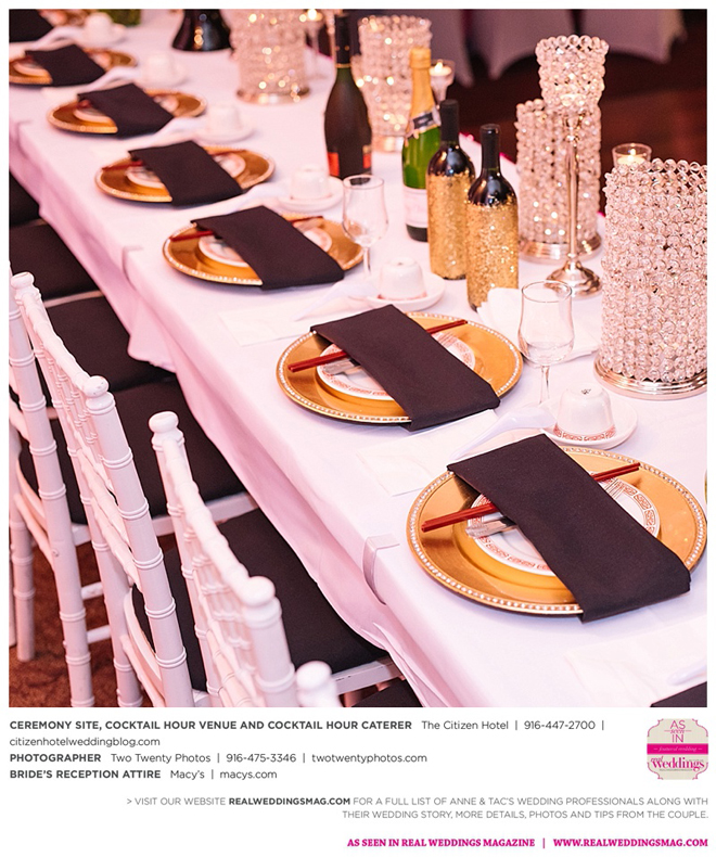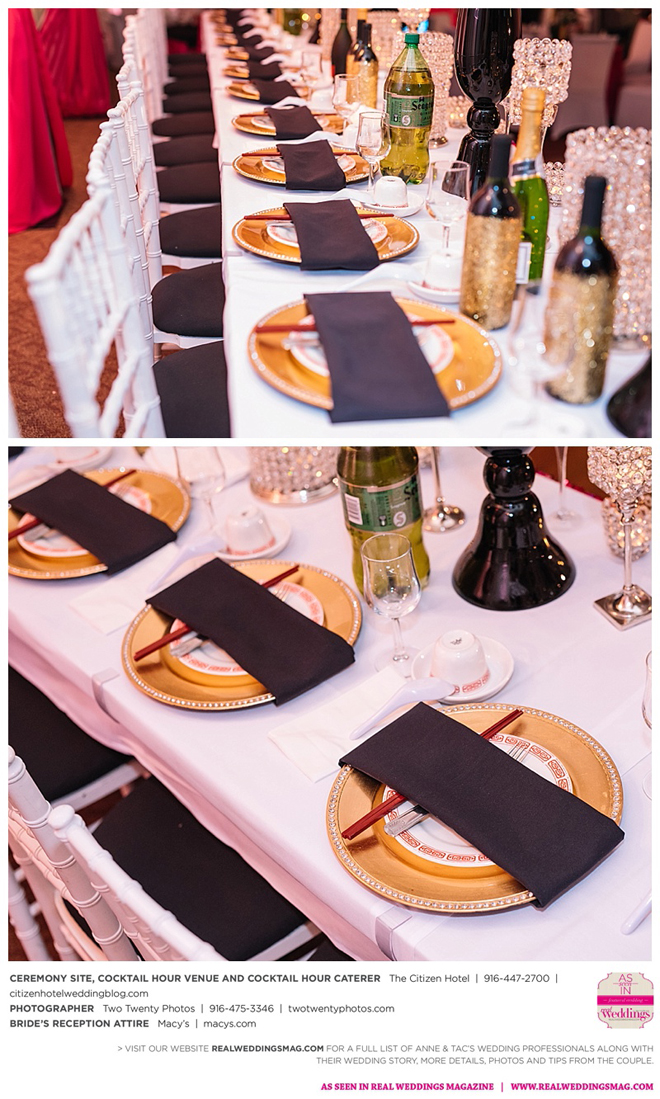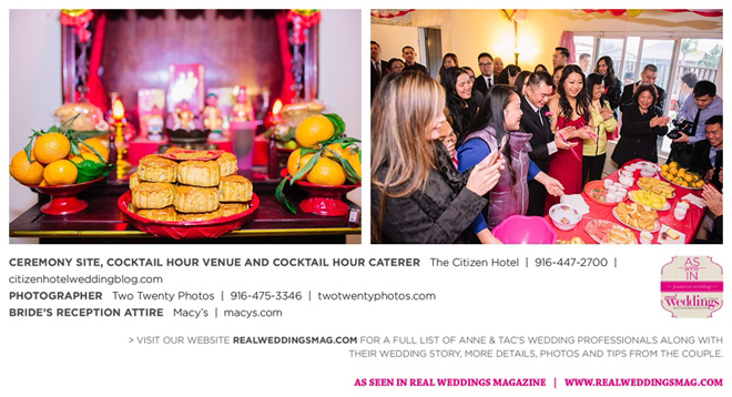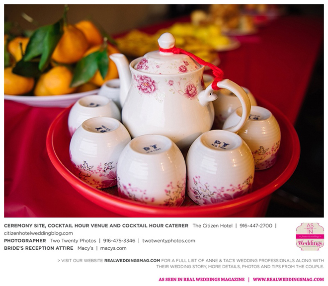Early in the morning of the wedding day, the couple had the traditional Chinese tea ceremony with family. “I offered tea to all the elders in the family I was entering,” says Anne. “In addition to a tea offering, there were cakes, cookies and other sweets laid out so Tac and I could offer different foods to the different aunts and uncles. In return, they gifted us with different pieces of jewelry and monetary gifts to wish us luck in our marriage.”