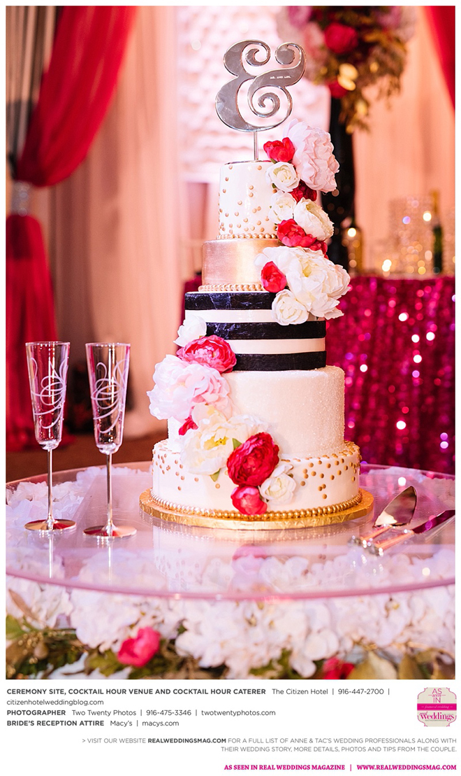 The five-tiered cake, in flavors like fruit basket, princess torte and lemon chiffon, each featured a different Kate Spade-inspired design. For example: a white glitter tier, a black and white striped tier, a solid gold tier and two gold and silver polka dotted tiers. The cake was finished with flowers and of course, a Kate Spade topper.