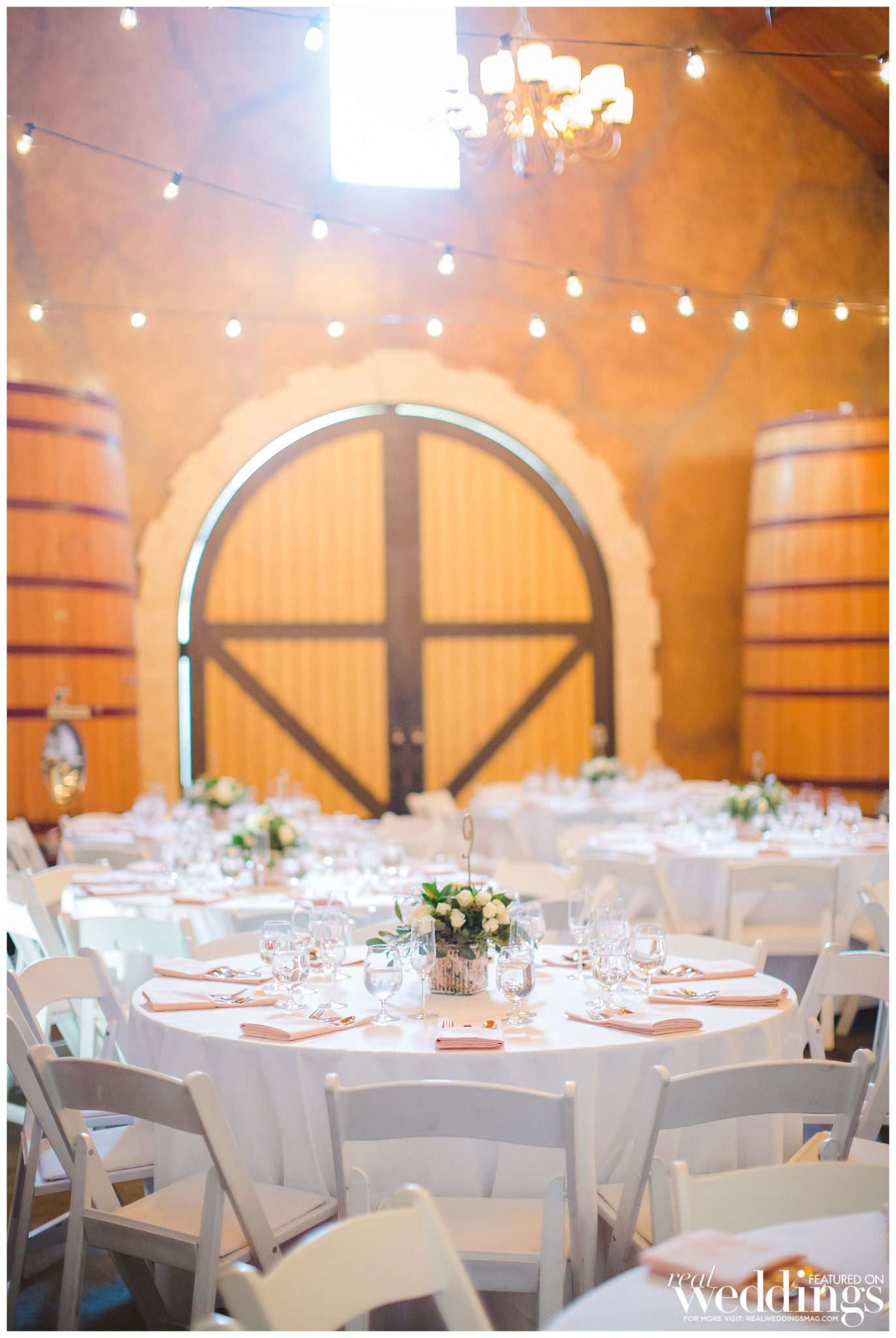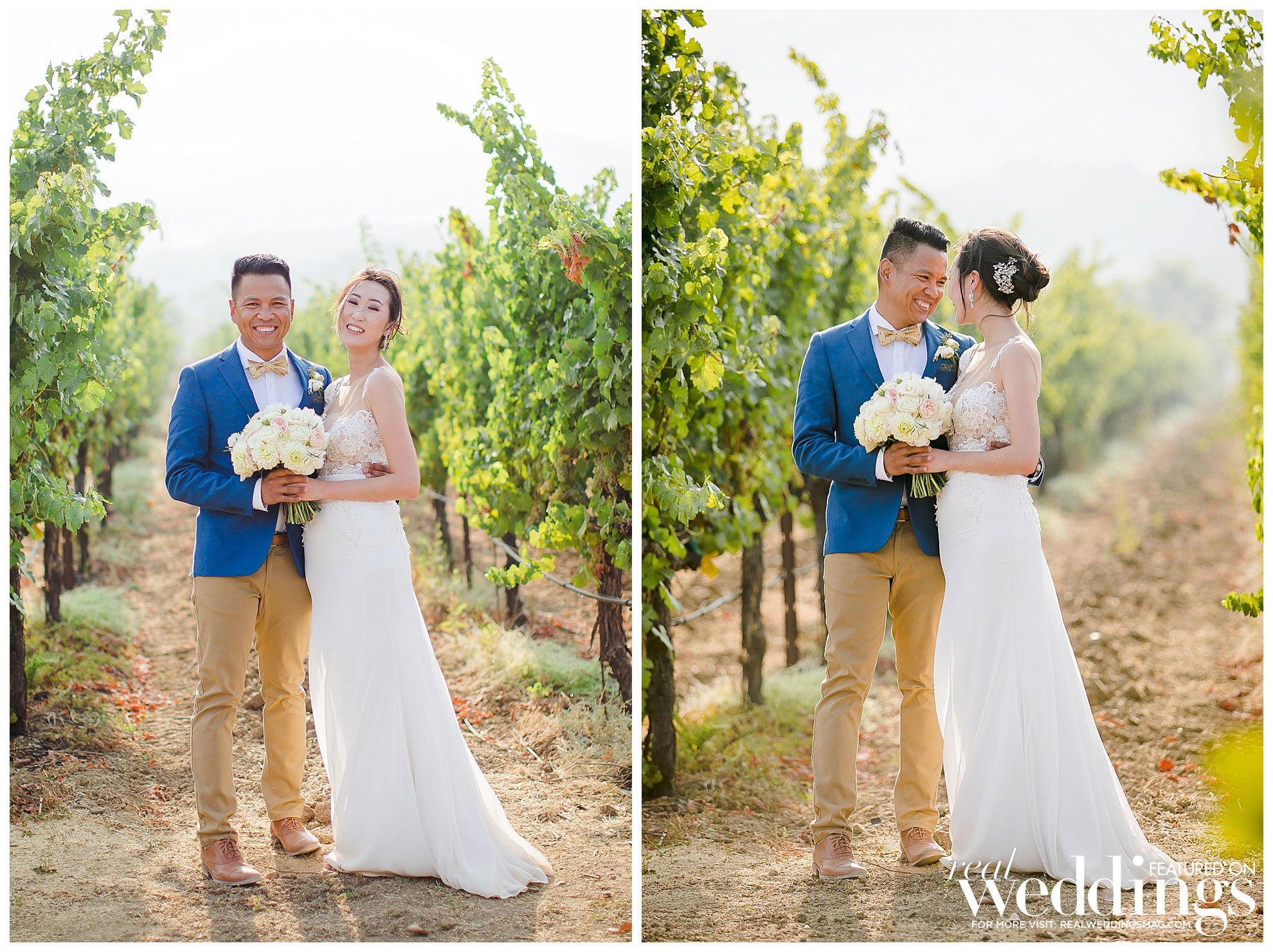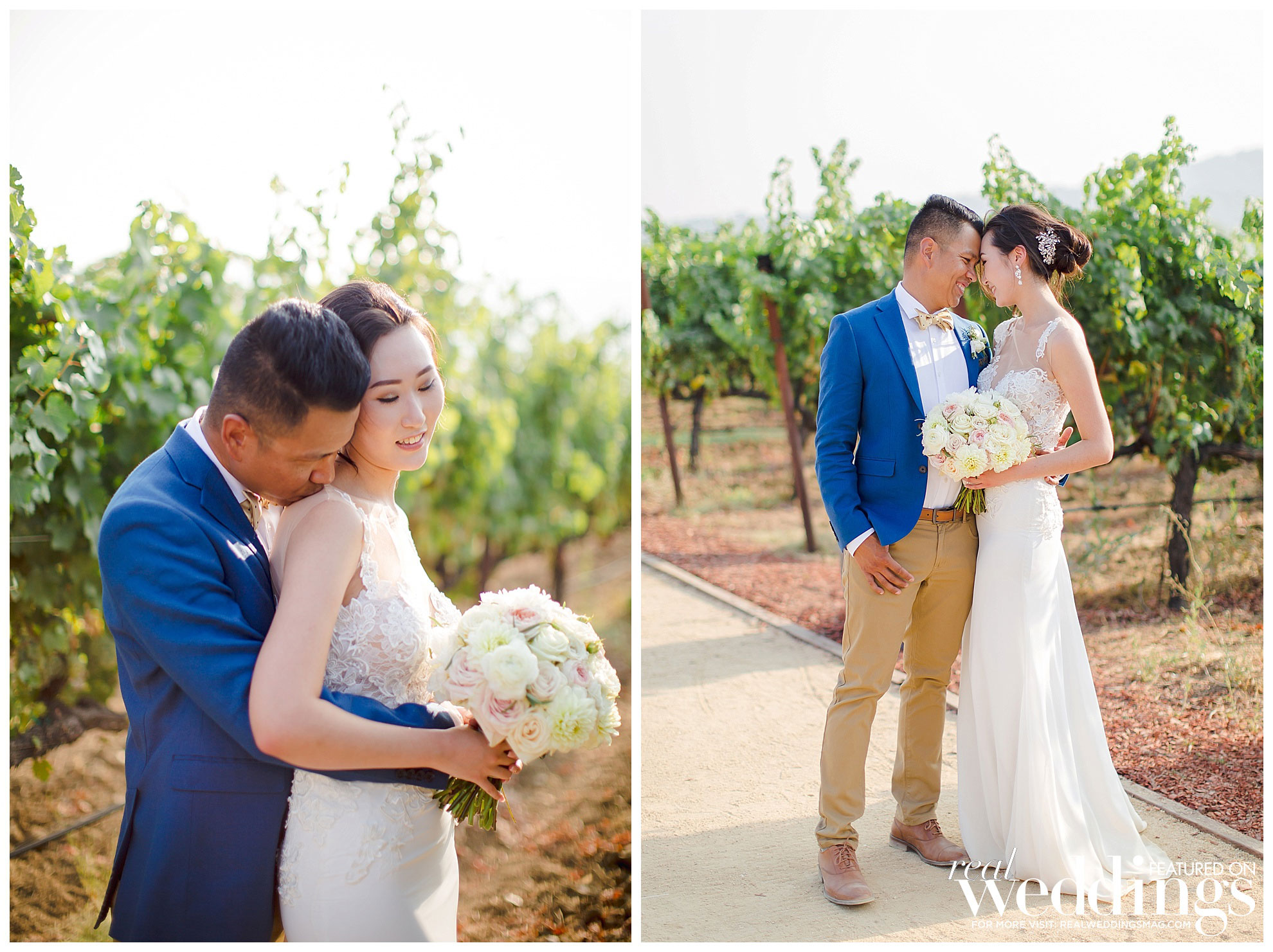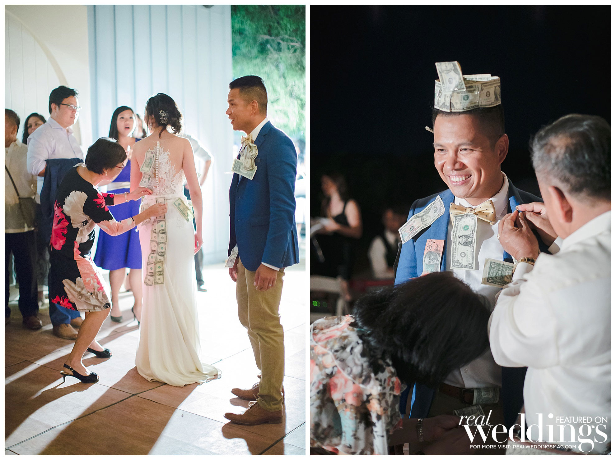 The reception was also held at the vineyard. The couple, both engineers, chose a light color scheme of white and gold, with bits of blush to complement the barrel room’s light blue shade on the outside as well as the lush greenery in the backdrop. They had a traditional Filipino money dance during the reception.