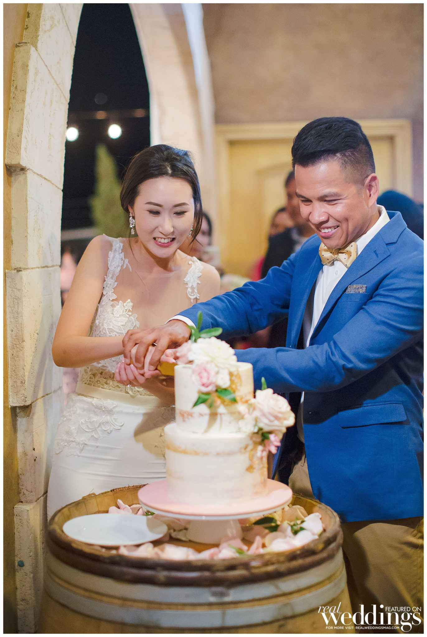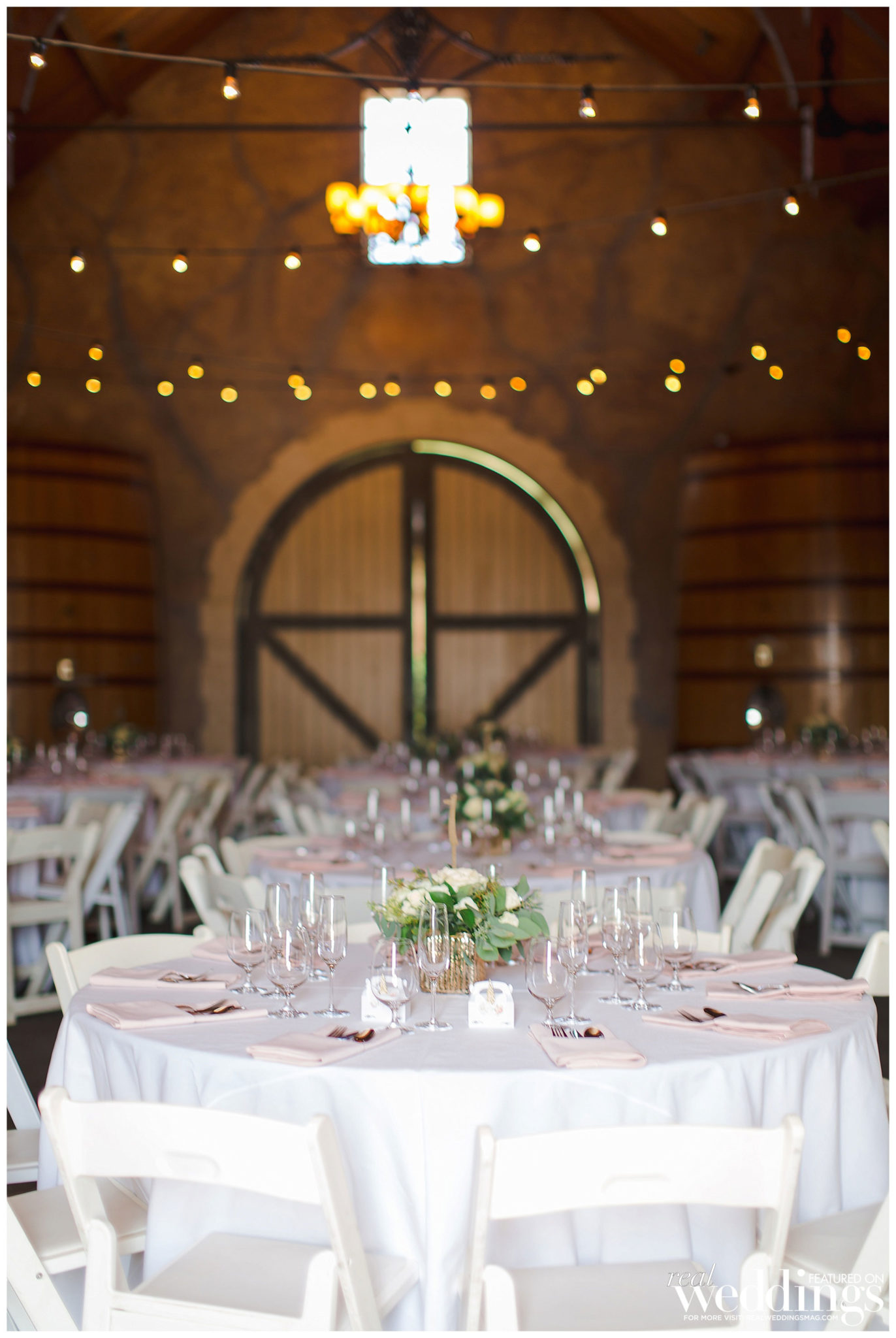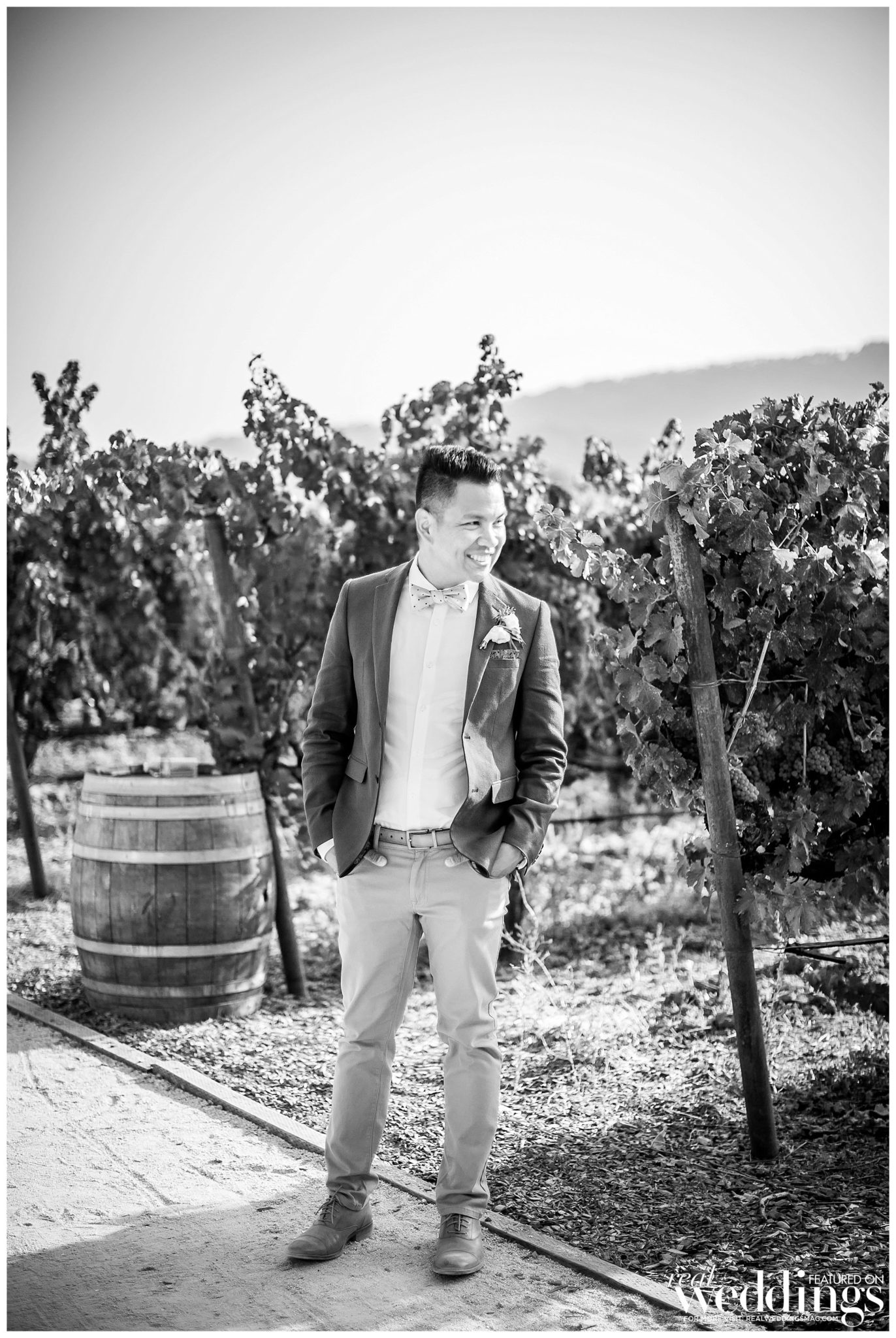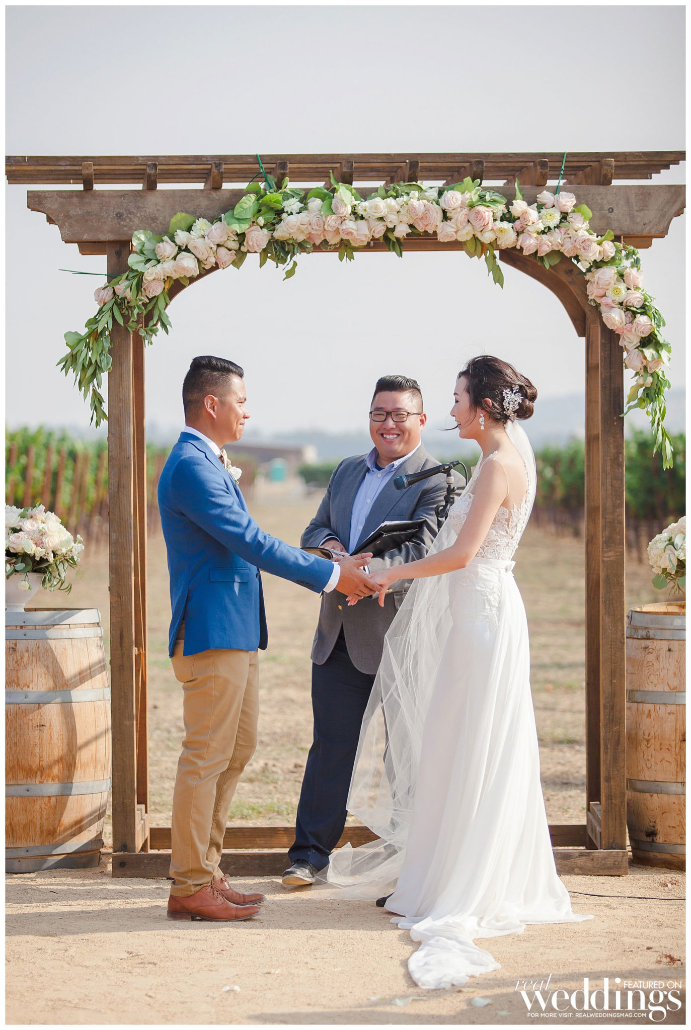 The reception was also held at the vineyard. The couple, both engineers, chose a light color scheme of white and gold, with bits of blush to complement the barrel room’s light blue shade on the outside as well as the lush greenery in the backdrop. They had a traditional Filipino money dance during the reception.