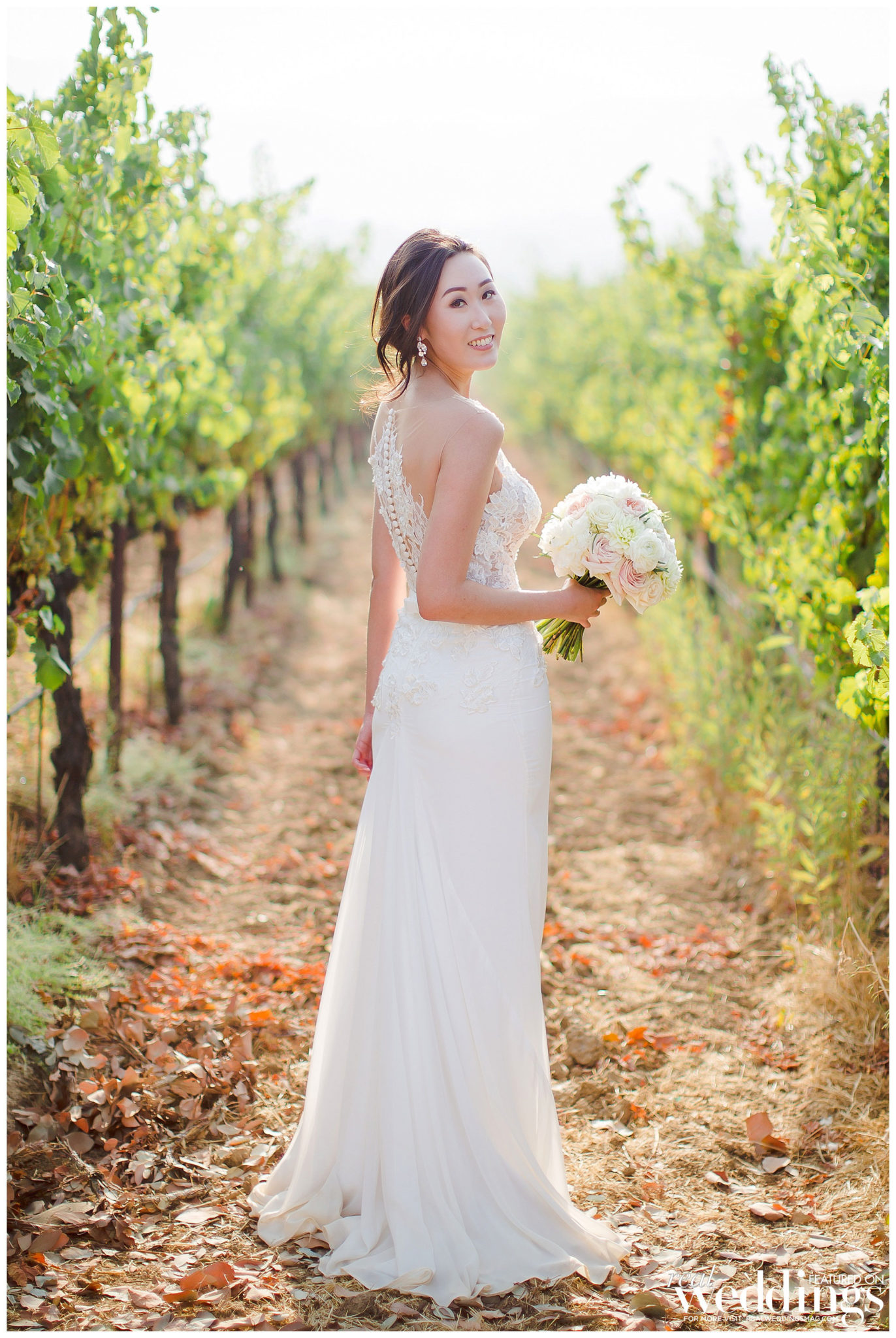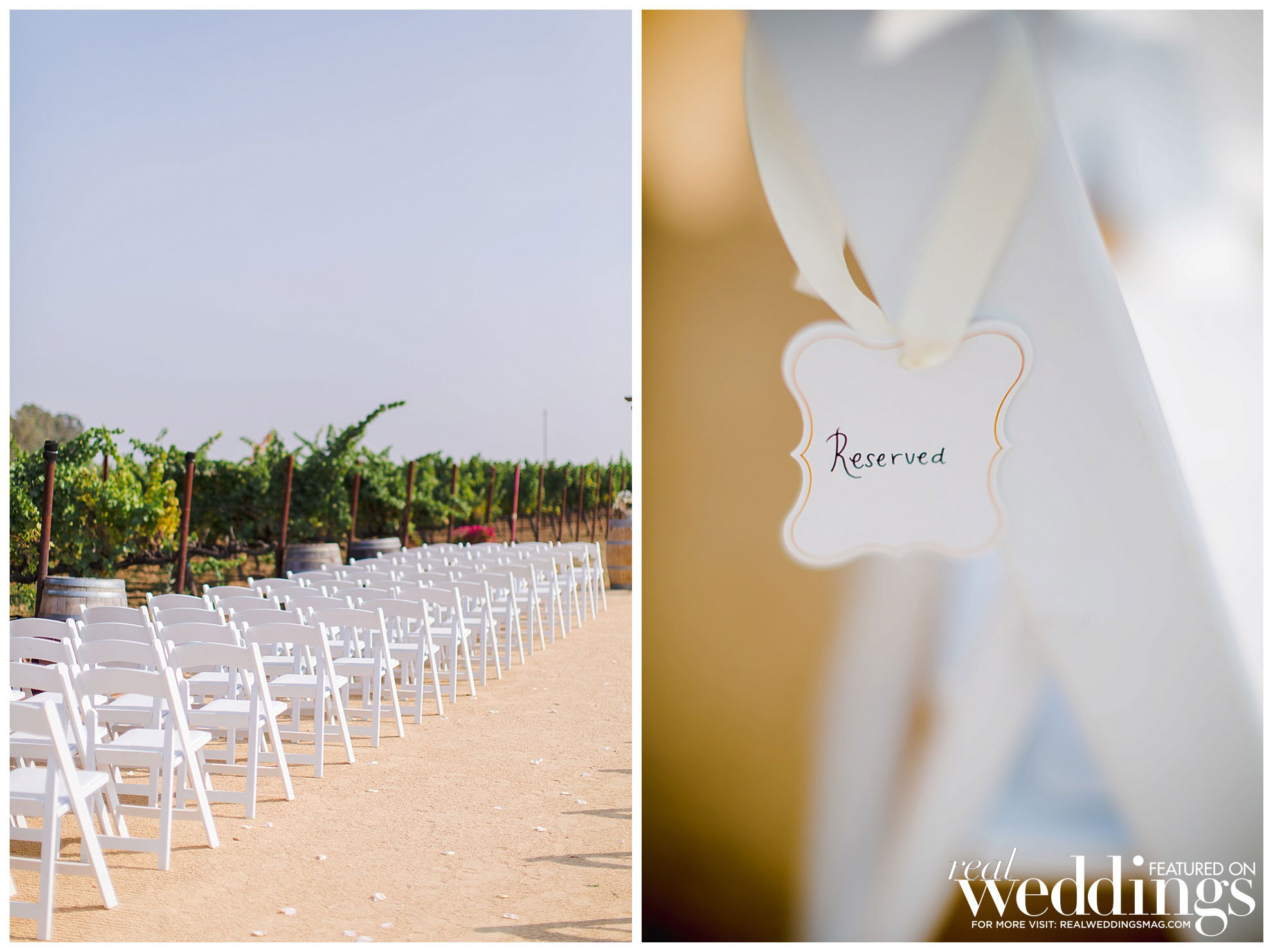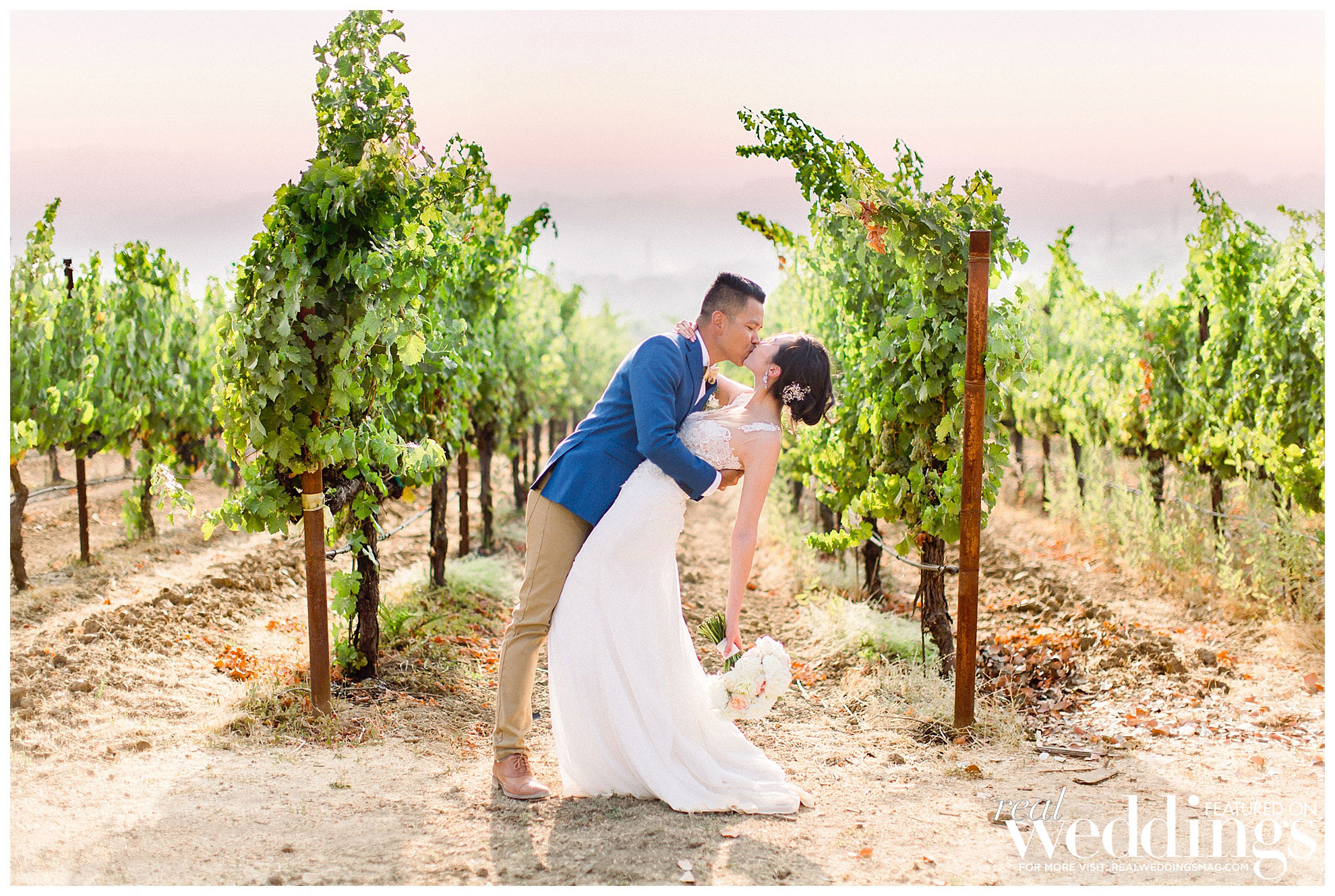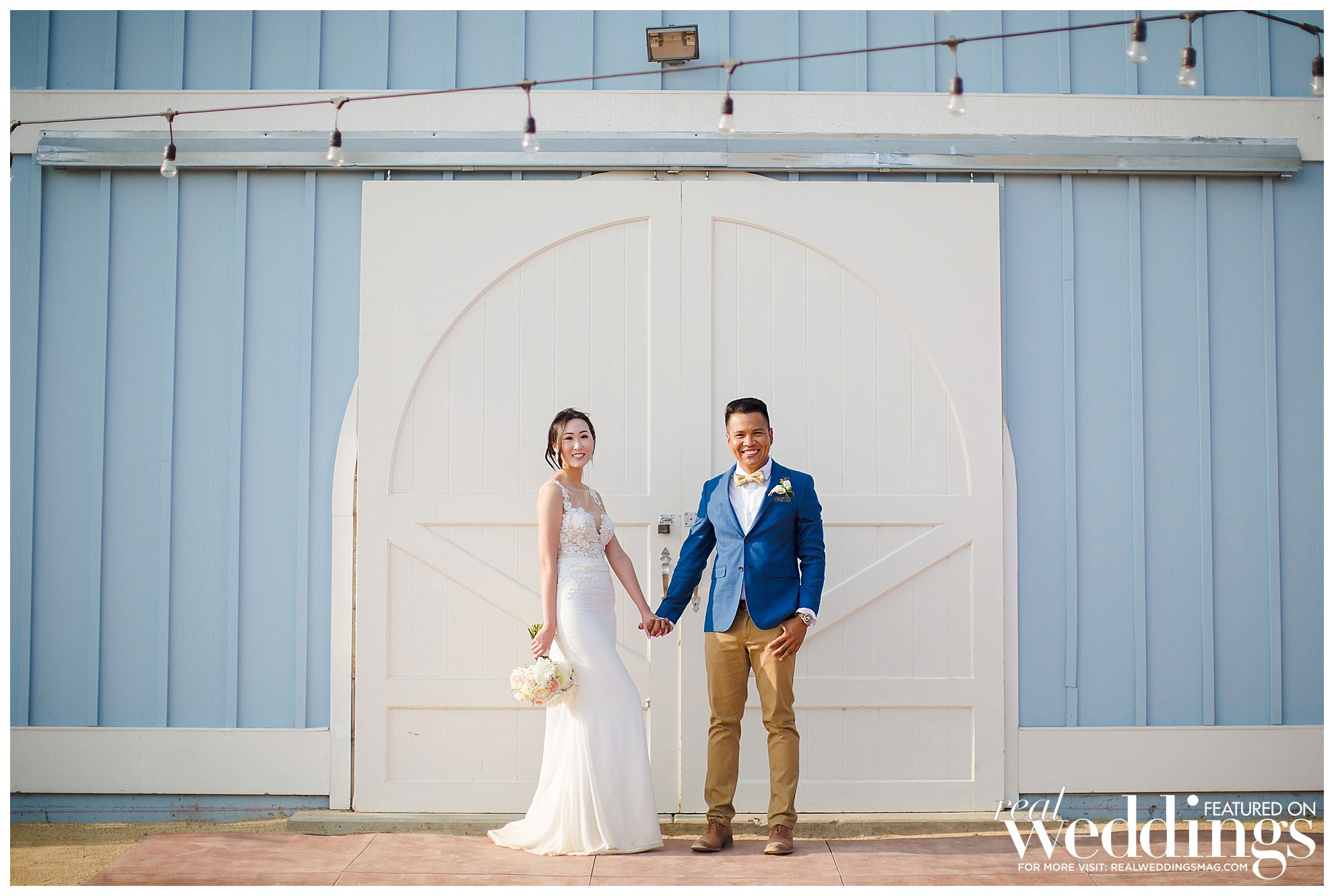 The reception was also held at the vineyard. The couple, both engineers, chose a light color scheme of white and gold, with bits of blush to complement the barrel room’s light blue shade on the outside as well as the lush greenery in the backdrop. They had a traditional Filipino money dance during the reception.