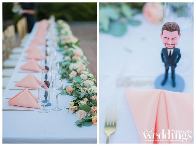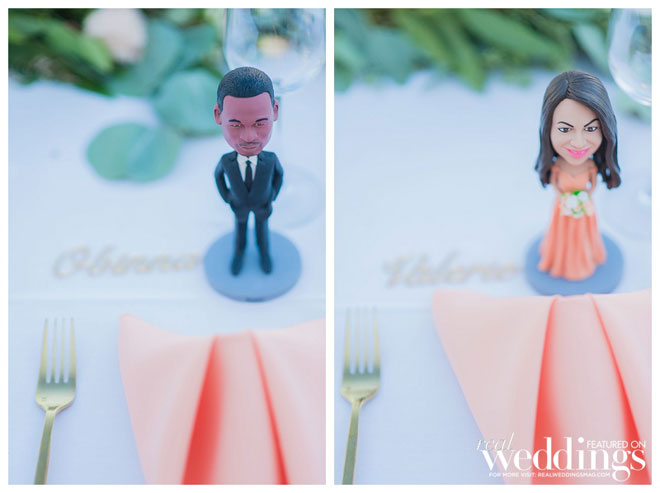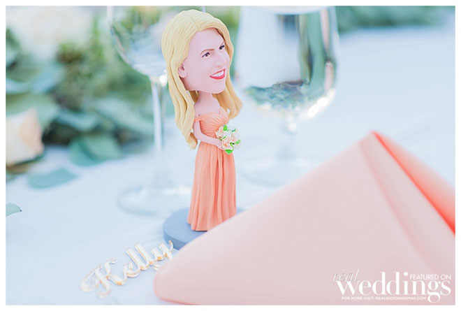 April and Rich decided to have custom bobble heads made of each of their bridesmaids and groomsmen. “We were determined to make these bobble heads resemble our wedding party as much as possible, so there was a lot of back and forth with the bobble head makers,” she says. “They did a great job and it was hilarious to see these bobble heads transform into mini statues of our friends.”