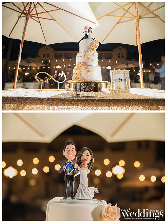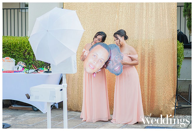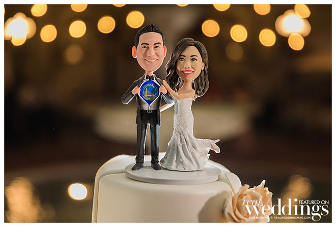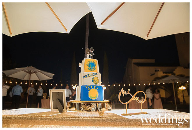 Because of our mutual love for the Golden State Warriors, we also had a Dubs theme sprinkled in to the reception. Our wedding cake was traditional on the front, Warriors themed on the back. Our cake topper was bobble heads of ourselves – April in her wedding dress, Rich in a tuxedo holding his dress shirt open with a Warriors t-shirt underneath. Big heads of Steph Curry and Draymond Green were some of the props in our photo booth.