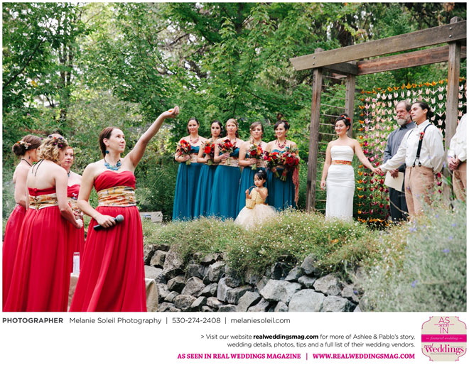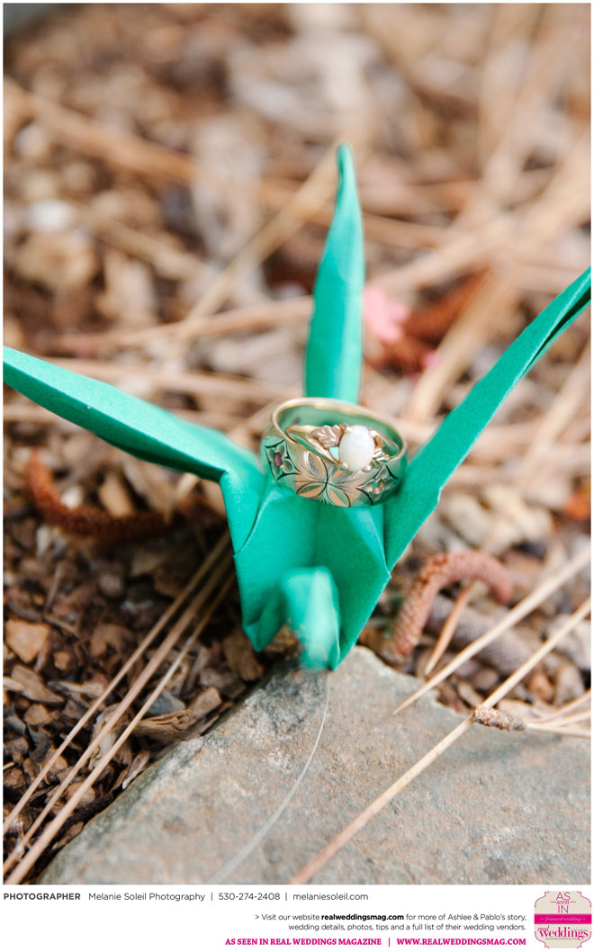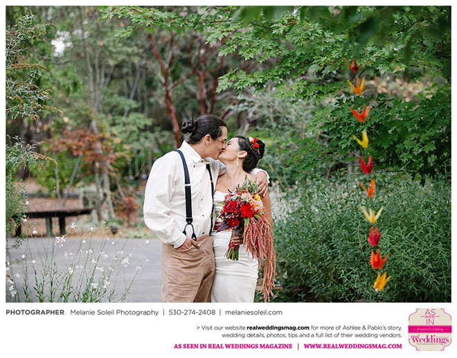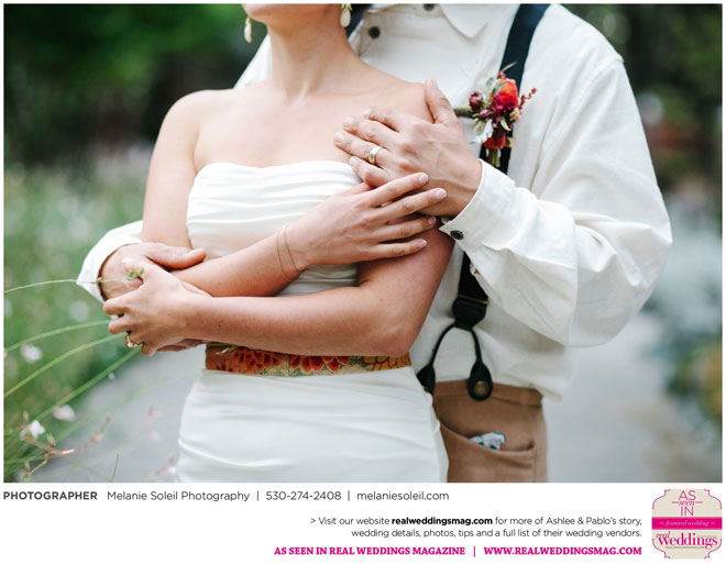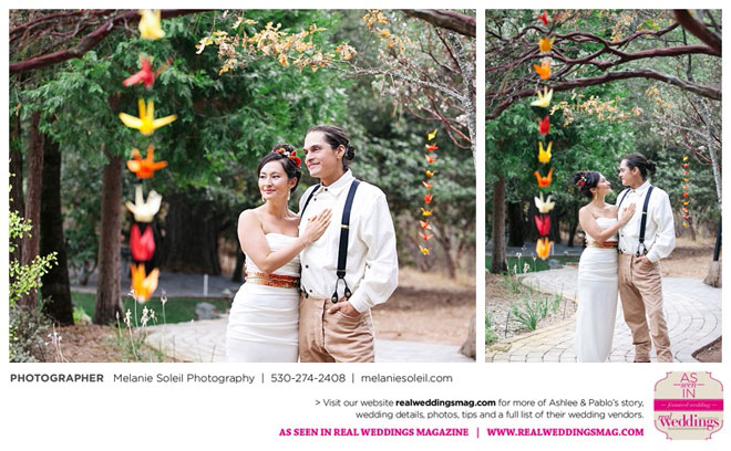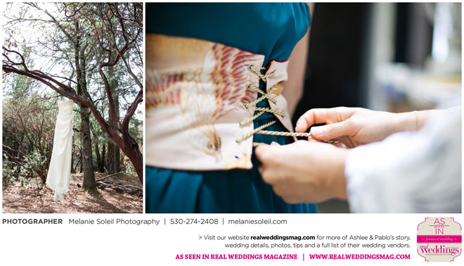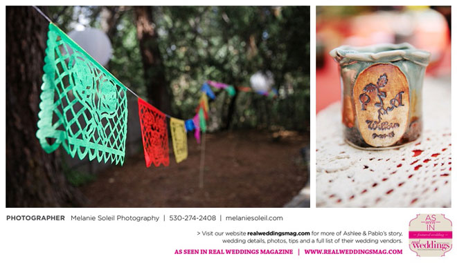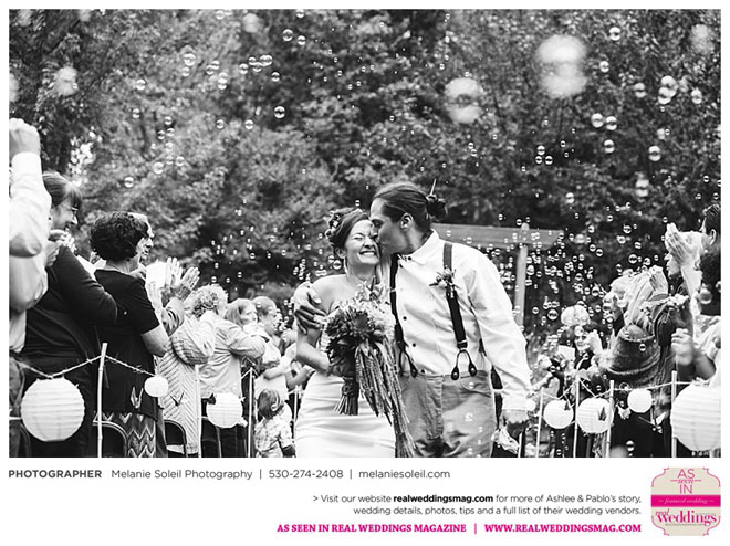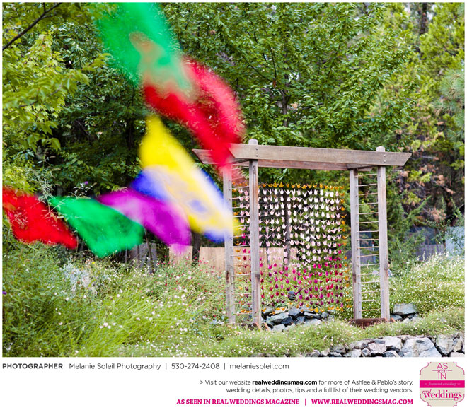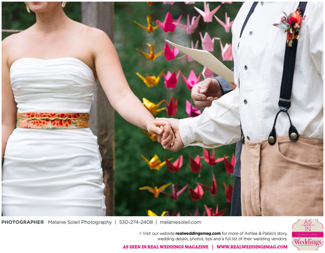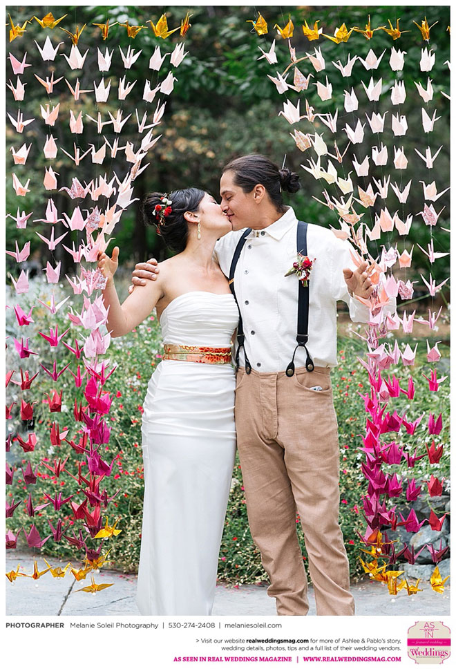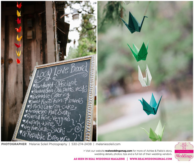 While they sat on a marble seat watching the sun set during a hike to the Yuba River three years later, Pablo gave her a ring made of wild oats and asked her to marry him. She said yes, of course. For their Japanese-Mexican fusion wedding, Ashlee spent six months ordering papel de picardo flags, folding origami cranes with the help of friends and family, designing ceramic wabi sabi teacups for wedding favors and making seed bomb favors, among other things. For his part, Pablo rounded up kegs from Ol’ Republic Brewery, and he and his best man made an arch for the ceremony, with redwood lumber from his friend’s parents’ old deck.