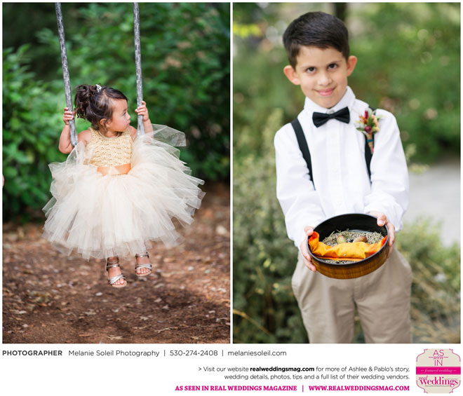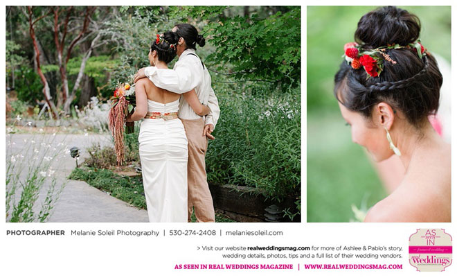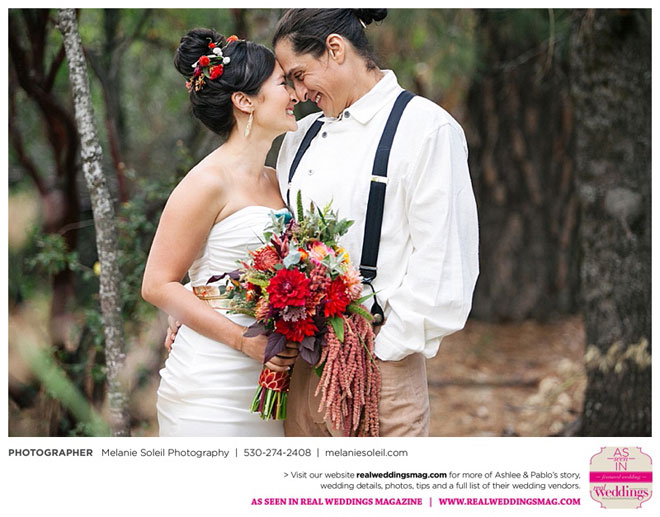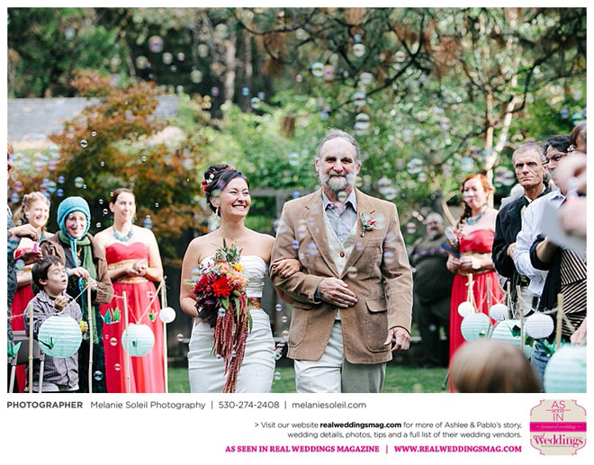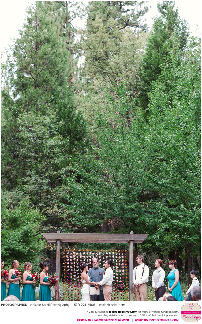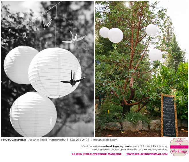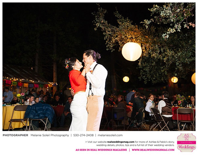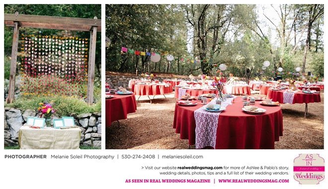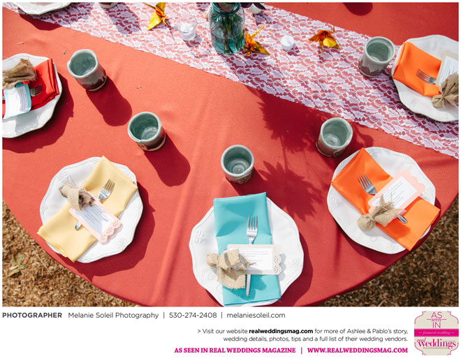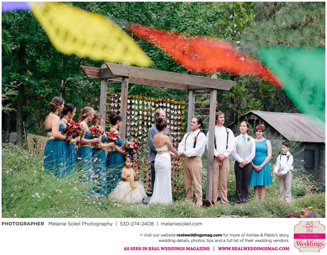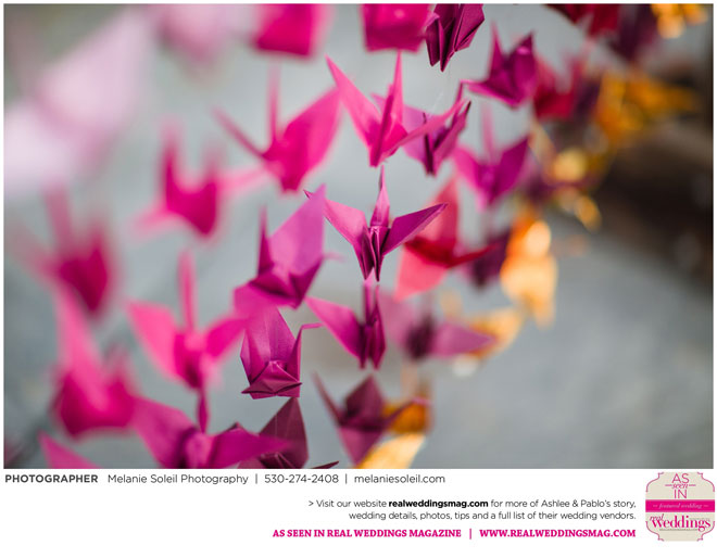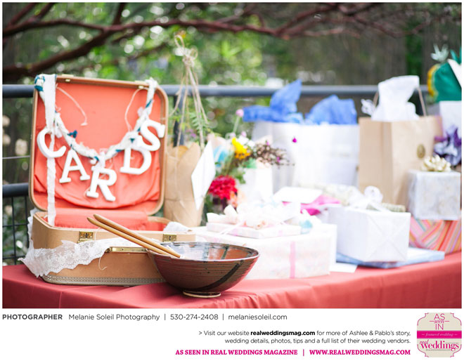 While they sat on a marble seat watching the sun set during a hike to the Yuba River three years later, Pablo gave her a ring made of wild oats and asked her to marry him. She said yes, of course. For their Japanese-Mexican fusion wedding, Ashlee spent six months ordering papel de picardo flags, folding origami cranes with the help of friends and family, designing ceramic wabi sabi teacups for wedding favors and making seed bomb favors, among other things. For his part, Pablo rounded up kegs from Ol’ Republic Brewery, and he and his best man made an arch for the ceremony, with redwood lumber from his friend’s parents’ old deck.
