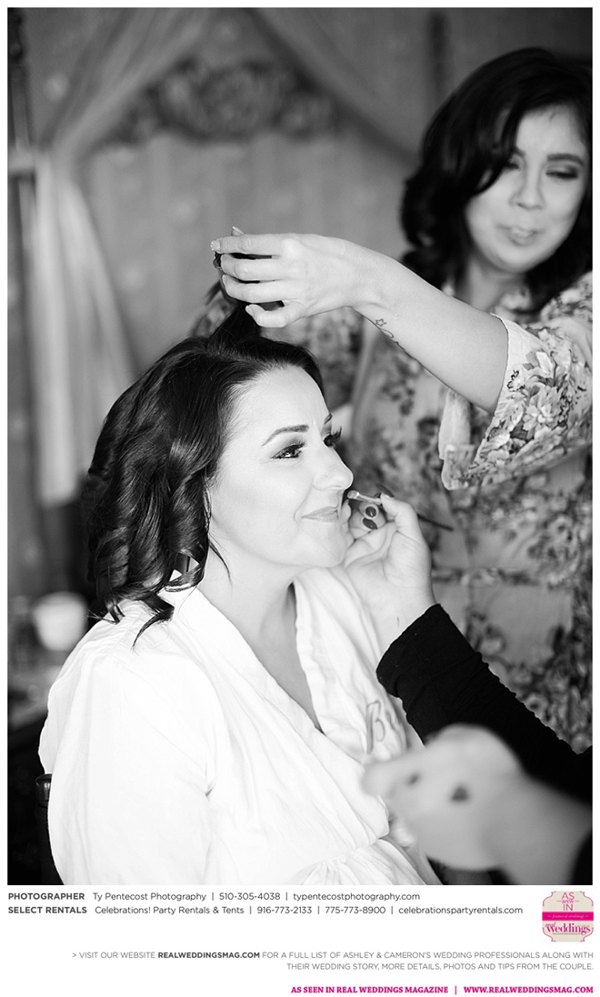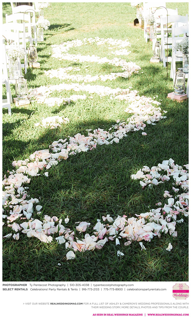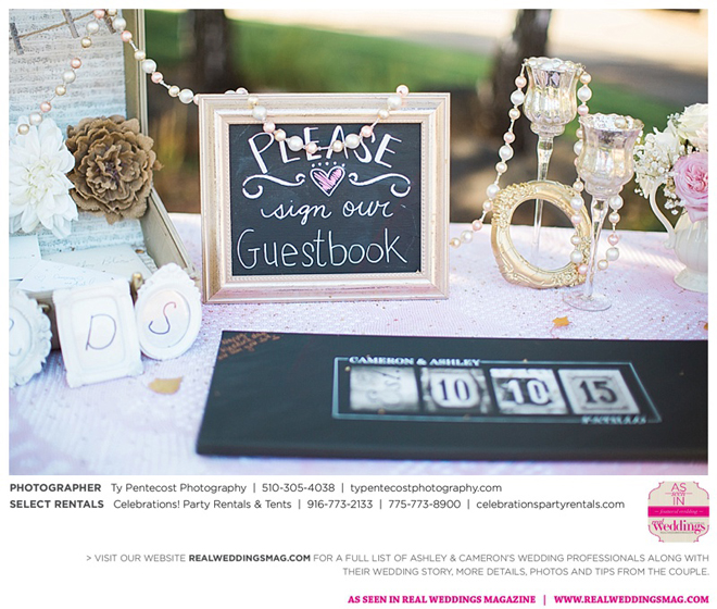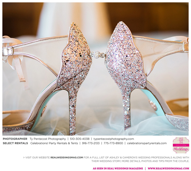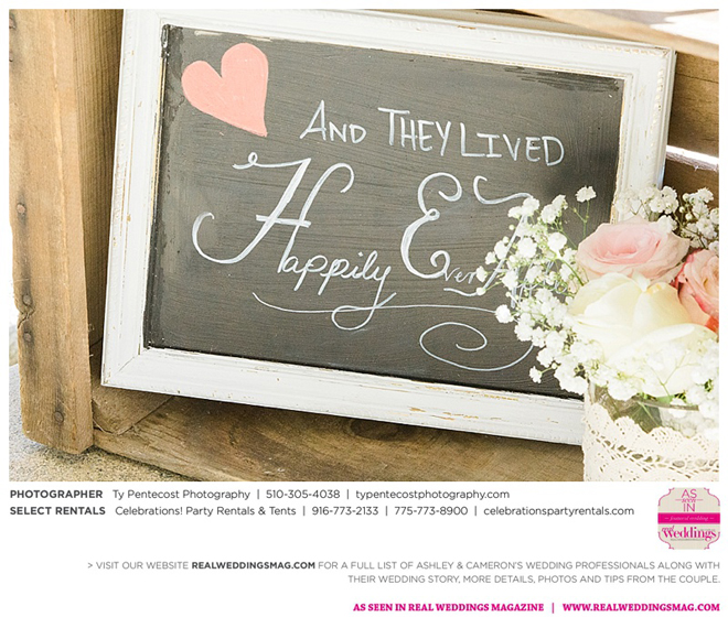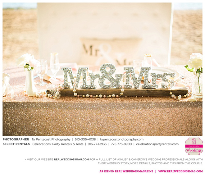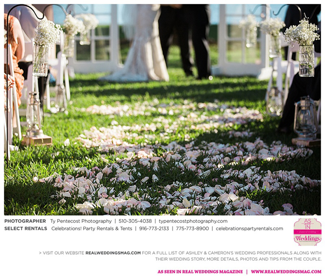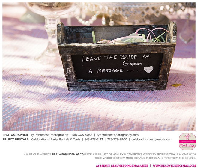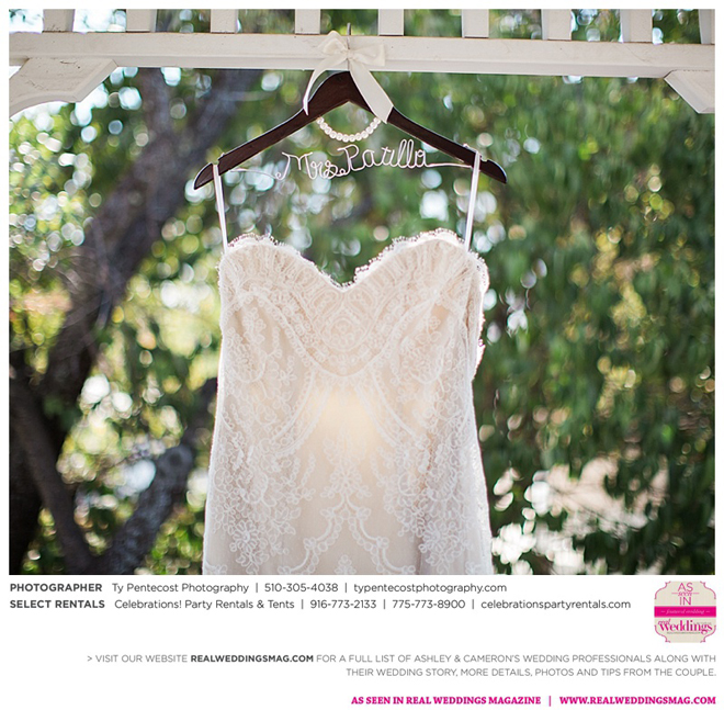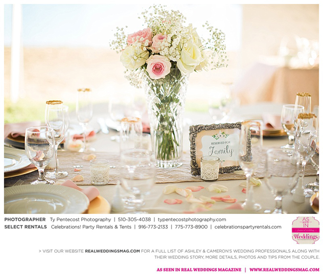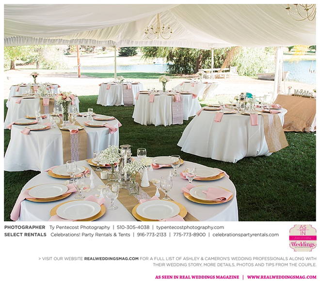 Vintage and a little rustic, their wedding had undertones of blush, nude, gold and silver, alluding to a romantic vibe. “I was my own wedding planner!” says Ashley proudly. From finding the caterer and photographer, to picking out the flowers and chandeliers in the tent, she did it all, with a little help from family and friends along with wedding stylist, Ramona Arnold from Simple Country Weddings and Vintage Decor Rentals. Special touches included custom-made benches as a “thank you” to both sets of parents, and lace on Ashley’s bouquet from the wedding gown of her maid of honor’s mother, who had passed away from breast cancer.