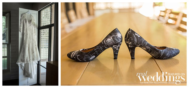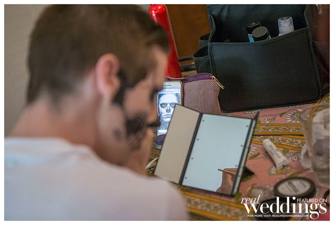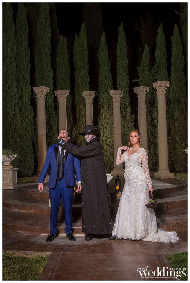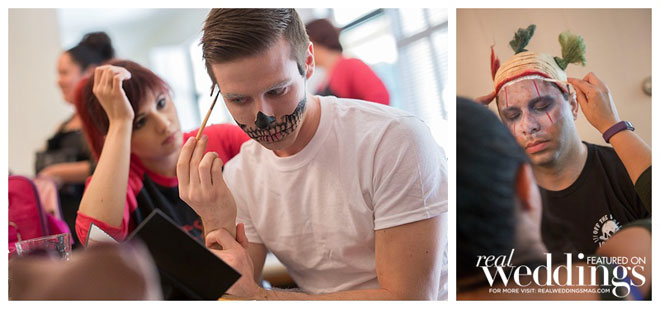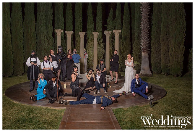 More than 100 guests attended the wedding. They were told to dress in black. When the couple explained their theme, guests got excited. “We had people we didn’t even know tell us they wanted to come because they thought that theme was cool,” says Ashley, who thinks the biggest challenge of the theme was getting the whole wedding party, who lived in several different states, to get or make their costumes in time.