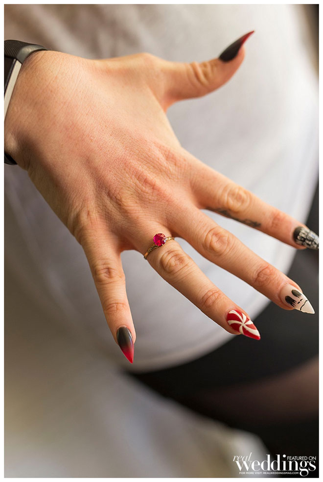 “I describe my dress as a Morticia Addams meets bridal,” says Ashley of her ivory, beaded lace fit-andflare gown. She accessorized with her mother’s pearl earrings, a crow skull hair clip, a family ruby ring passed down generations from the 1800s, and a new Irish Claddagh ring that Jordan gave her as a wedding present.