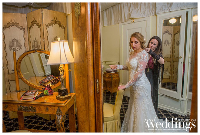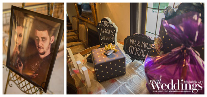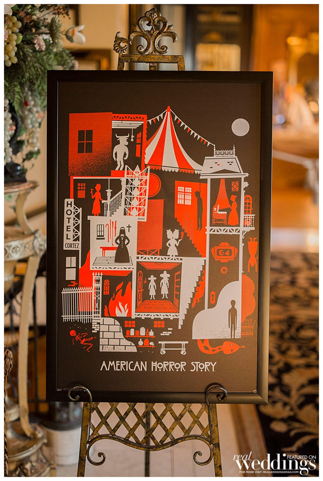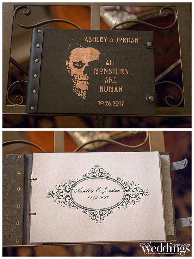 Ashley and Jordan wanted a fun theme for their wedding. The couple, who met through mutual friends, love cosplay (dressing up as fictional characters) and going to conventions. “We thought of having our own season of American Horror Story,” says the bride, noting that she and her groom are fans of the hit TV series.