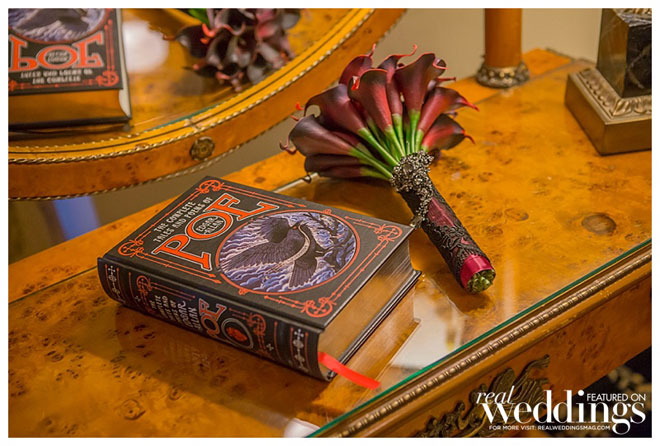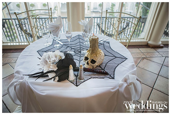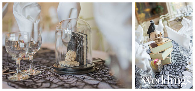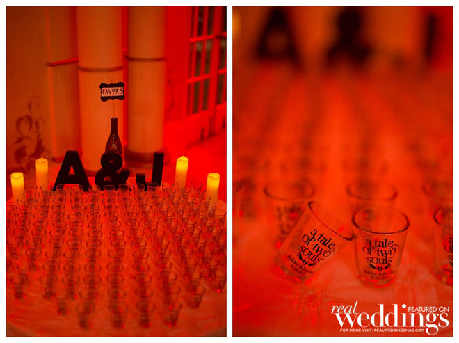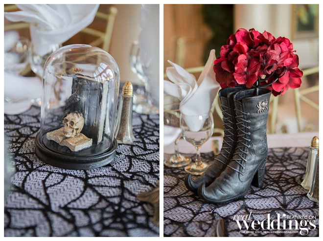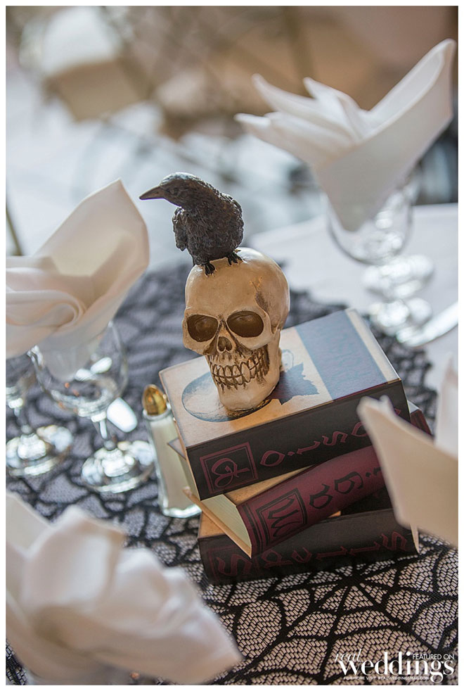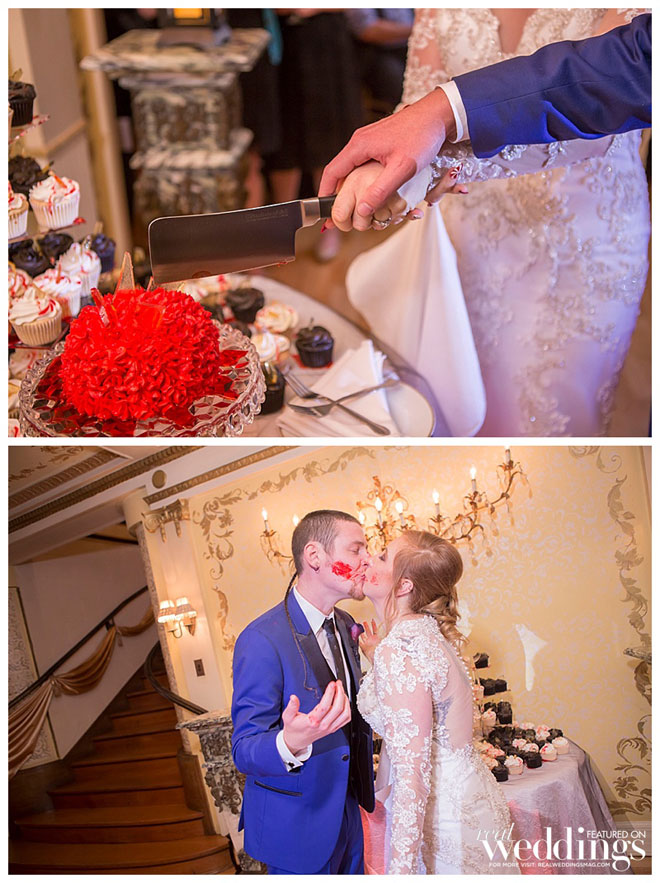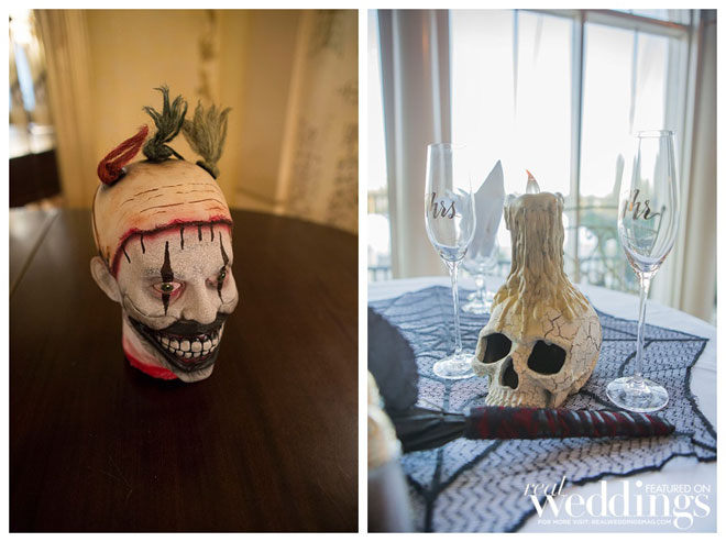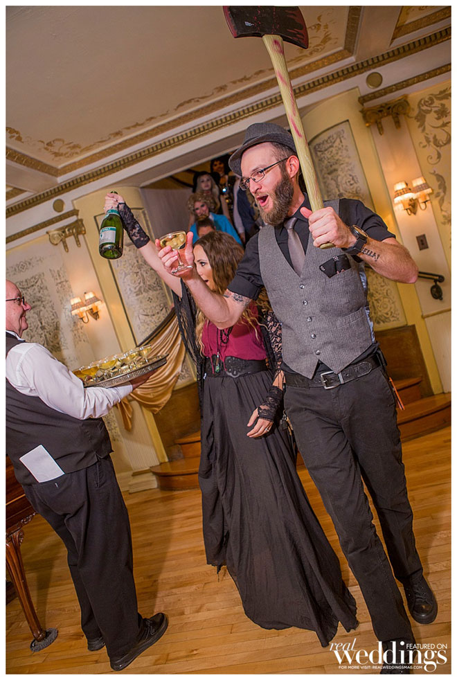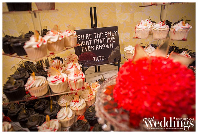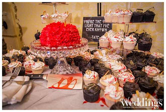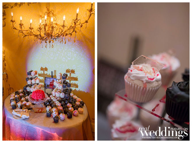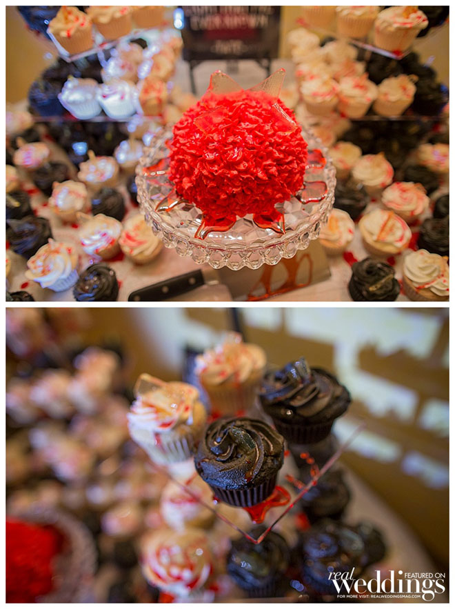 Following dinner, guests enjoyed cupcakes that had “blood spatter”—frosting made of corn syrup with some sugar glass shards. The cutting cake, which was used as a centerpiece, had blood red frosting on it. “We cut the cake with a meat cleaver, and when we cut into it, it bled,” says Ashley.