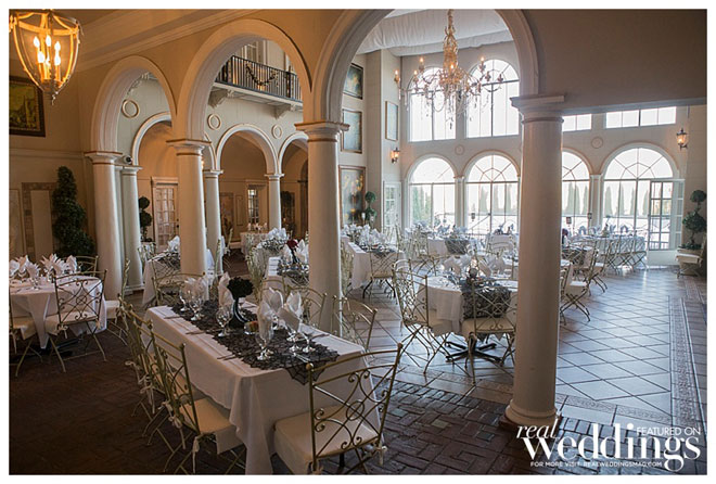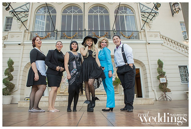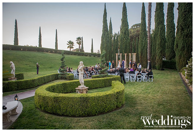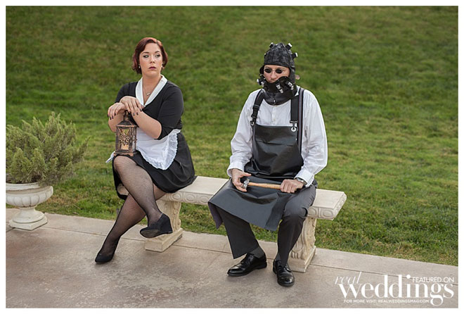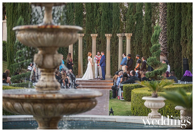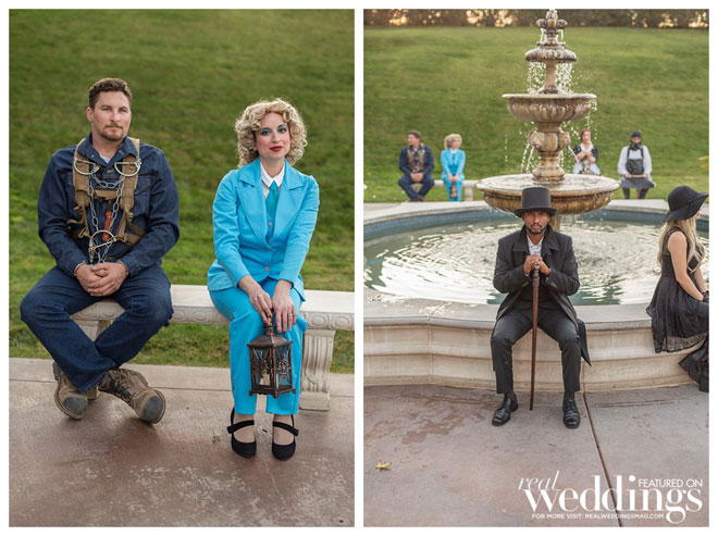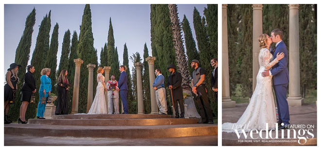 The ceremony was held outside in front of the mansion. The wedding party, wearing their costumes, sat around a huge fountain, causing guests to question what was going on. It was all a part of the theme.