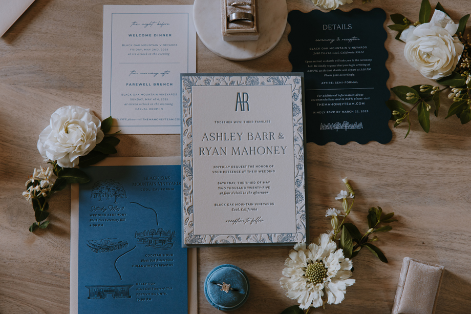 While planning our wedding, we were committed to creating a perfect day—especially with Ashley’s perfectionist nature. From the start, we envisioned draped pergolas and navy blue lampshades as focal points, aiming to evoke an upscale, timeless sense of sophistication. At the same time, we knew that flexibility would be essential, as unexpected circumstances can always arise. For example, although we initially didn’t want a clear tent for the celebration, choosing a clear-top tent turned out to be a wonderful decision due to the surprise weather. It allowed us to host the reception on the driveway while still offering expansive views, enhancing the overall experience at Black Oak Mountain Vineyards. Amy (our planner), Elissa (our floral designer), and the entire vendor team did a phenomenal job adapting to the changes and seamlessly integrating the tent into the landscape in a way that still reflected our original vision.