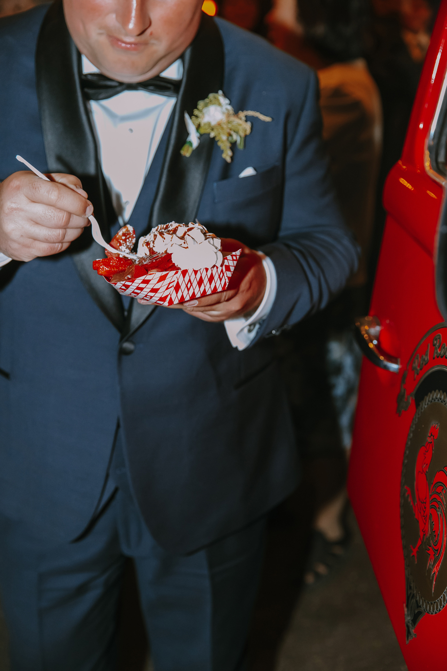 Right after the cake cutting, we surprised everyone with a special treat—a grand reveal of one of our favorite vendors, VolksWaffles. Terry, the owner, was serving up mouthwatering Belgian waffles topped with sugar crystals, fresh strawberries, chocolate, and ice cream. Guests lined up excitedly to customize their sweet treat just the way they wanted. The funniest part? Ryan’s fire chief, without hesitation, sprinted to be first in line, making everyone burst out laughing. It was such a lighthearted, unexpected moment that perfectly captured the fun energy of the day.
