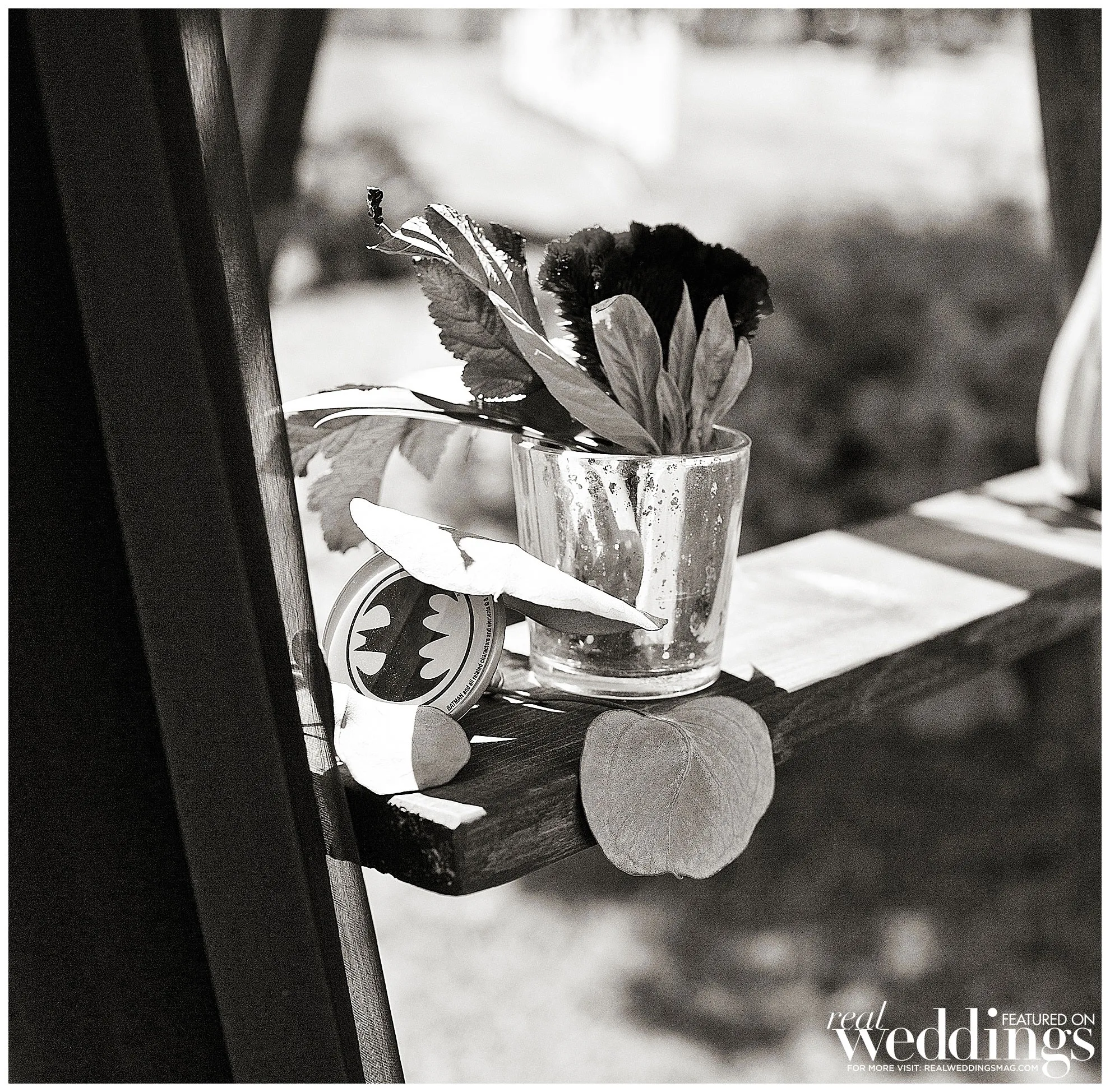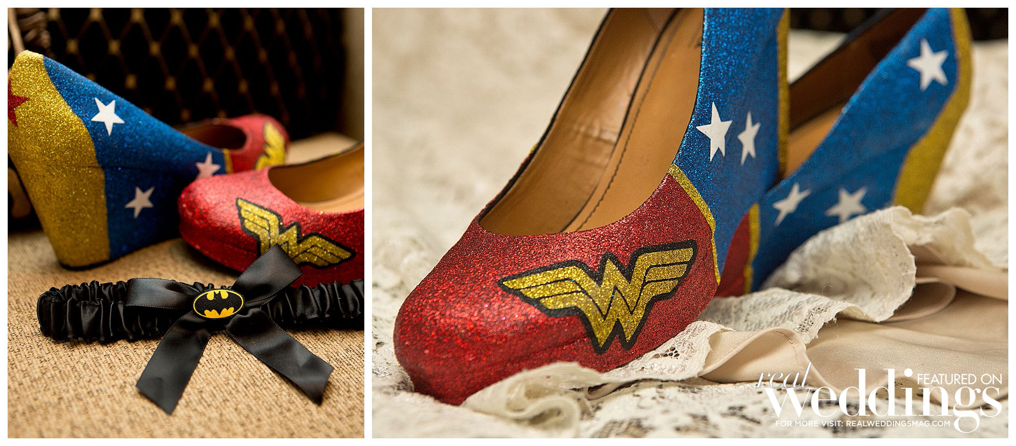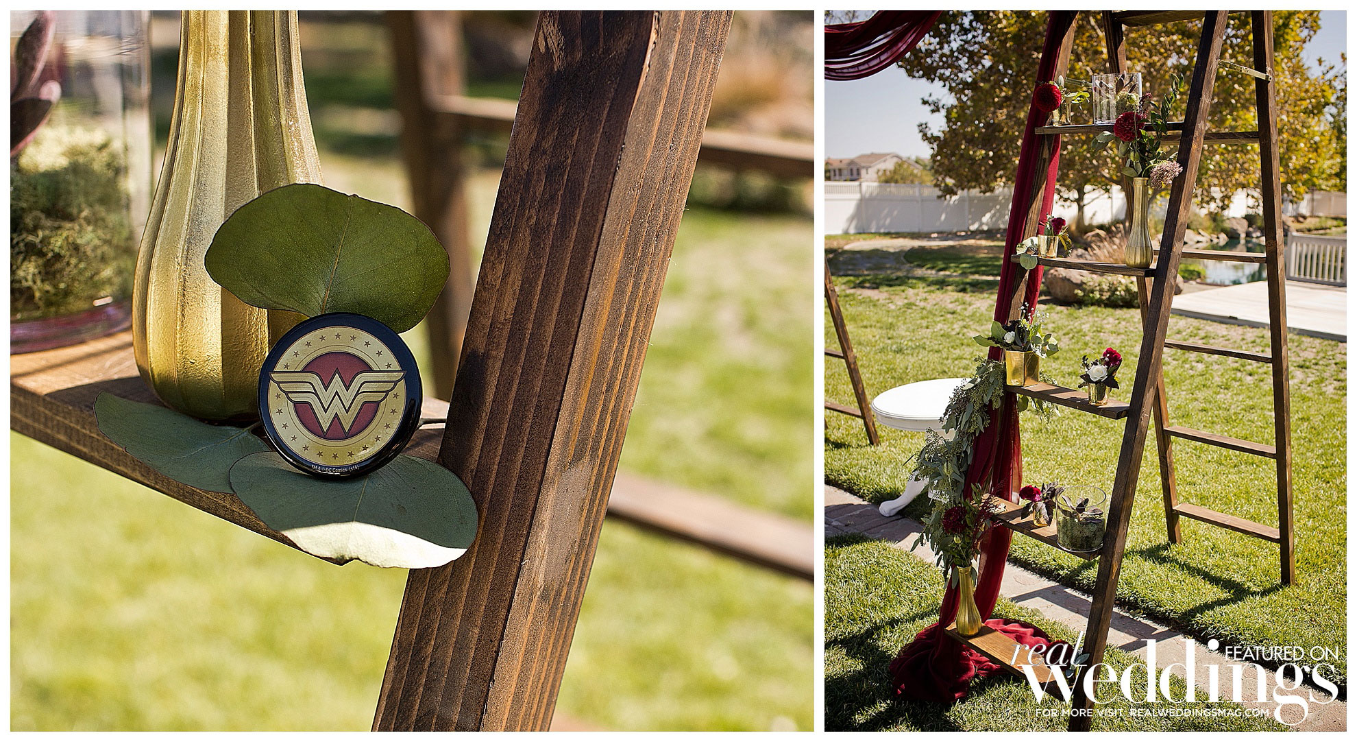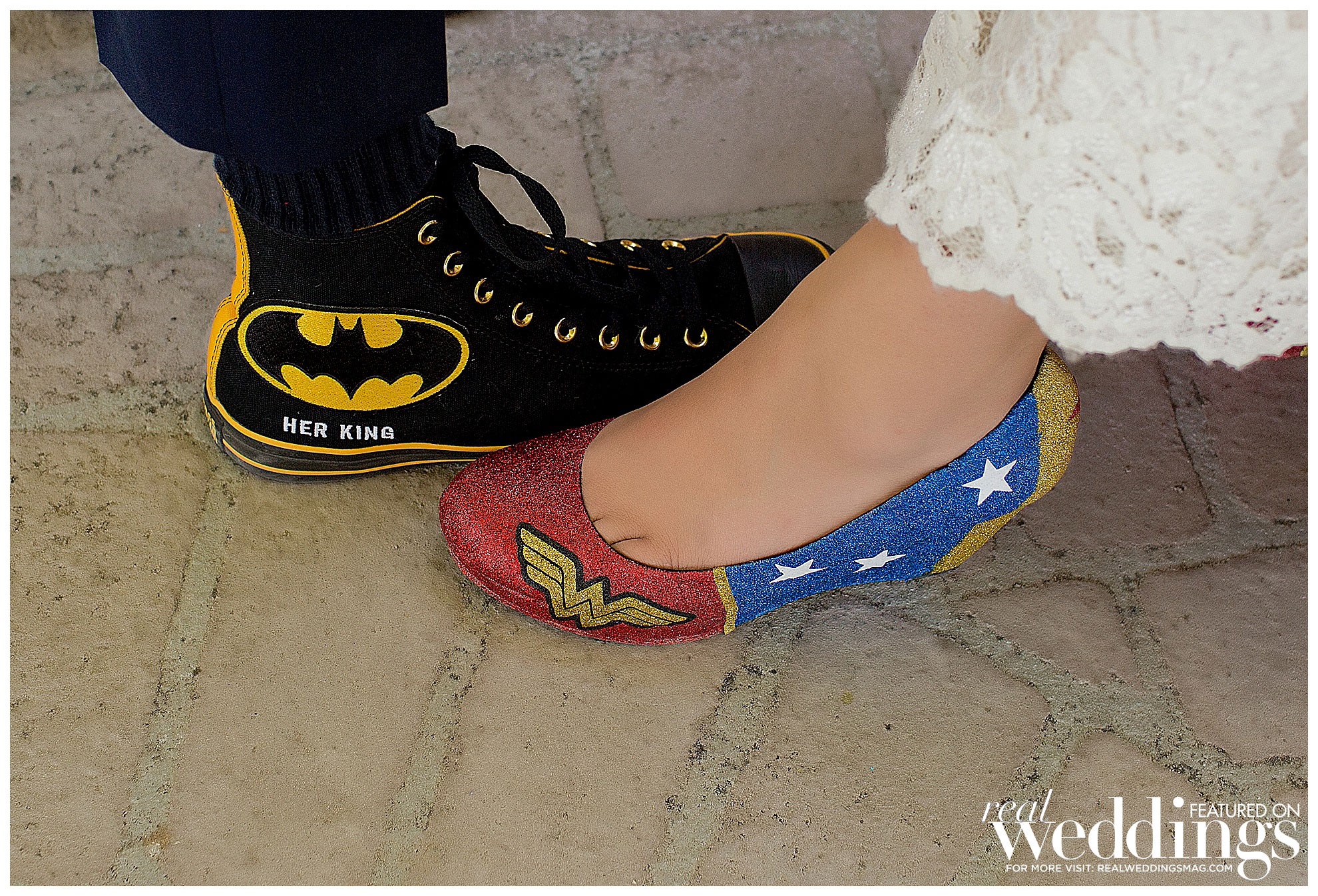 The couple exchanged vows during a sunlit afternoon in the company of their closest friends and family. “Our arch was unique,” Ash says. “We stood under two ladders that were decorated with succulents and two special knobs, one of Wonder Woman and one of Batman. They were small and we doubt anyone saw them but we knew they were there.” The bride also wore glittery Wonder Woman wedges and Sam sported customized Converse with Batman symbols and colors.