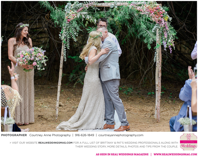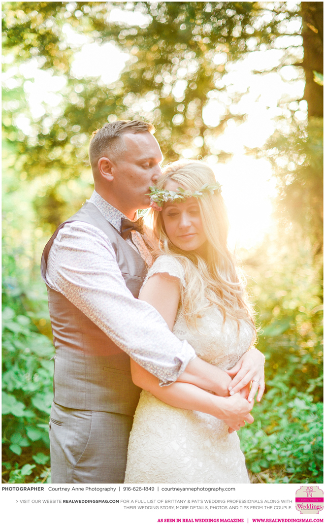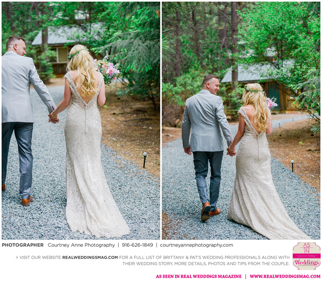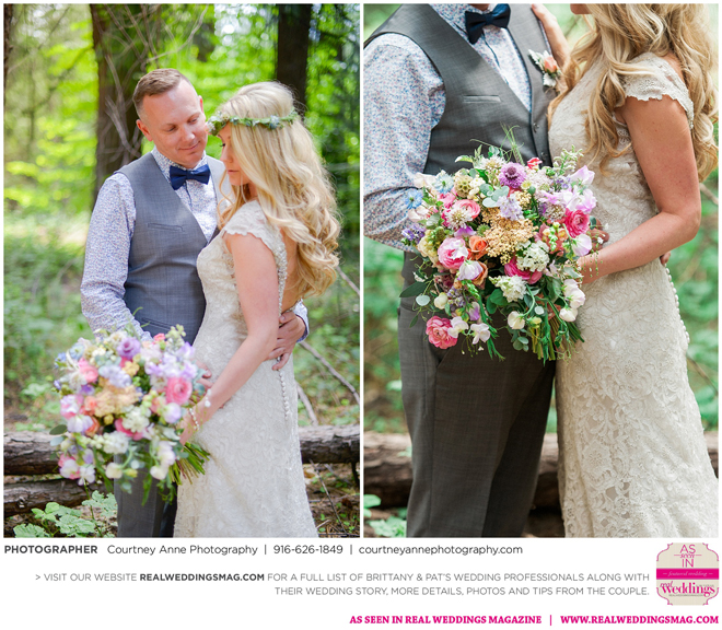 For this couple, it was a magical day filled with special moments. “Pat and I went back down to the ceremony site at sunset to snap a few more photos with our photographer Courtney,” she says. “It was a special moment, we were both more relaxed than earlier in the day, and the lighting was perfect filtering through the trees.”