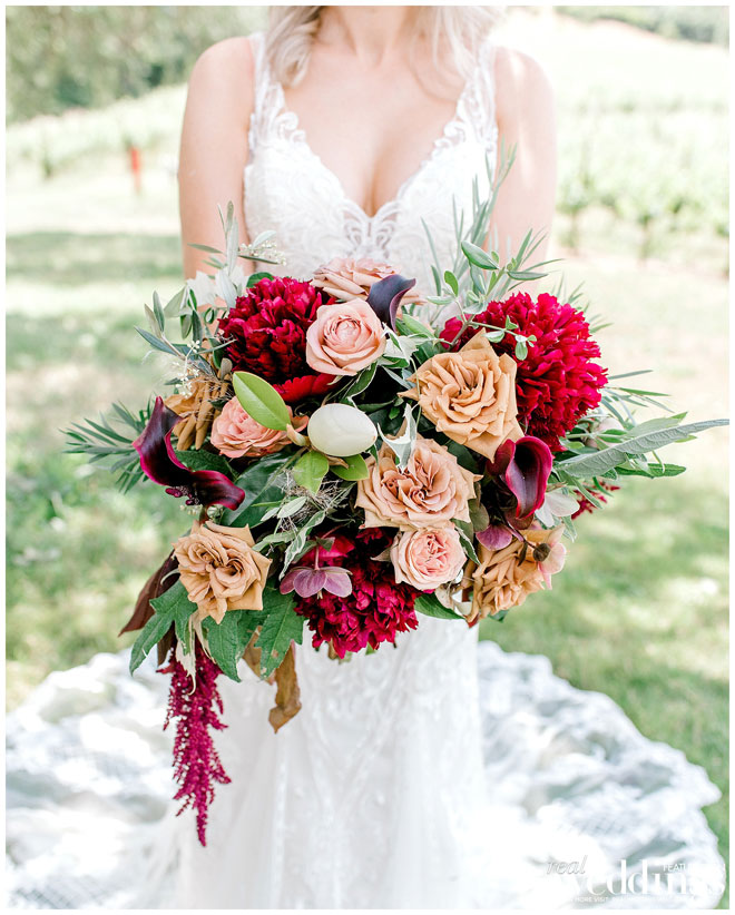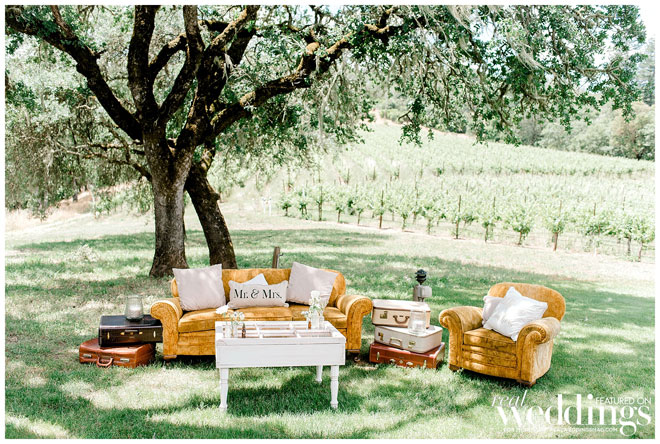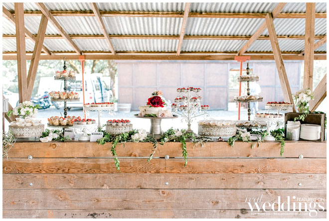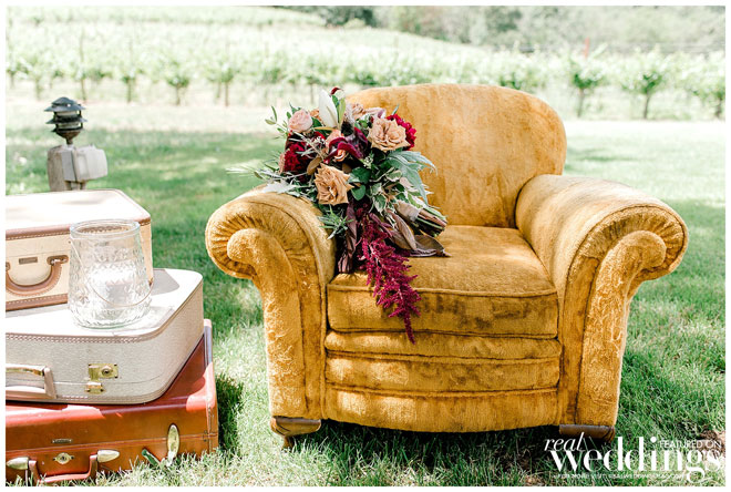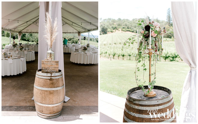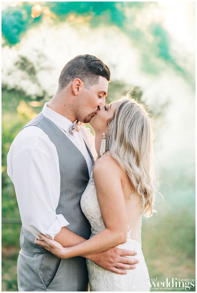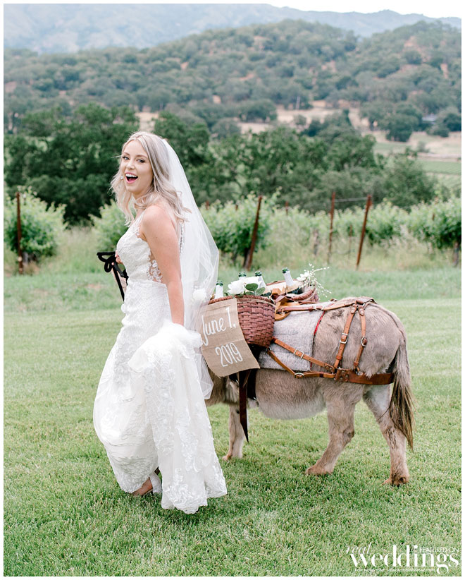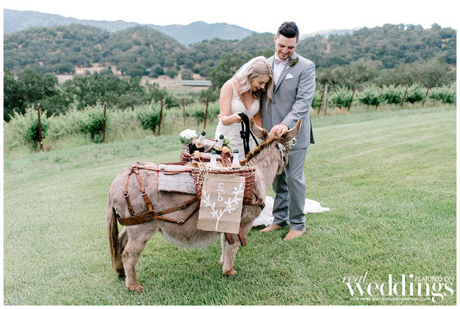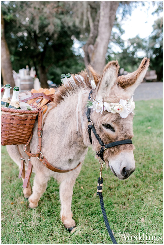 The venue holds many memories for Casey, as he grew up on the property and watched the land evolve into a beautiful setting. The couple chose an Italian rustic theme and loved everything about the day. Their special guest, a burro appropriately named Burrito, made an appearance immediately following the ceremony with sparkling wine for the newlyweds. Brooke and Casey had a moment to sip the bubbly, sit on a vintage couch and watch their guests mingle during the cocktail hour.