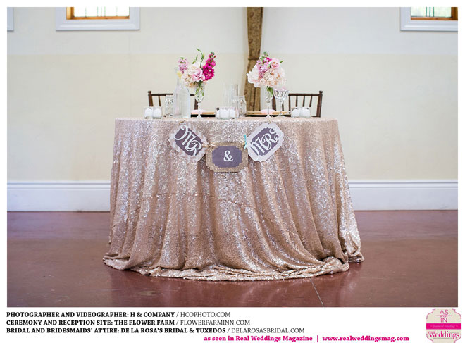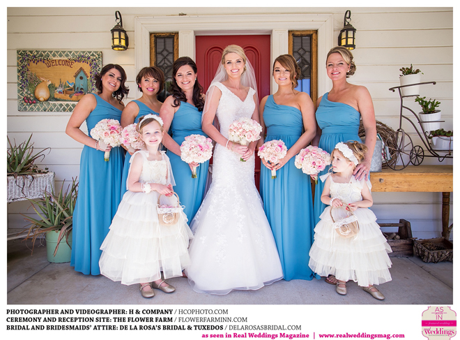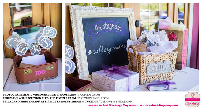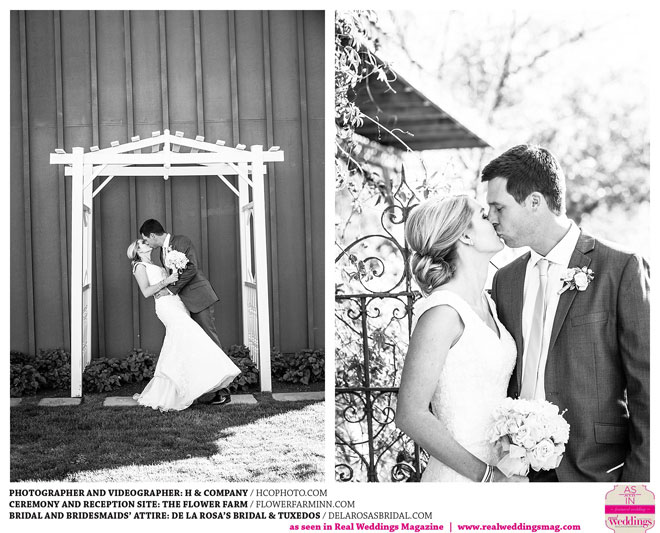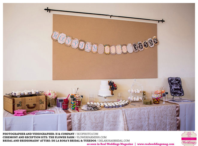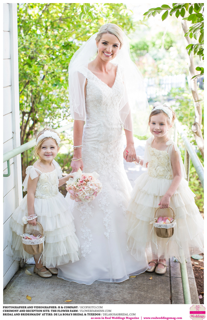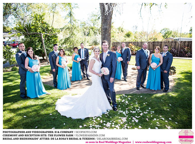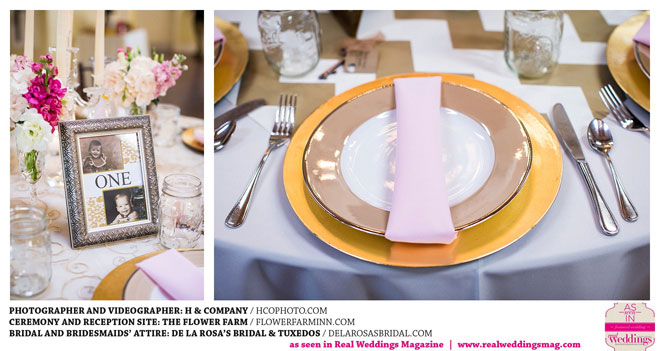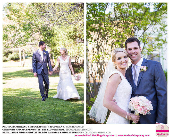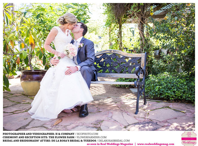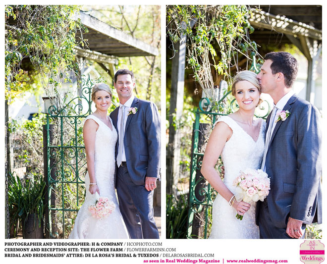The duo opted for a spring wedding at The Flower Farm with a romantic, shabby chic feel. Brooke chose soft pinks, golds, silvers and champagne for her décor and flower colors, while her bridesmaids brought a pop of color with their bright blue dresses. Many guests complimented Brooke, telling her that the wedding looked exactly like something she would pick. To include a touch of Mark, Brooke surprised him with a “groom cake” featuring a Jeep driving up the side (the car he’s had since age 15).
