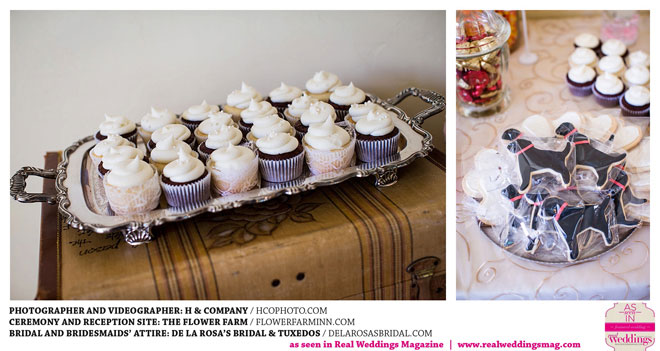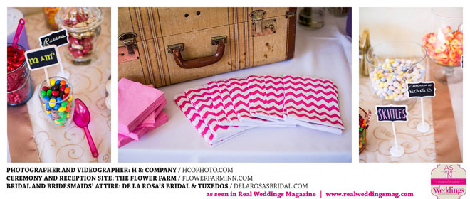 The reception included a candy bar with their favorite confections, vintage key beer openers as “thank-you gifts,” black labrador cookies (to represent their own dog), and pictures of the couple at various ages to correspond with table numbers.