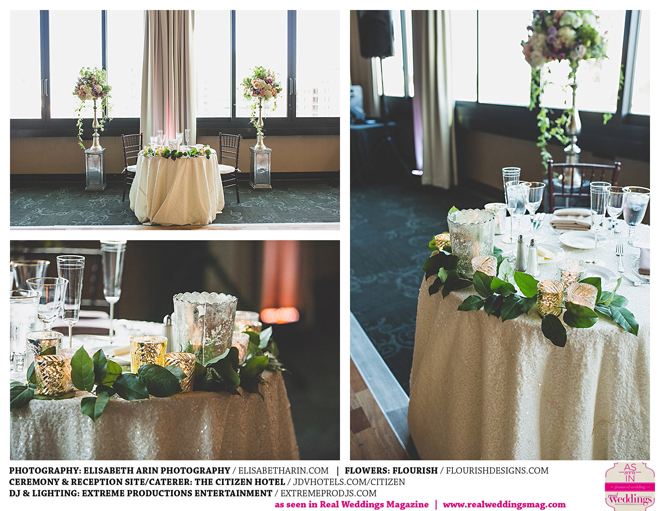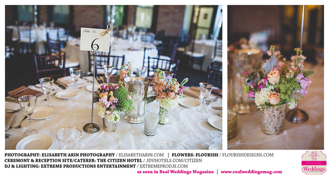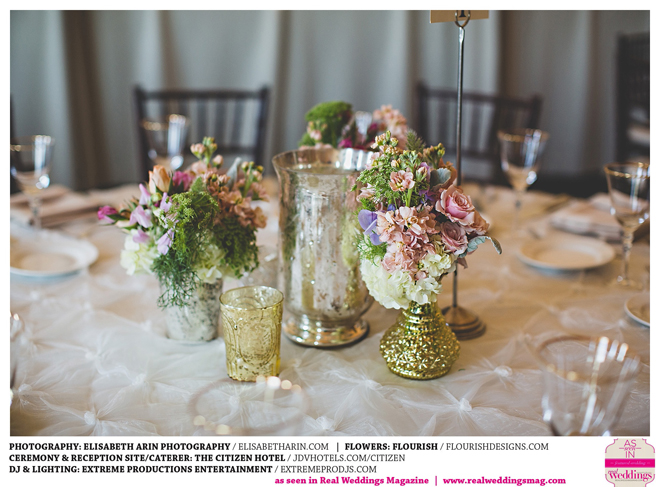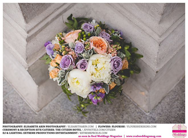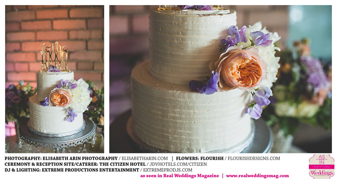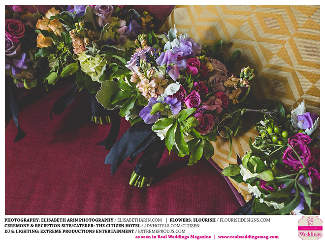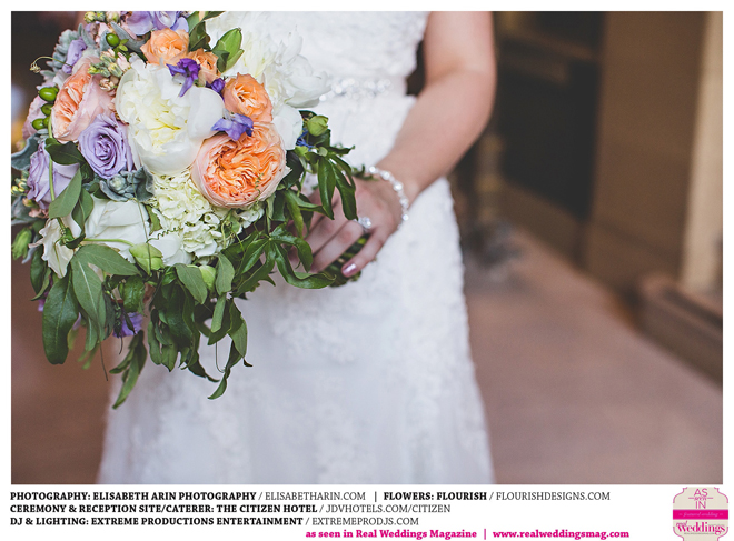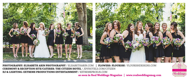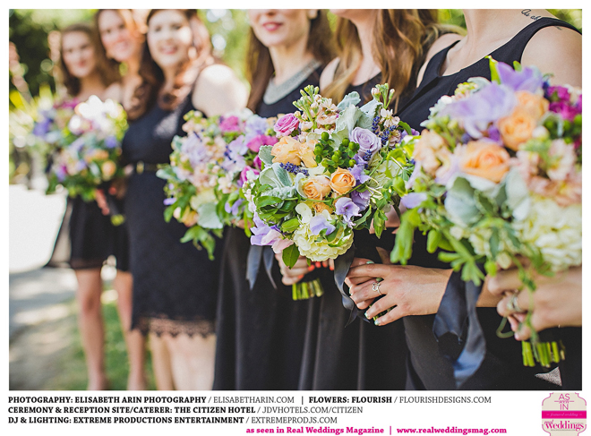 Cait remained flexible—swiftly changing the bridesmaids’ attire to simple black dresses, and relying on brightly colored floral arrangements (lavender, pale pink, coral and bright greens) to bring a pop of color to the event. Their ceremony was a mix of traditional and alternative—getting married by a Catholic priest but outside of the church, and Cait following the family tradition of wearing her grandfather’s Air Force pin on her wedding gown.