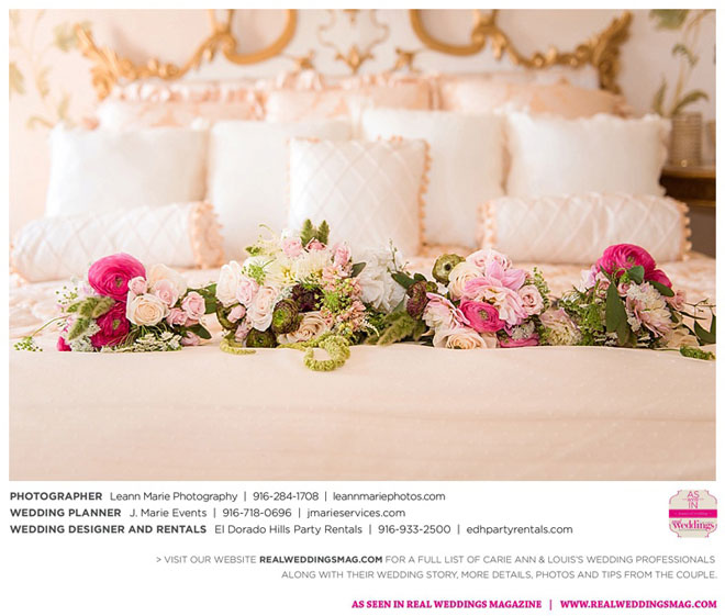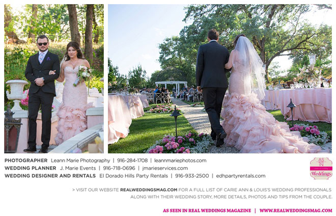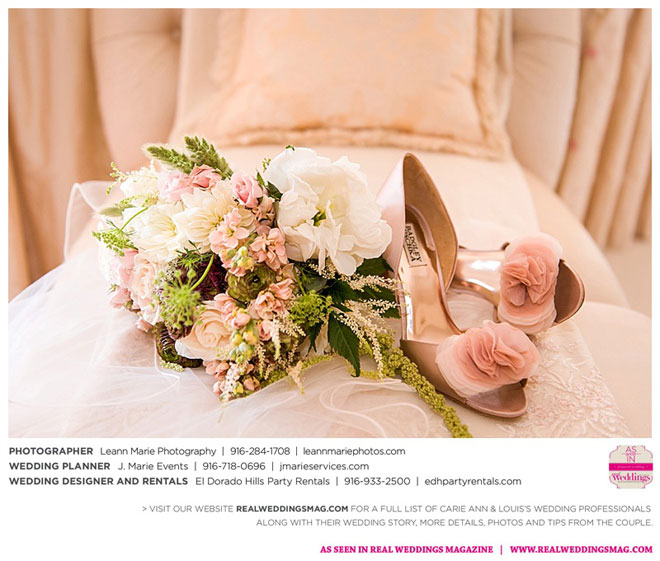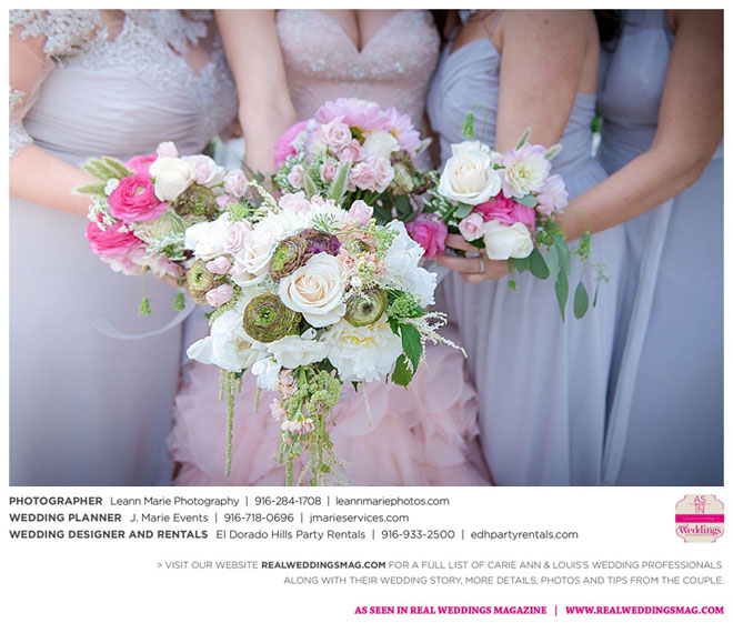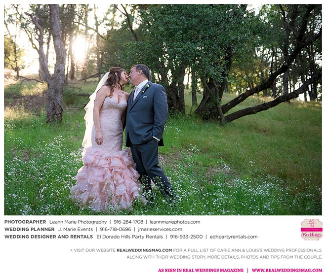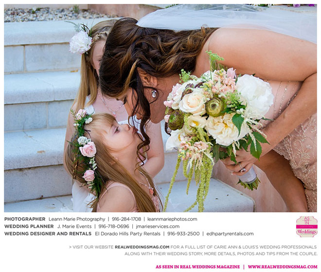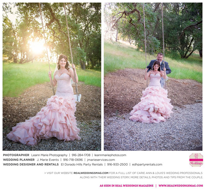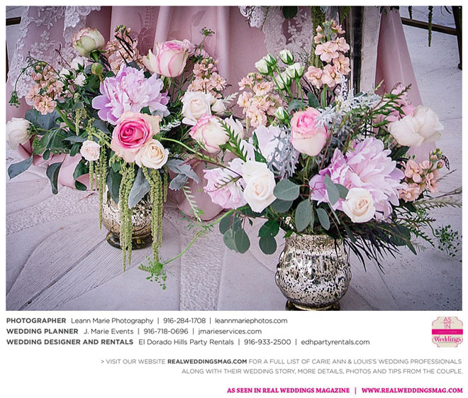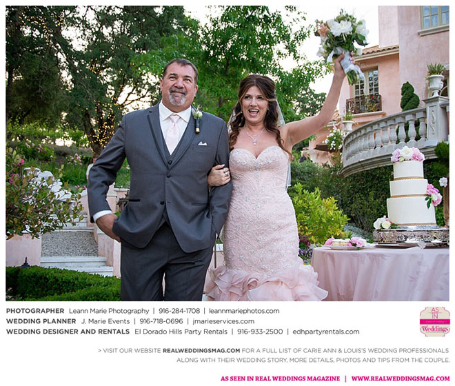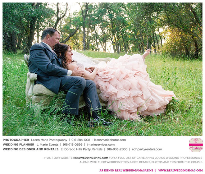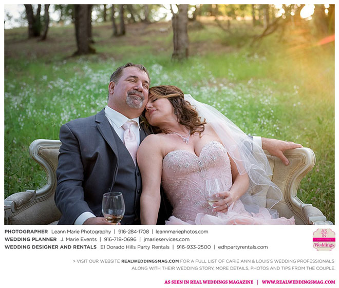 As owner and event design specialist at El Dorado Hills Party Rentals, Carie Ann has an eye for details. For the color palette, she chose blush, ivory, silver and grey. The flowers were her favorite bloom: peonies. Still, being in the wedding industry was a challenge for Carie Ann. Two months before the big day, she realized she needed to make her own event a bigger priority. “I had set my own wedding plans on the shelf,” Carie Ann says, noting she woke up panicked at 3 a.m. Later that day, she called event planner Jordan Brushia, from J. Marie Events, a resource she calls “a lifesaver!”