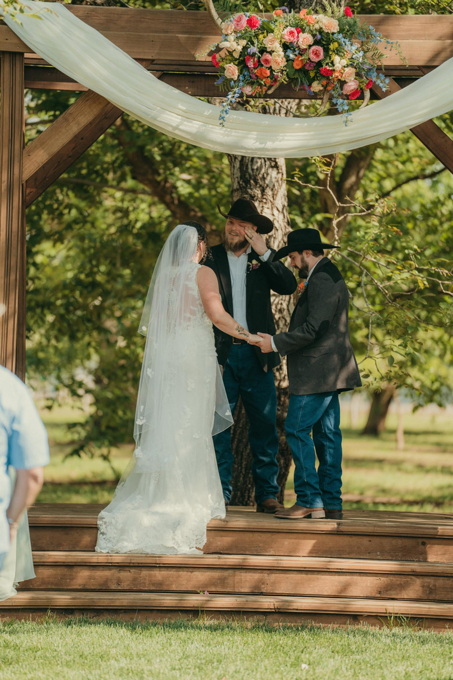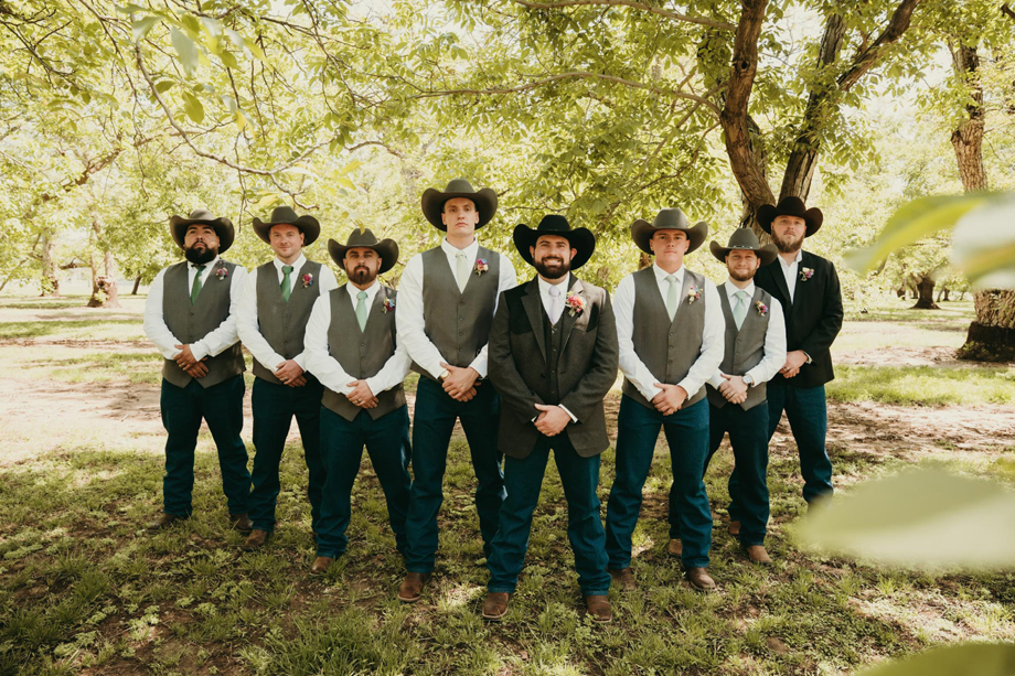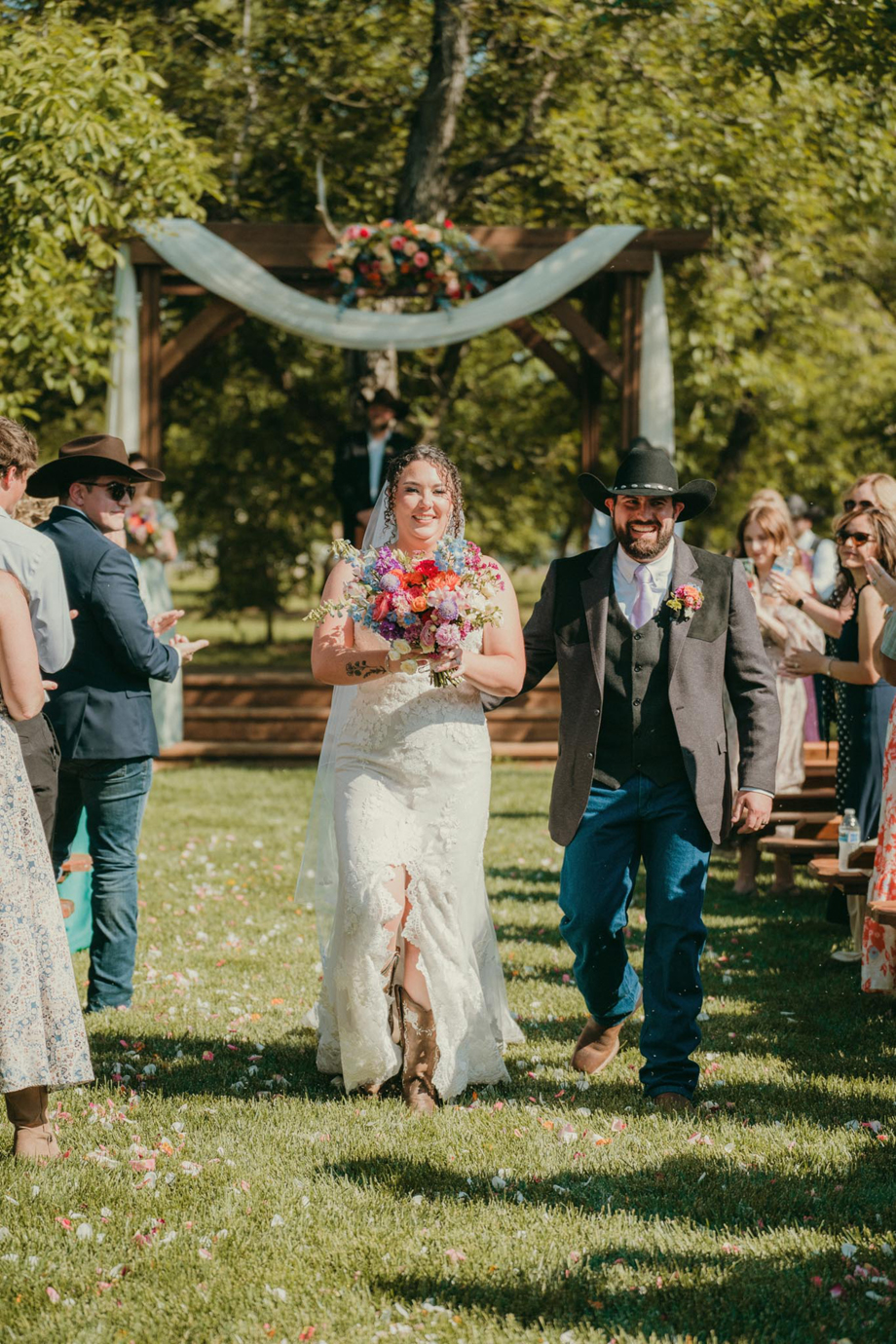 The backdrop of our ceremony was a beautiful green orchard with green grass and blue sky on a sunny and warm spring afternoon. The aisle was lined with rose petals and wild flowers from our and our family members’ gardens. We stood on a raised rustic wooden arbor below an elk shed antler adorned with a variety of colorful wildflowers. We wanted a semi-traditional wedding ceremony with some fun and a country flare to represent our lifestyle values. Caroline wore a white floral laced “trumpet style” dress with a beautiful scalloped lace edge train and added a veil, handmade by her aunt, and white floral laced leather boots. Dustin wore a western style dark charcoal coat and black cowboy hat with blue jeans and leather boots. Our bridesmaids dressed in various shades of sage green dresses with boots, while the groomsmen wore charcoal vests and matching cowboy hats with sage green ties, blue jeans, and boots.