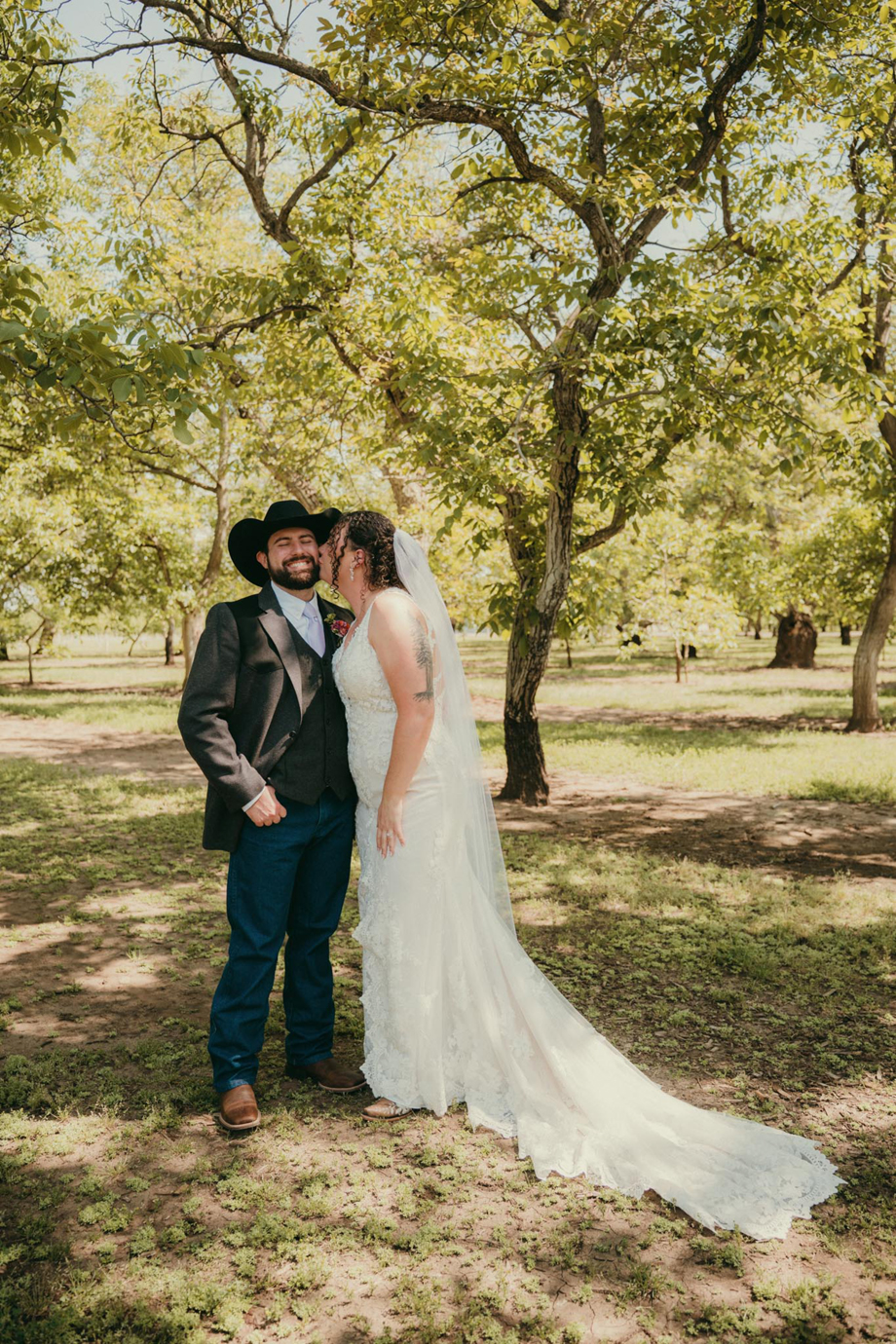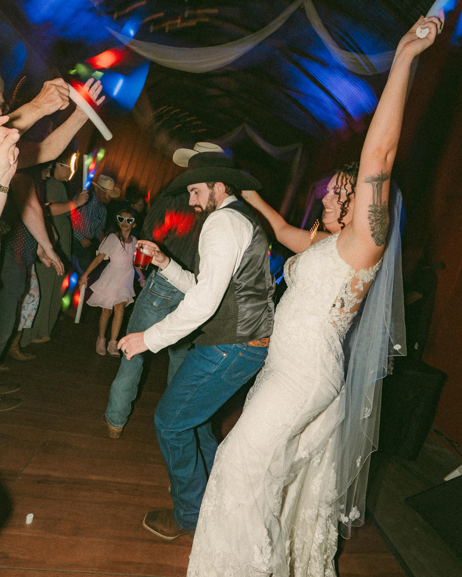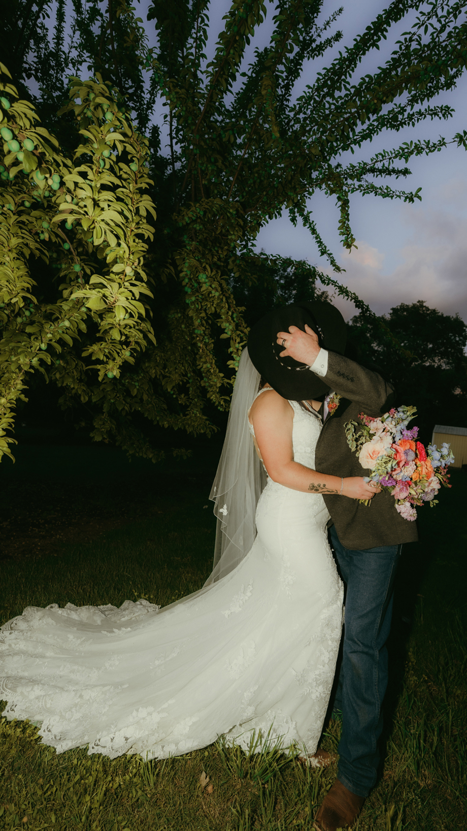 The backdrop of our ceremony was a beautiful green orchard with green grass and blue sky on a sunny and warm spring afternoon. The aisle was lined with rose petals and wild flowers from our and our family members’ gardens. We stood on a raised rustic wooden arbor below an elk shed antler adorned with a variety of colorful wildflowers. We wanted a semi-traditional wedding ceremony with some fun and a country flare to represent our lifestyle values. Caroline wore a white floral laced “trumpet style” dress with a beautiful scalloped lace edge train and added a veil, handmade by her aunt, and white floral laced leather boots. Dustin wore a western style dark charcoal coat and black cowboy hat with blue jeans and leather boots. Our bridesmaids dressed in various shades of sage green dresses with boots, while the groomsmen wore charcoal vests and matching cowboy hats with sage green ties, blue jeans, and boots.