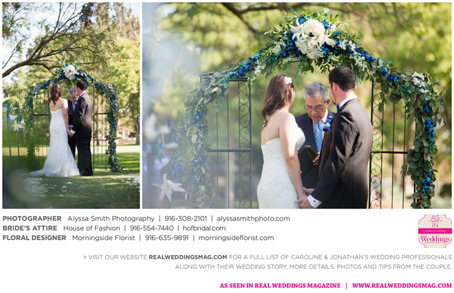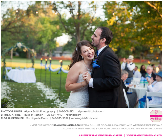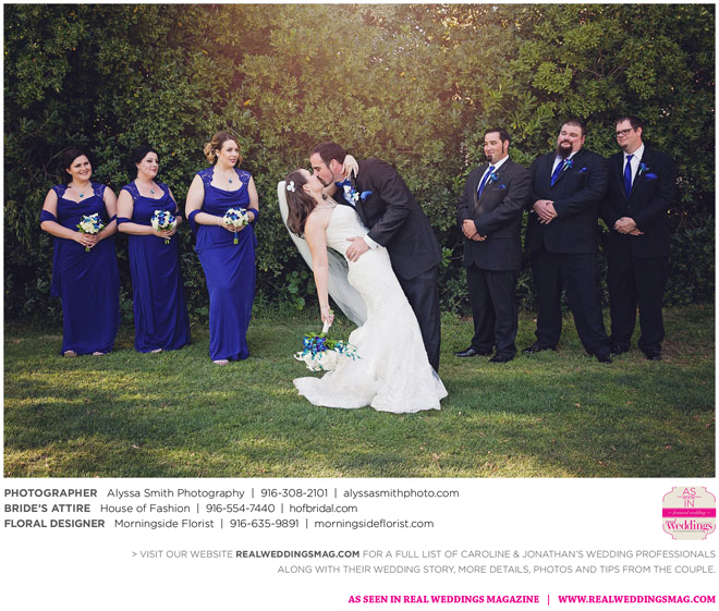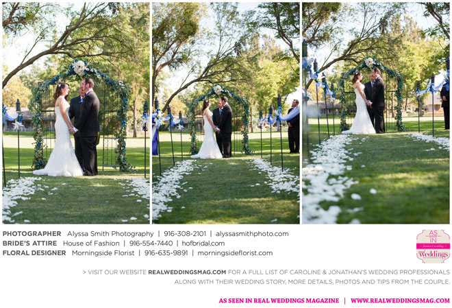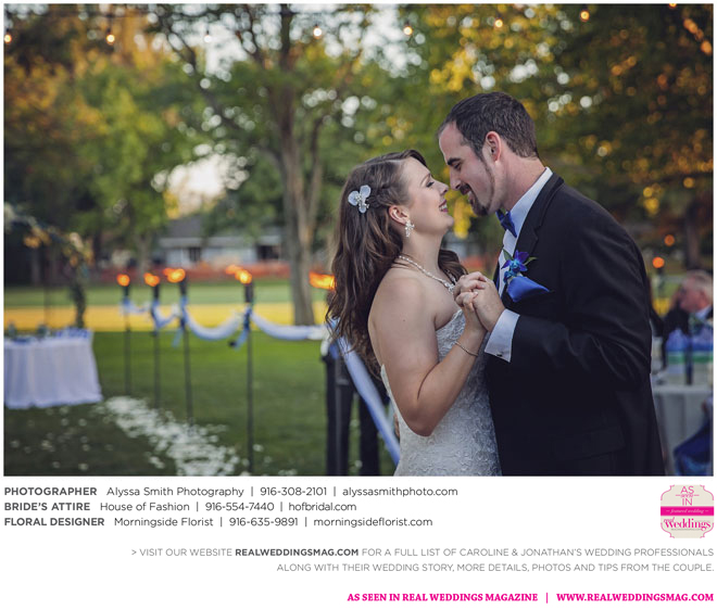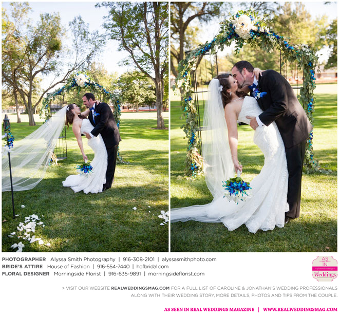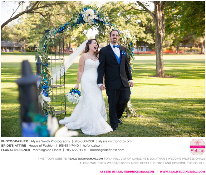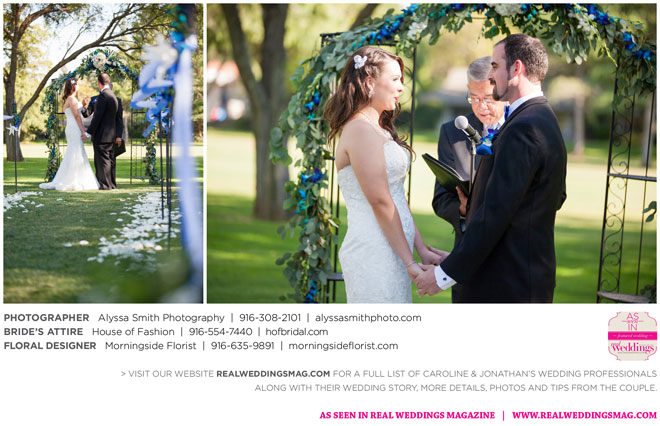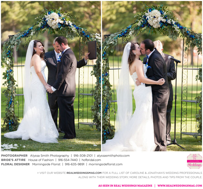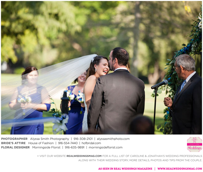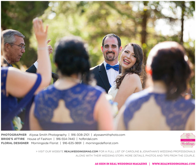 A year and a half later, they married in front of 100 guests at a family friend’s residence on El Macero Golf Course. They loved the private venue for its large trees and shade, as well as sentimental reasons. “We’ve had many special memories there and figured [we could] have our wedding there and make a very memorable memory that we can look back on every time we go there,” says Caroline, an office manager at a landscaping company.