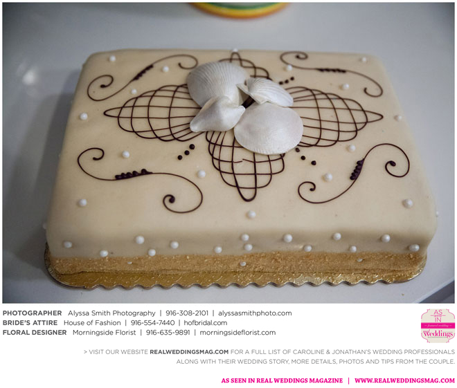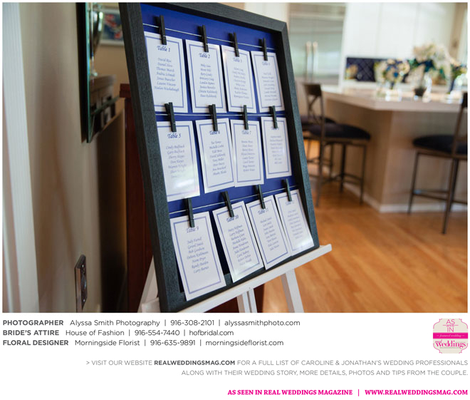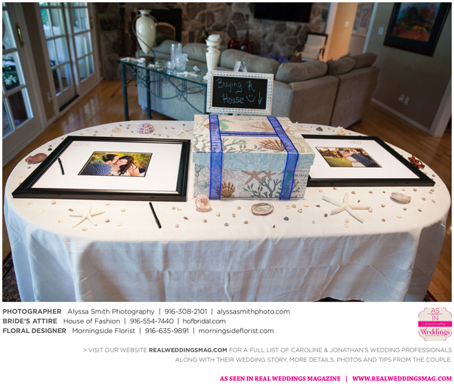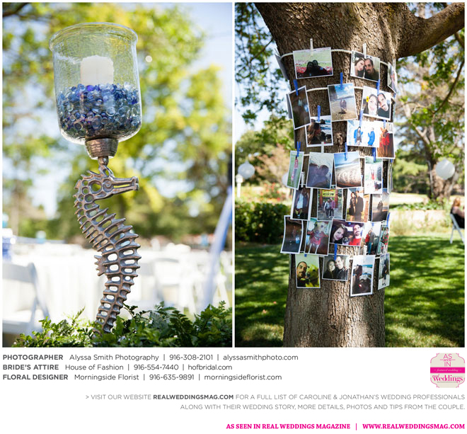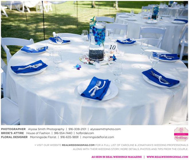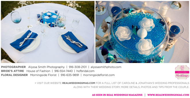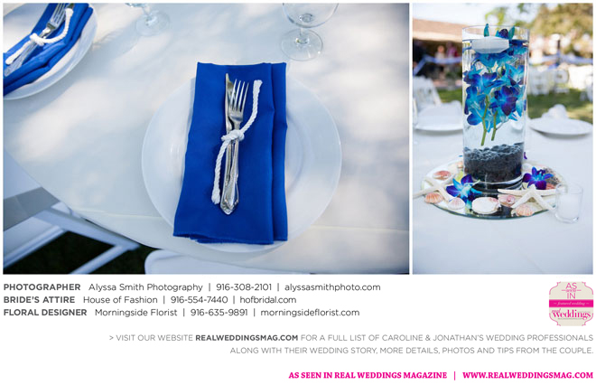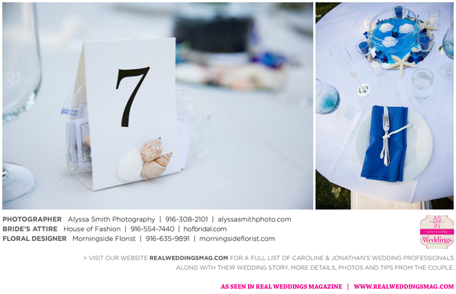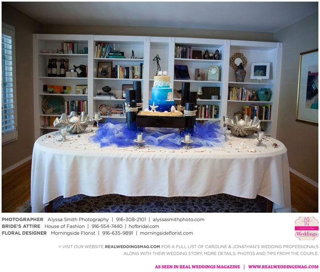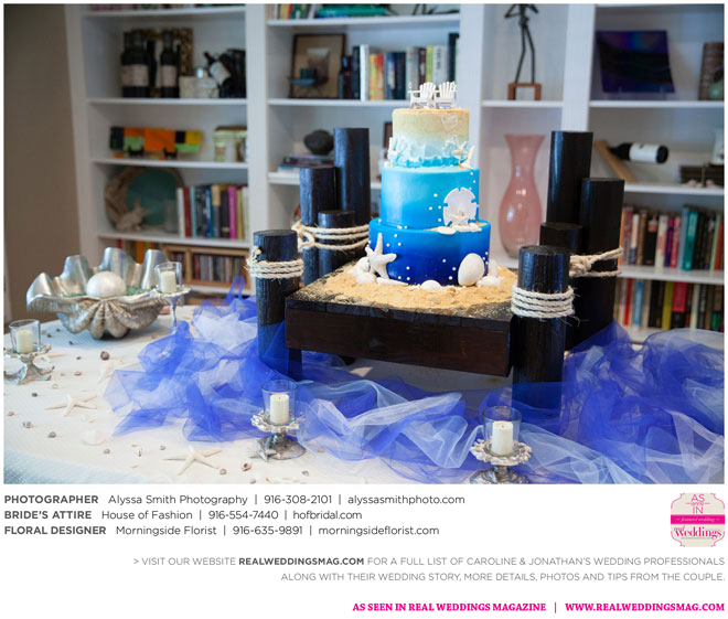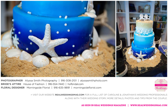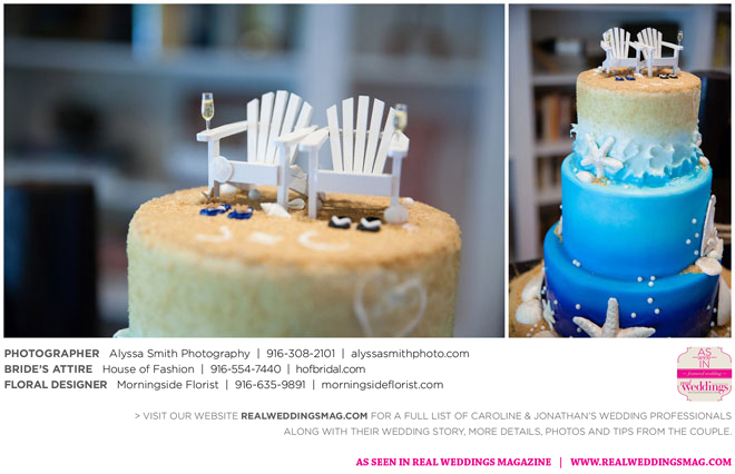 The wedding’s royal blue and white color palette reflected the ocean theme. “If we could have, we would have gotten married on the beach,” says Caroline, noting a destination wedding was pricey and not many guests could attend. “We chose to do it locally, and it was as close to the beach as it could be for being in Sacramento…sea shells and sand everywhere.” Even their cake had an under-the-sea theme, featuring a dark blue bottom with seashells, a middle layer with waves and a top layer using graham cracker crumbs as sand. The cake topper? Two white beach chairs with a pair of flip-flops and a glass of Champagne on each chair.