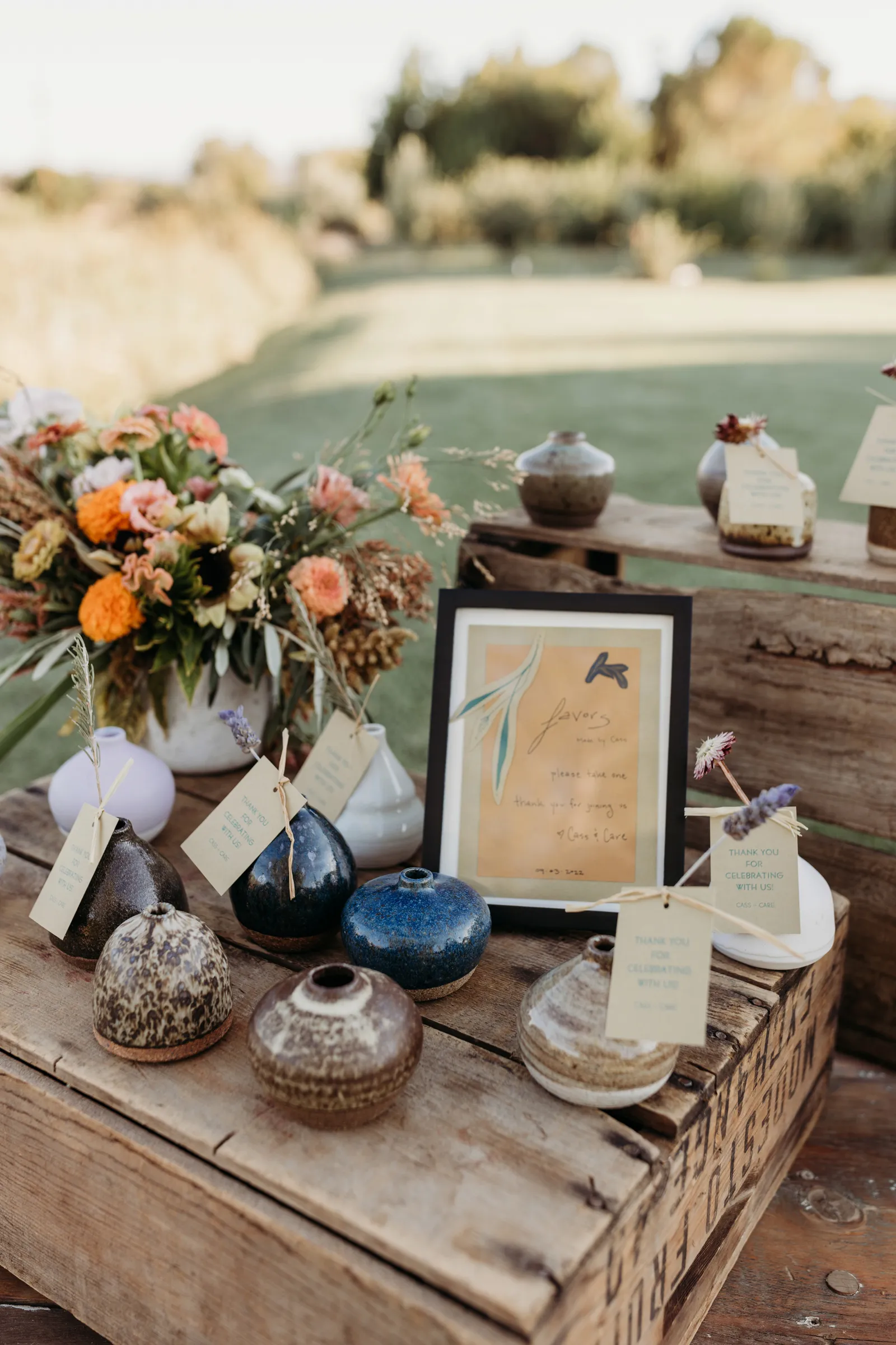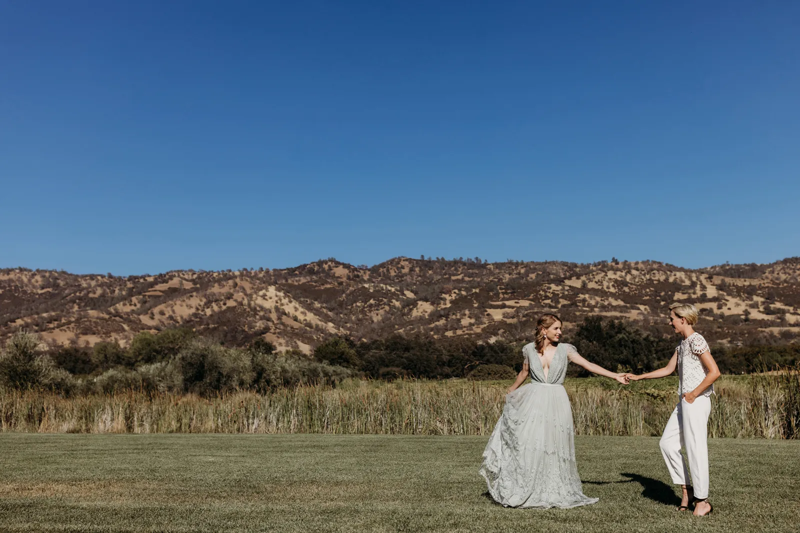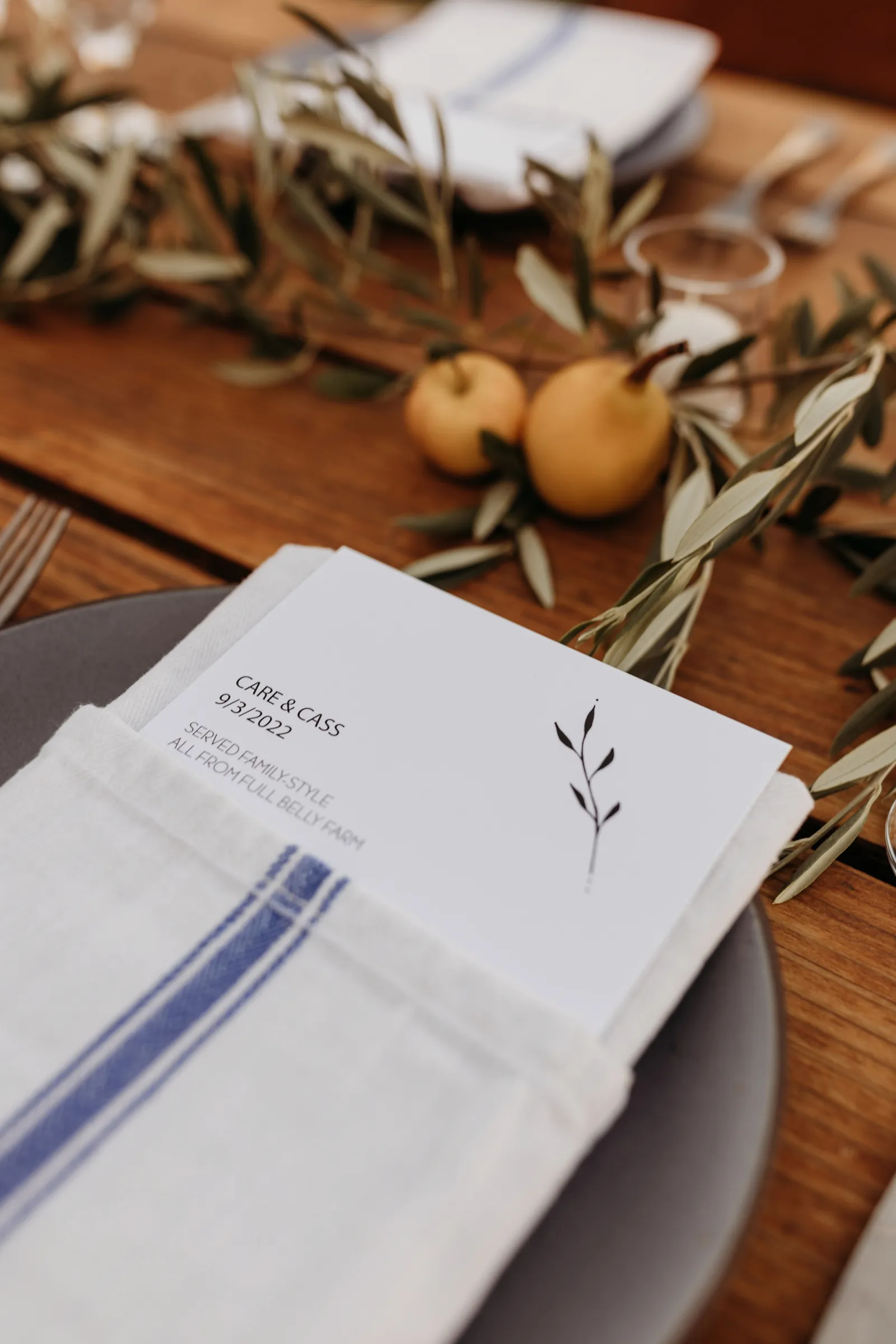The incredible flowers everywhere. There were flowers thrown after the ceremony (instead of rice) and on every table. The fact that they came straight from the fields next to the reception made them even more special. Honestly, the fact that everything really came from Full Belly Farm was really remarkable. Incredible pasta made with flour milled near by, veggies roasted in the pizza oven next to the dance floor, and a whole melon bar fresh from the farm that morning. It felt personal and almost familial in its intimacy and closeness. I (Carolyn) also have to mention how cool it was to see Cass’s ceramics on the table and art designs incorporated into the menu and paper goods. That was really neat.
