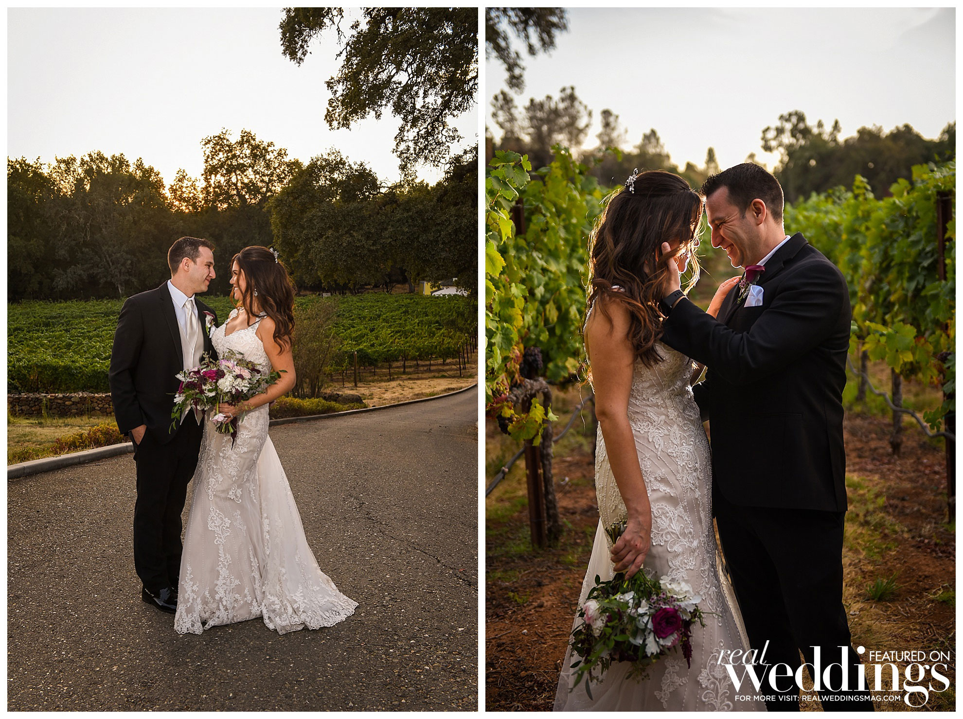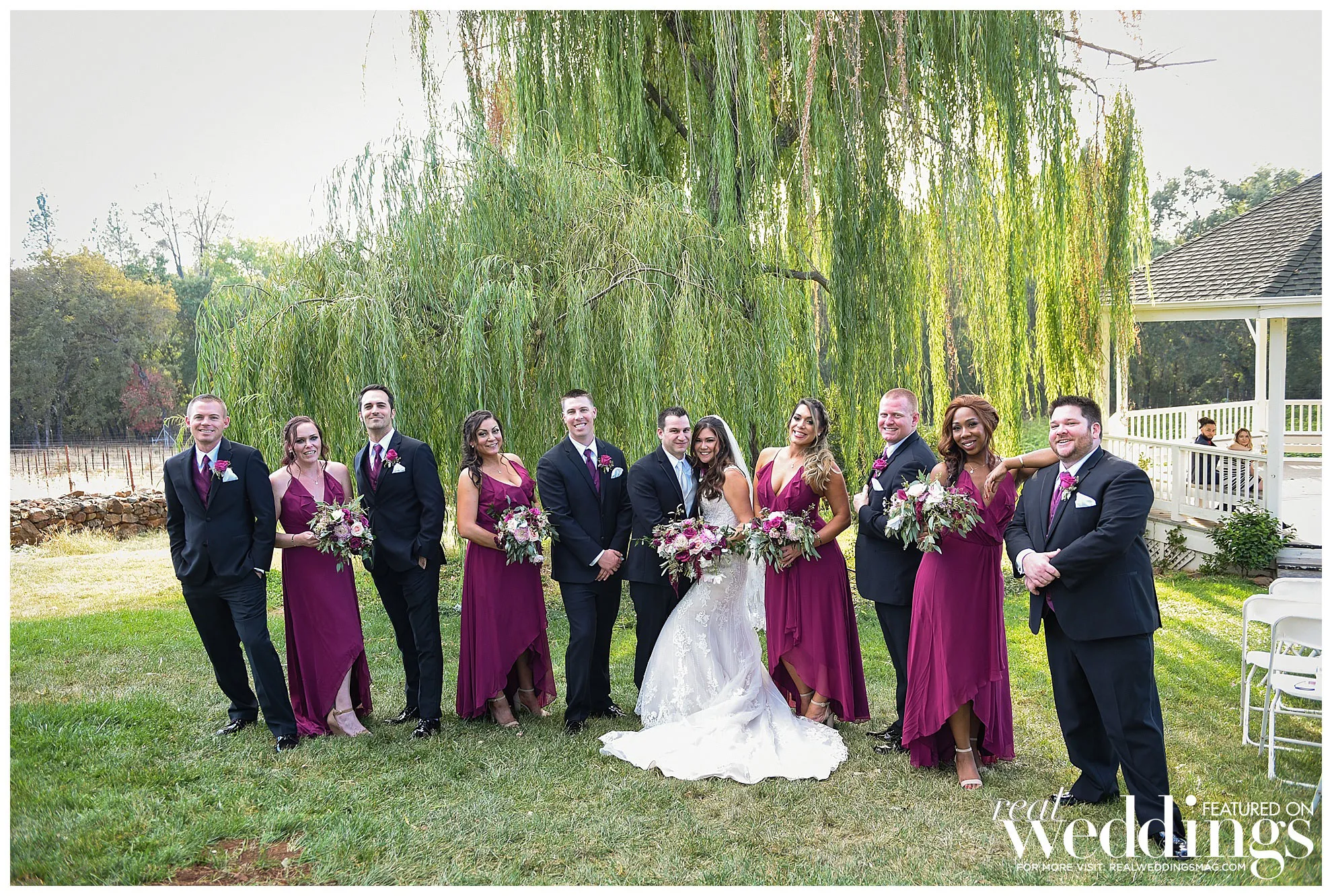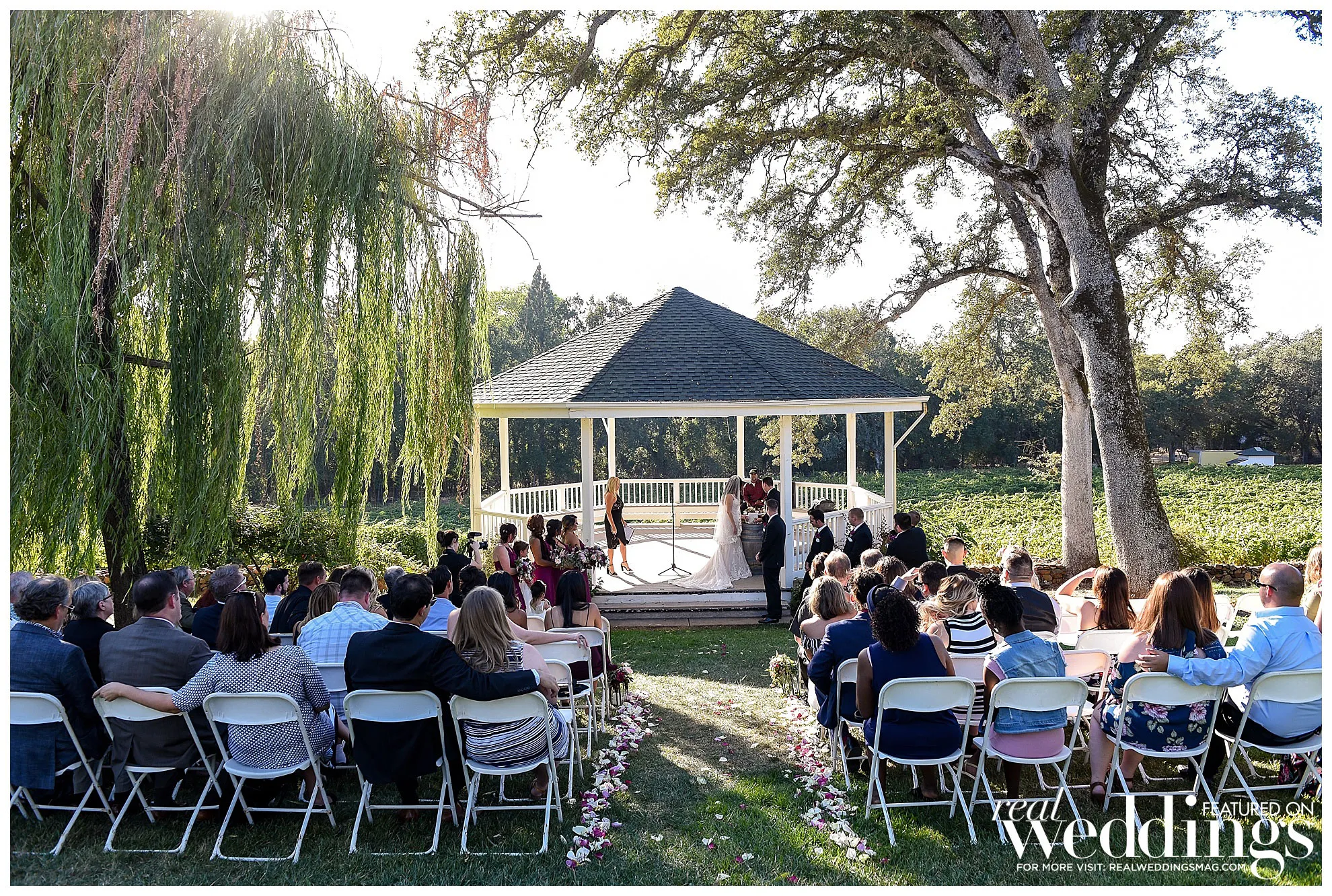 Eventually, their save-the-date cards featured photos of them hiking in Yosemite, and they continued to incorporate nature and scenery into their wedding, which was held a year and a half later at Cielo Estate Winery. “The willow tree and white gazebo where we said our vows was fairytale-like to us,” says the bride. “The location of the winery is just far enough from the hustle and bustle of city life to feel like you are getting away, but close enough to not be overly burdensome for guests to travel to and find a nice place to stay the weekend and enjoy themselves.”