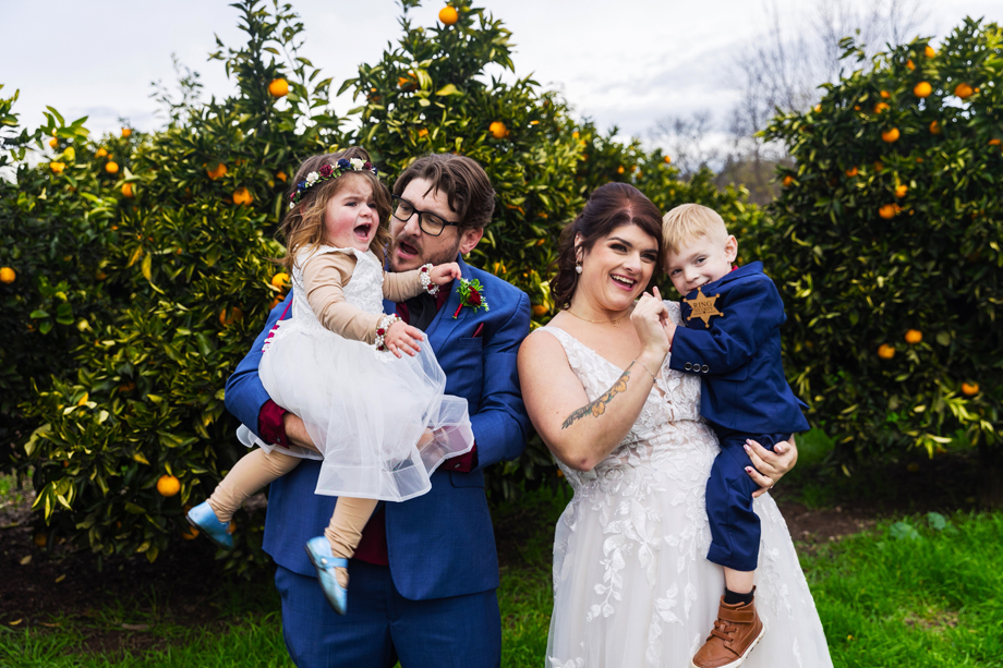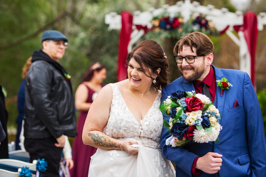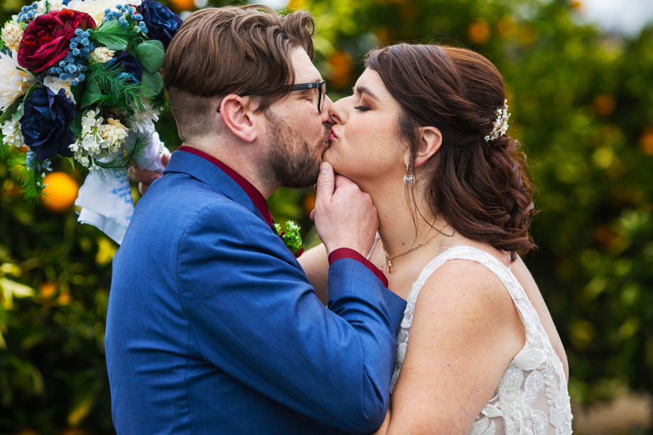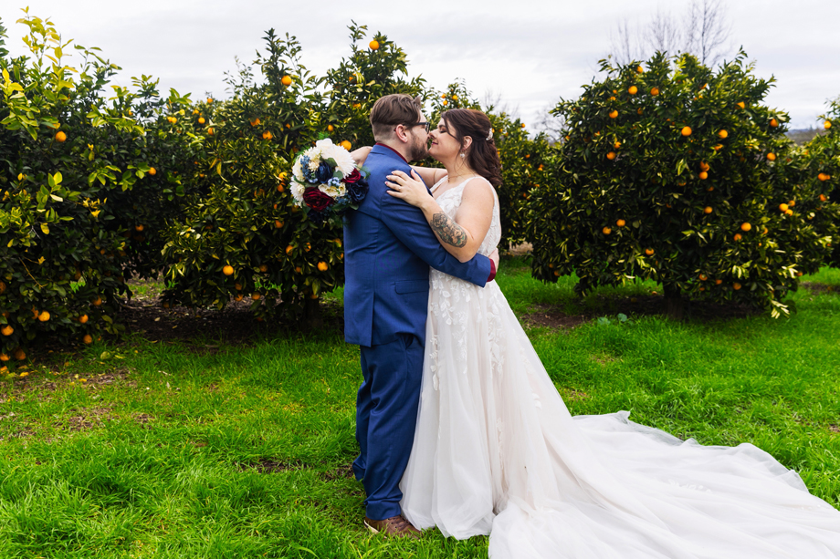 One of the most unexpected moments of our wedding was the oranges. When we had originally booked the venue, it was summertime, and we had not realized there were orange trees everywhere. It was a little windy the day of the wedding and our aisle runner wasn’t staying in place. I guess a member of our wedding party decided to used some of the oranges along the side of the runner to help hold it down. Not a bad idea, however, when my bridesmaids began walking down the aisle some of their dresses got caught on the oranges and they began to drag oranges down the aisle with them. It was hilarious. Everyone was laughing, not at my bridesmaids, but at the situation of dresses with a train full of oranges.