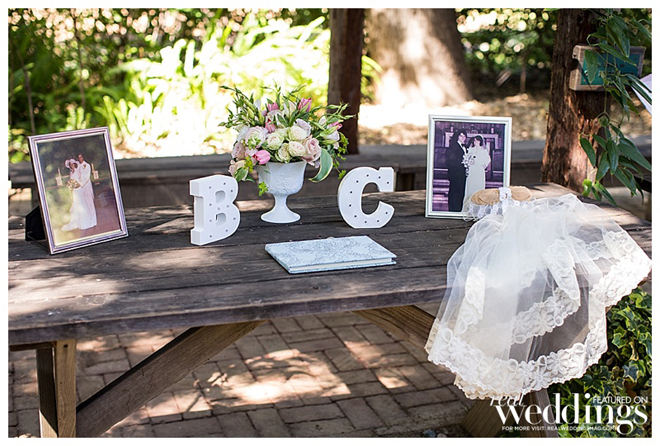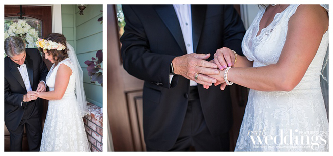 Because we got married in the chapel the day before, and were about to make our forever promise in front of all our guests that afternoon, we wanted a special moment just the two of us. On the iconic wrap–around porch of the historic house at the Los Altos History Museum, we had our first look before the outdoor ceremony. I walked up to Brad and tapped his shoulder. When he turned around, the reality of the moment ht us and we both started laughing and crying! It was both romantic and special, or private pre-ceremony rendezvous.