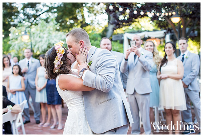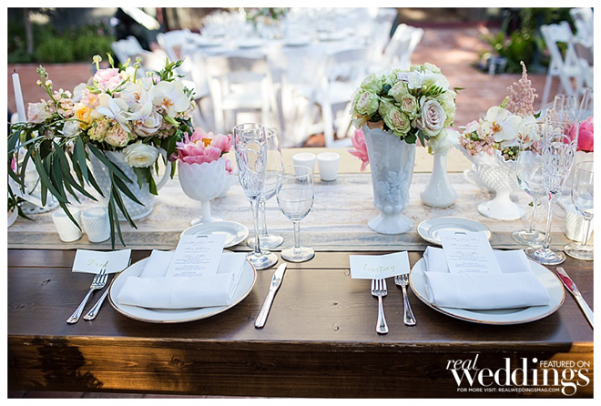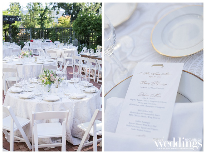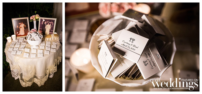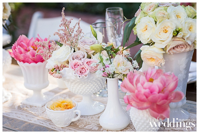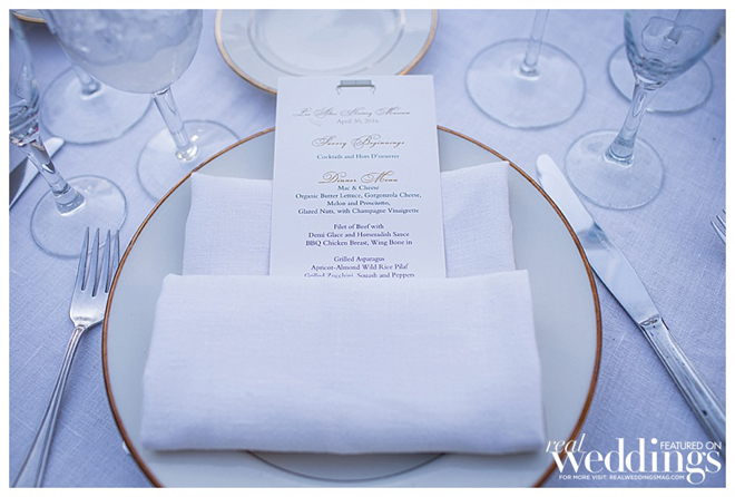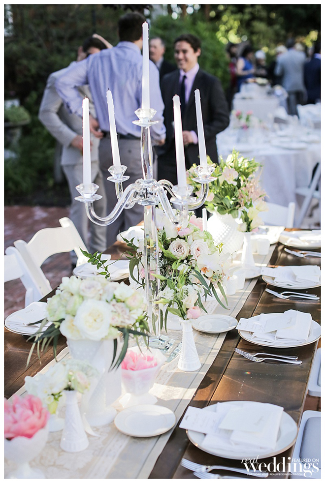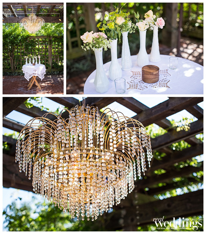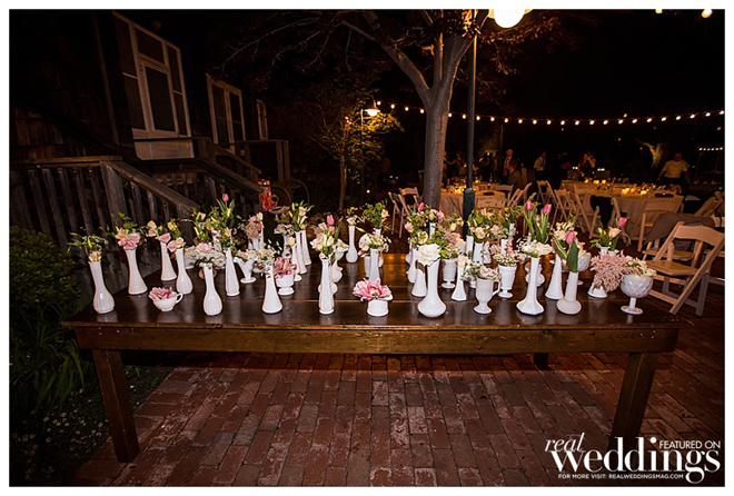 A personal touch—the couple and many of their guests had collected more than 300 vintage milk glass vases for a year to be displayed at their wedding. “We loved the milk glass and it was a fun detail for all the guests as well,” says Courtney, noting many guests took the glass home as favors. “It was fun for them to see the fruits of their labor.”