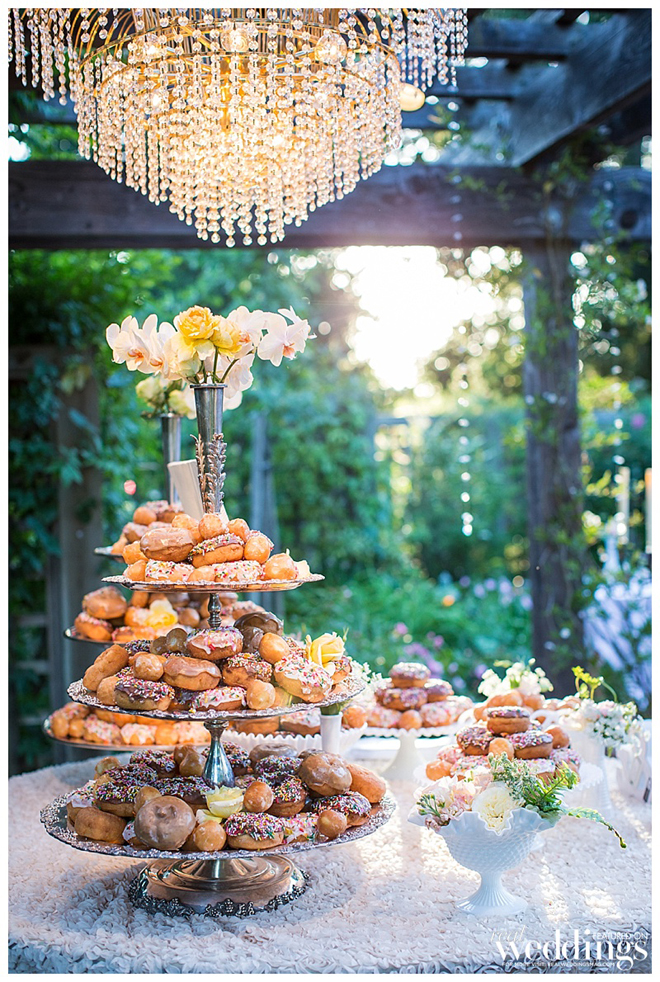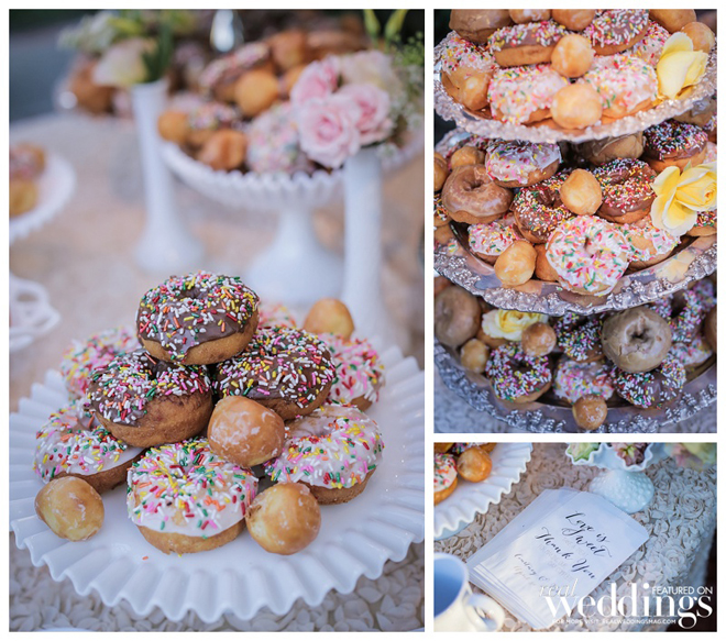 Instead of cake, the couple served milk with 400 donuts and 200 donut holes. “We dipped donuts and fed each other,” says Courtney, noting they did not do a garter or bouquet toss.