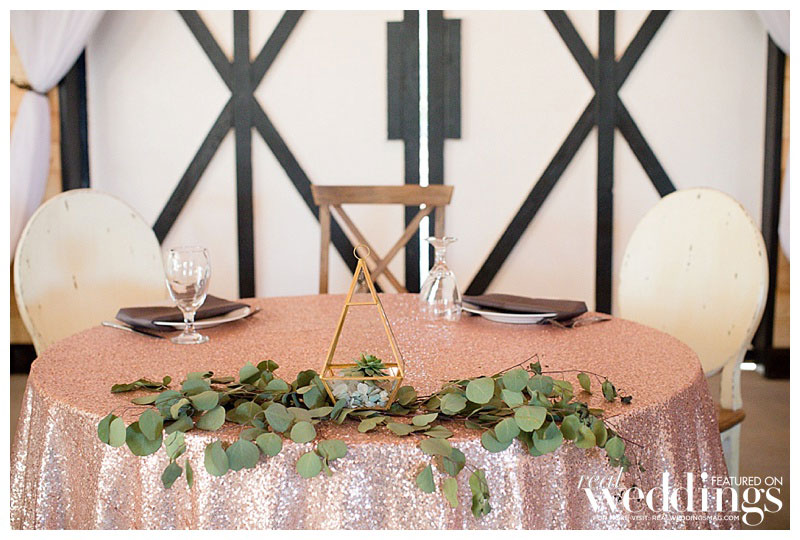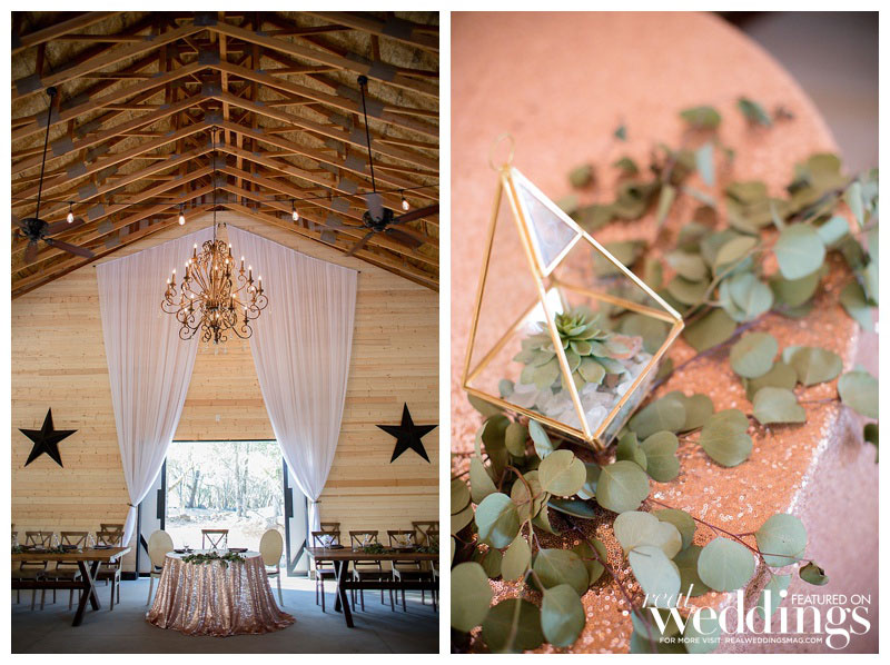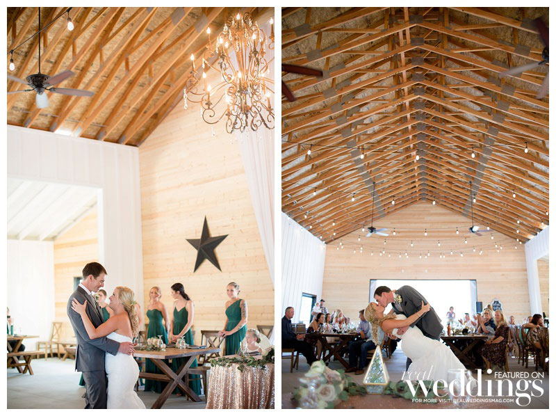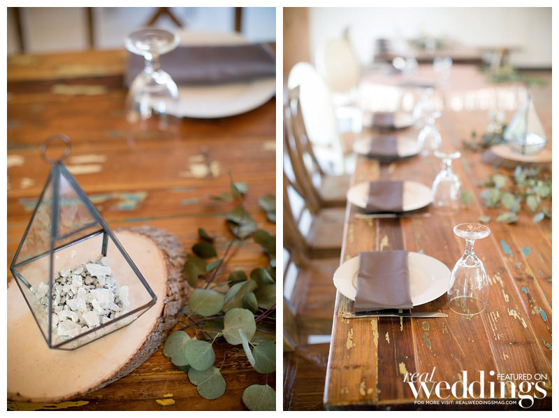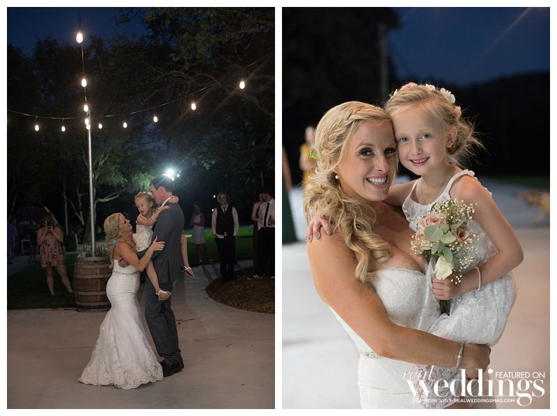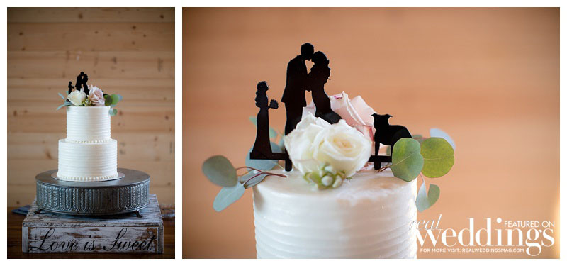 She says the wedding style was “forest meets chic,” complete with dark green dresses and ties, eucalyptus pieces and succulents, accented with small hints of glitter. The bride’s favorite detail was their custom cake topper, which featured a silhouette of Dave, Courtney, Amalie and the couple’s dog, Rome.