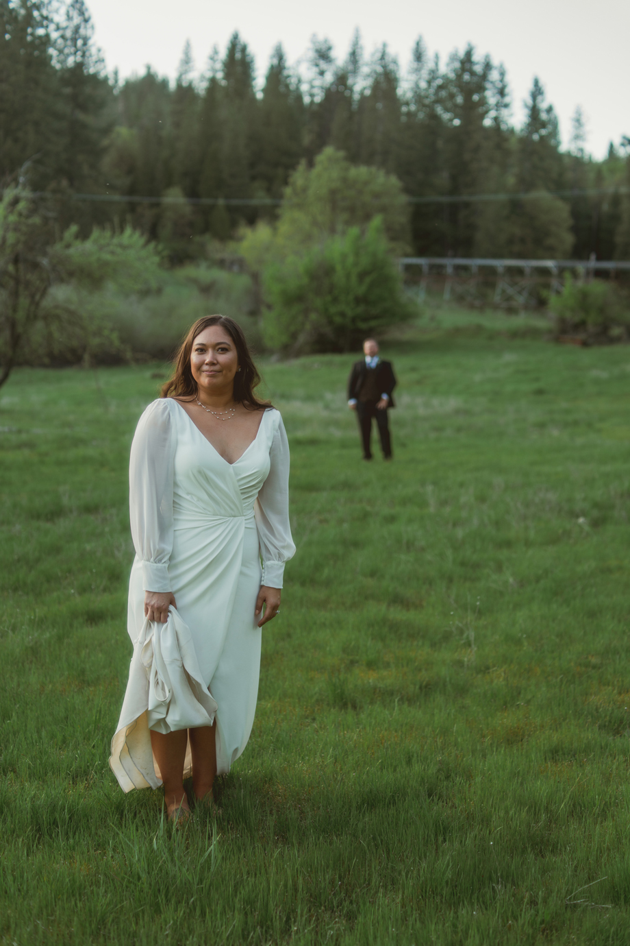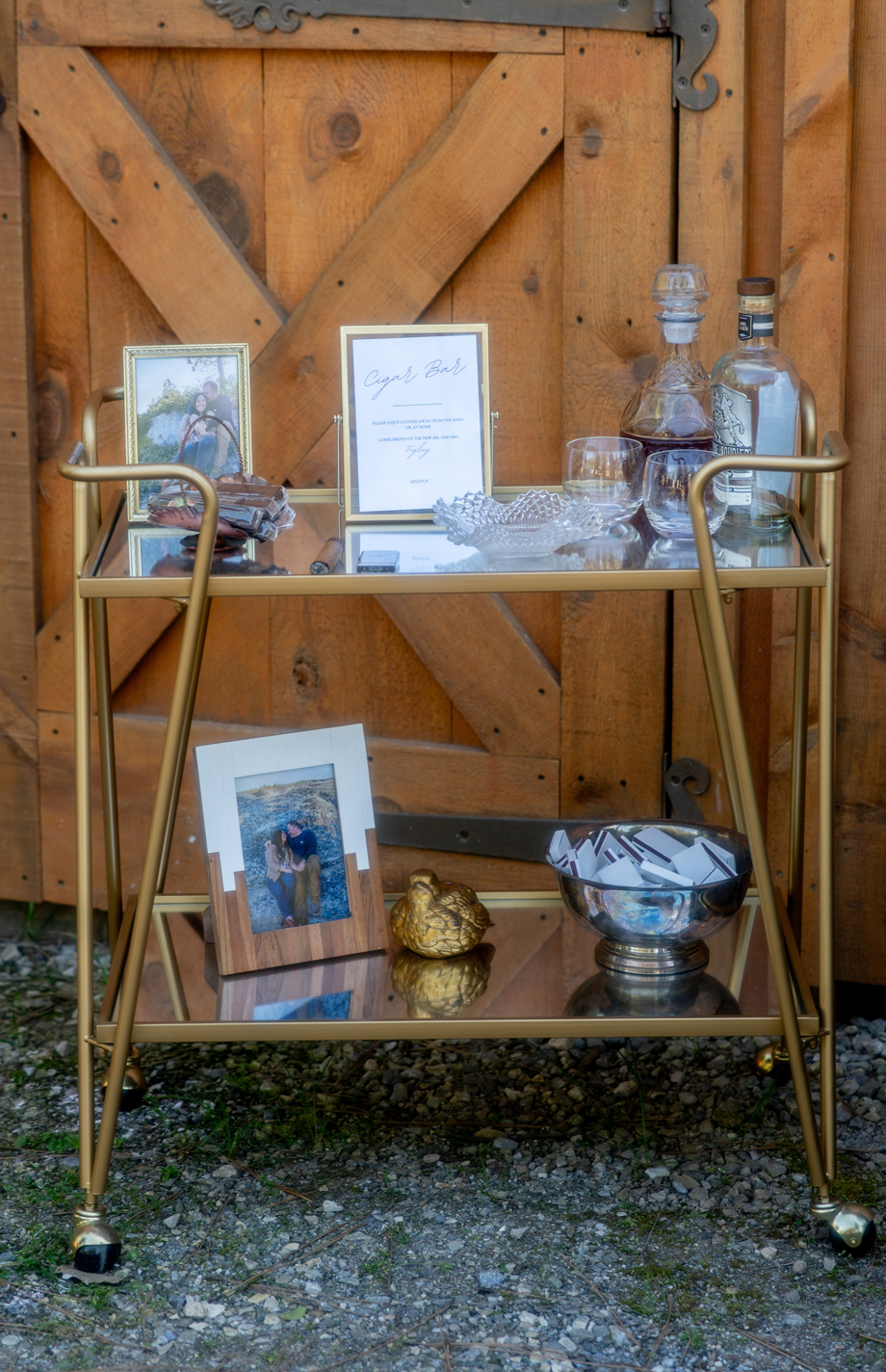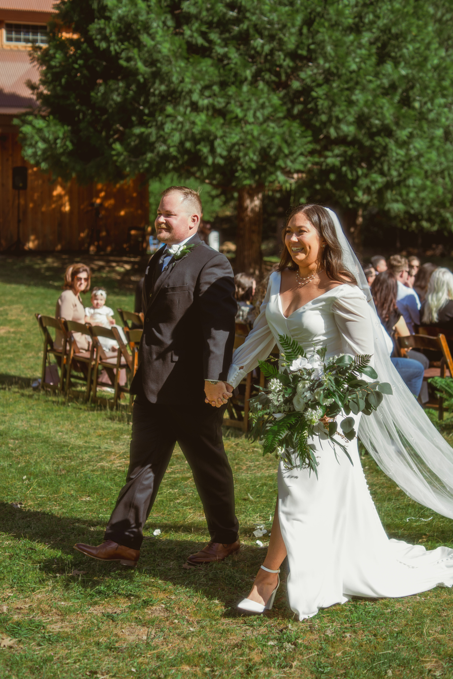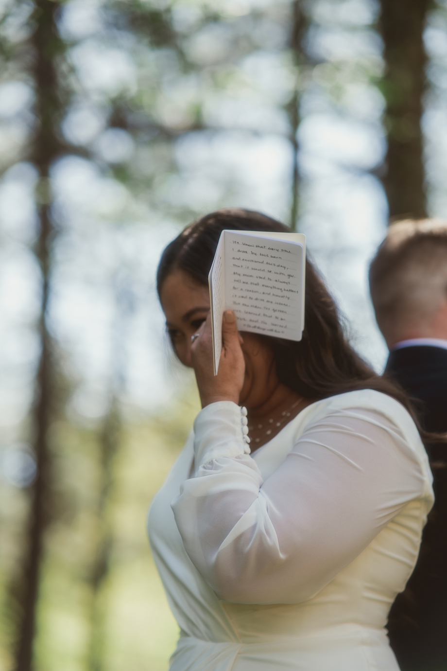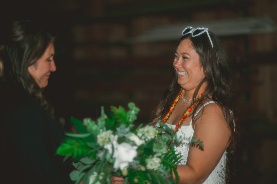 While I was hiding inside of the barn before the ceremony started, I could hear our bridal party on the other side of the barn door. Right when the music started, I heard one of my bridesmaids go, “Oh no, oh my God!” And another saying, “It’s fine! Just go!” I had no idea what happened, and as it turned out, one of my bridesmaid’s dress ripped in the back—but she totally handled it like a champ, barely anyone noticed, and it became a funny thing to laugh about after.
