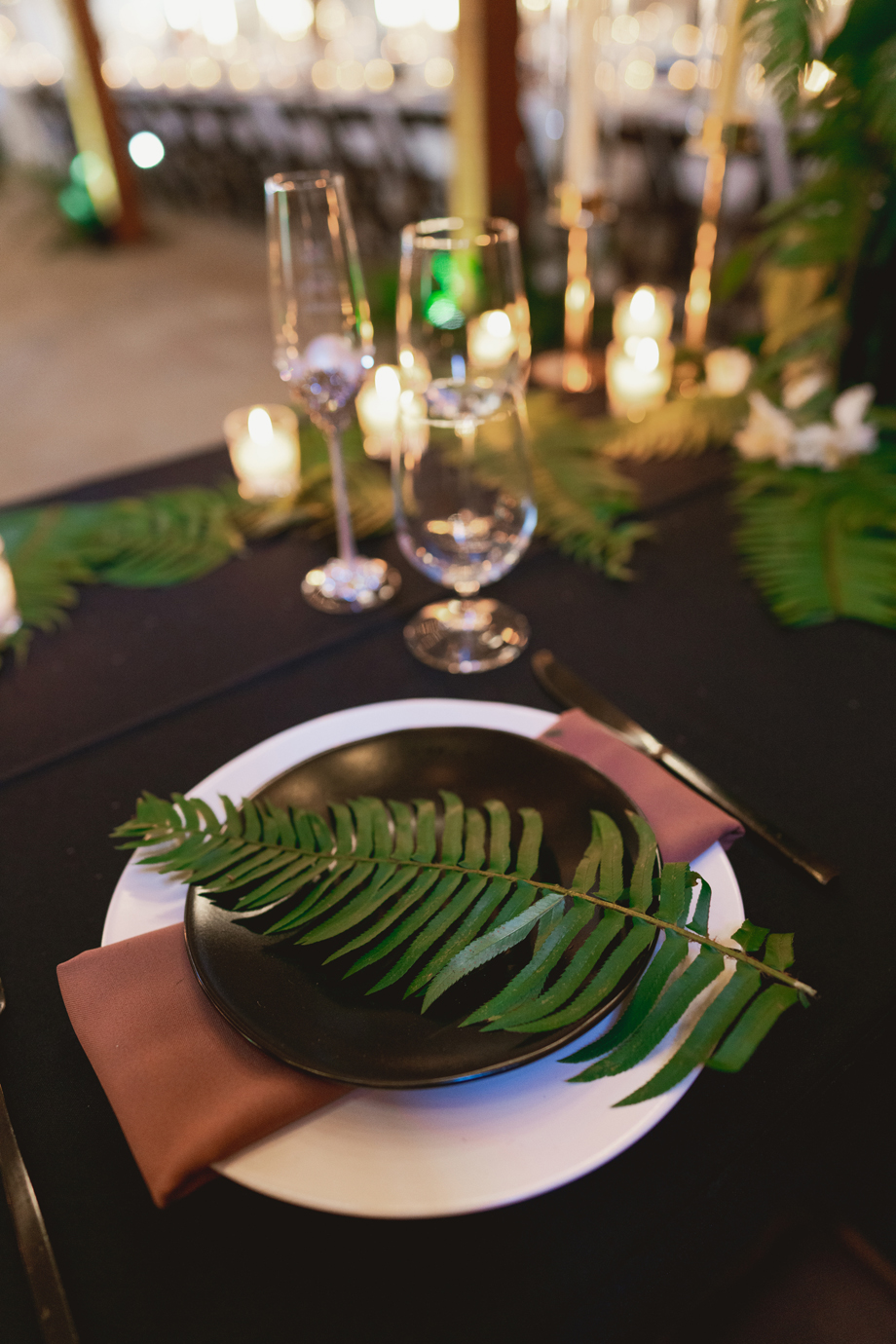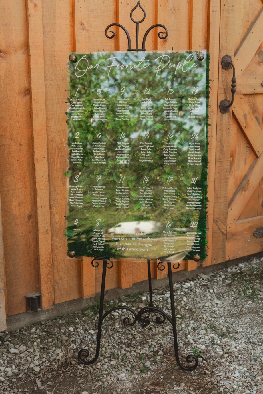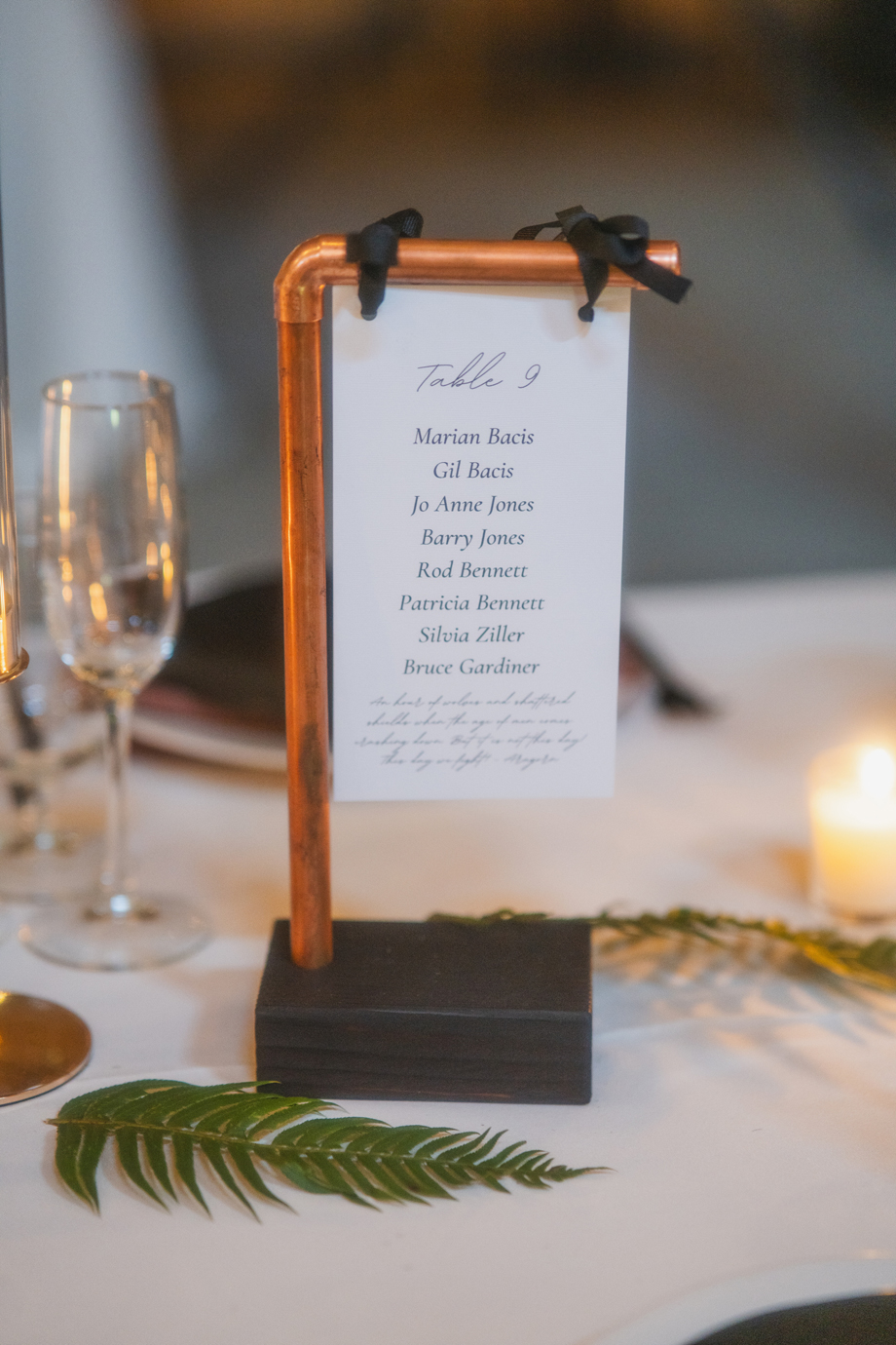 Aaron LOVES The Lord of the Rings and wanted to incorporate it somewhere, so he picked out quotes he loved from the movies and we added them to our table signs. Also, part of our dress code was requesting guests to wear our wedding colors (brown, copper, champagne, black) to really have the green in our florals stand out and for cohesive photos. It turned out so great!