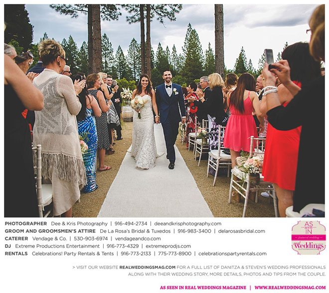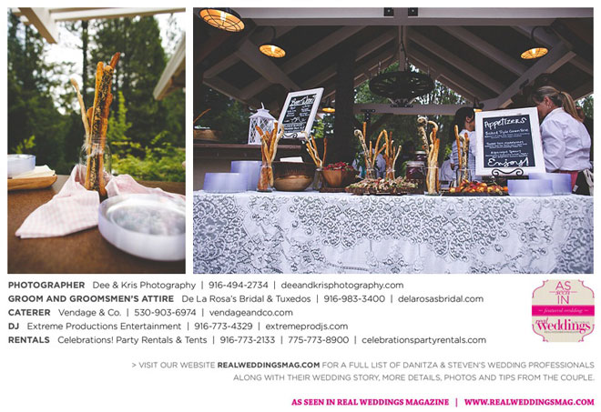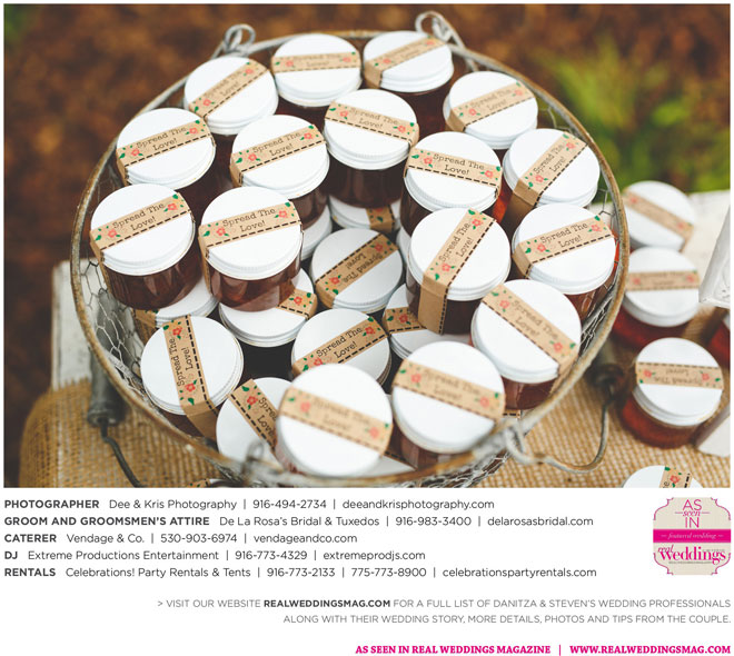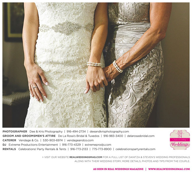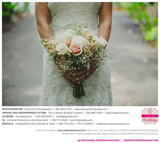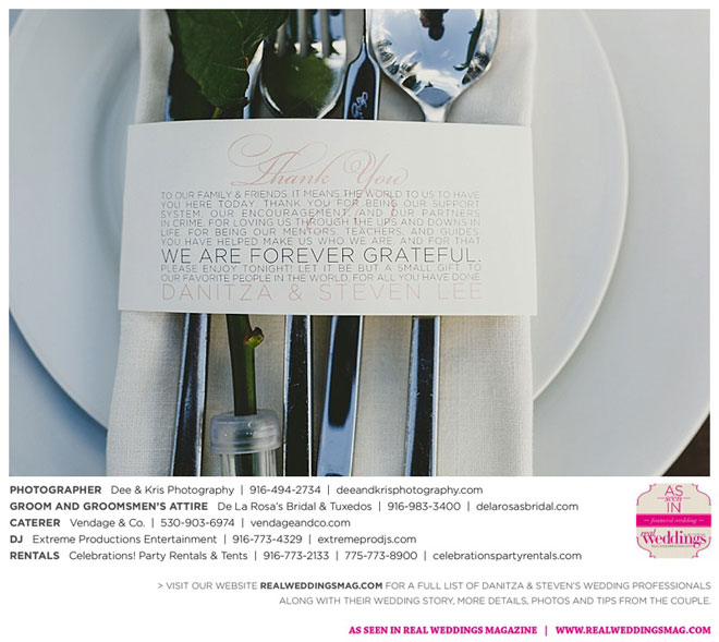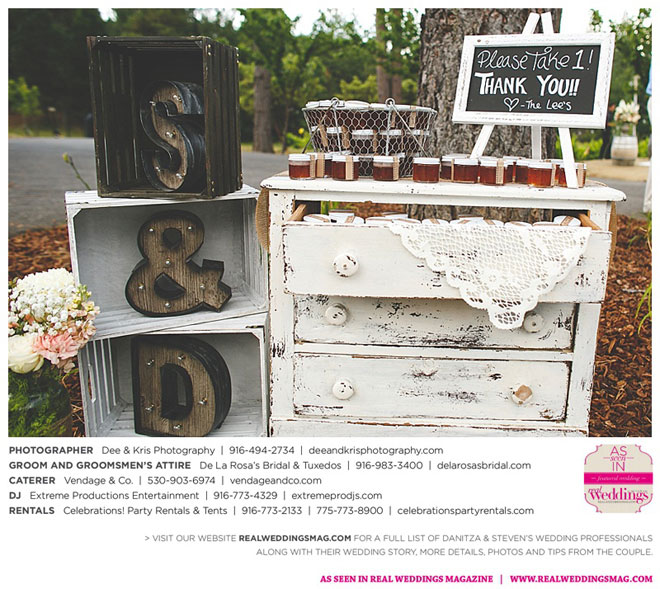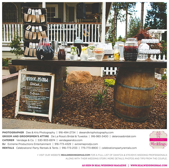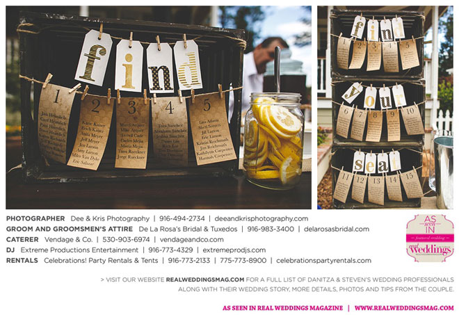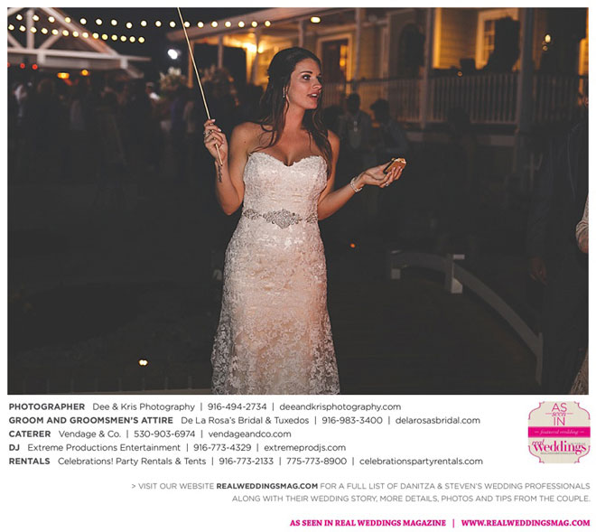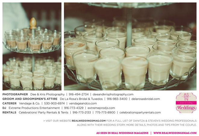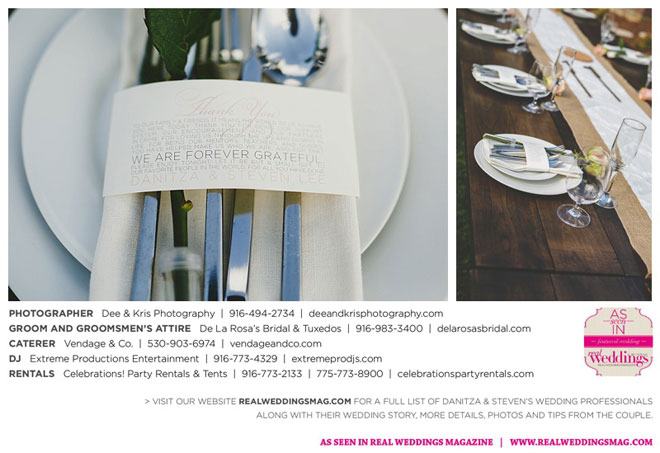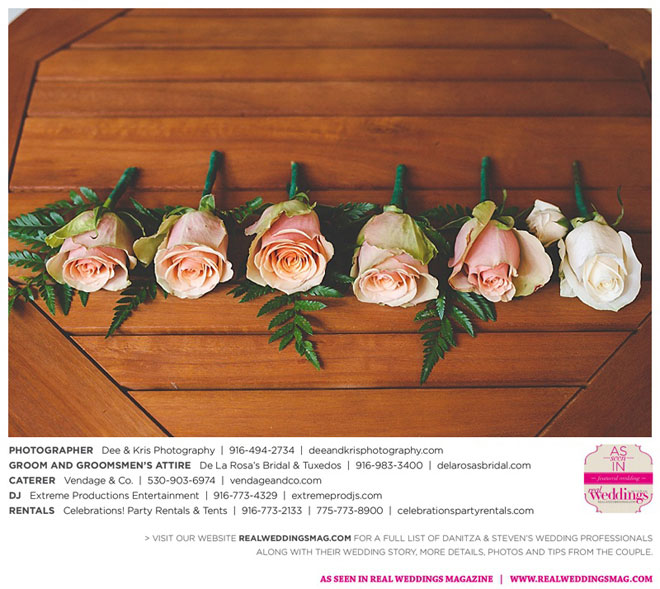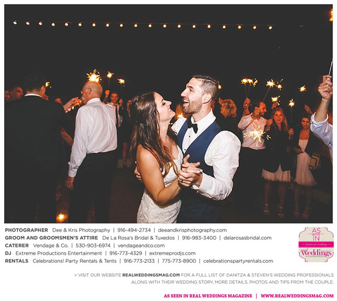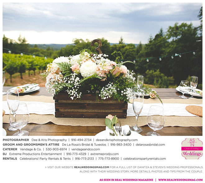 Other memorable touches included Danitza’s mom’s unwavering help and support throughout the entire process, floral arrangements coordinated by her maternal grandmother and tabletop centerpiece boxes built by her paternal grandfather. To top it off, the family-oriented wedding was officiated by Steven’s grandfather, who lent a lighthearted aspect to the ceremony when he accidentally skipped a page of his script, leading to a good laugh for all.