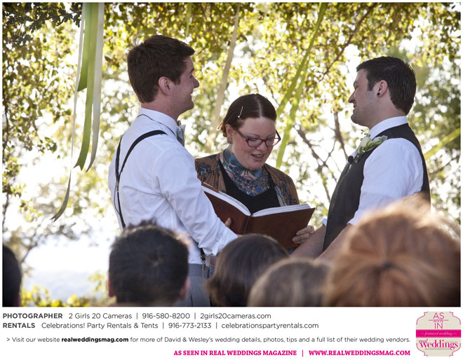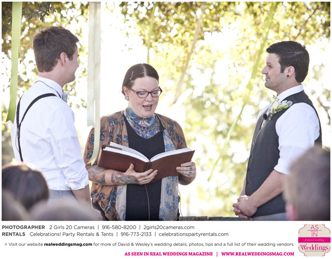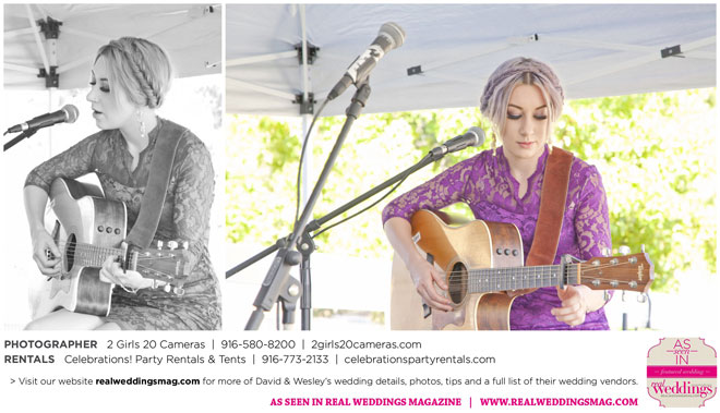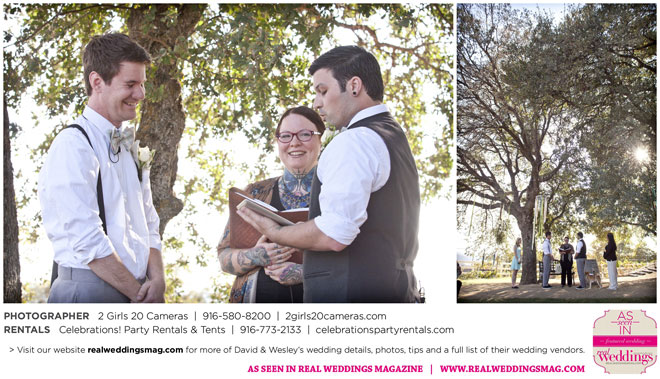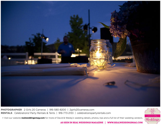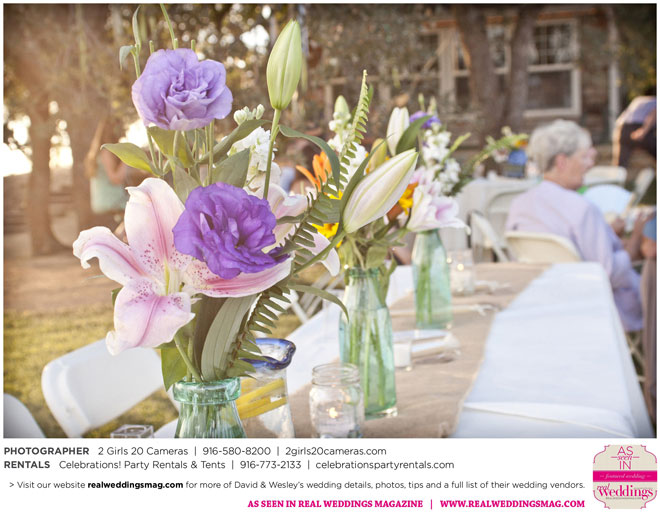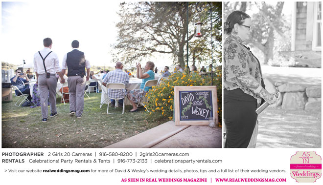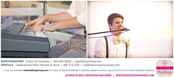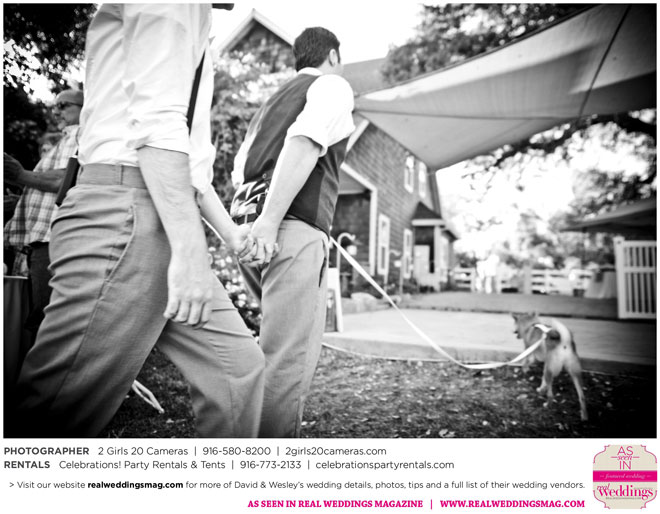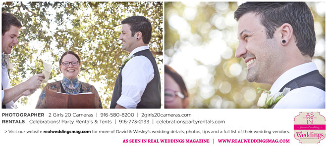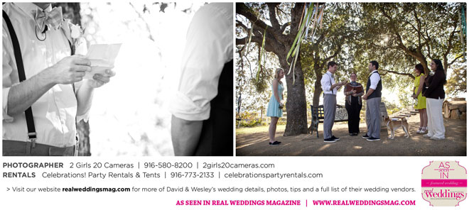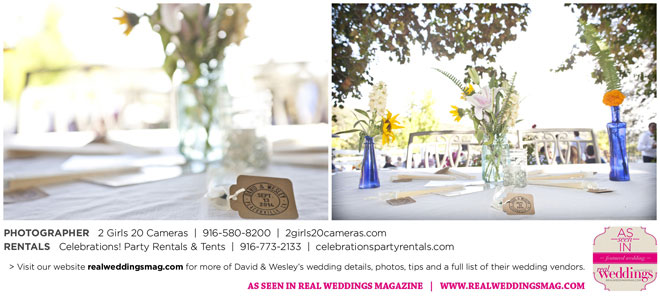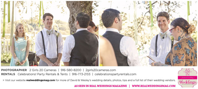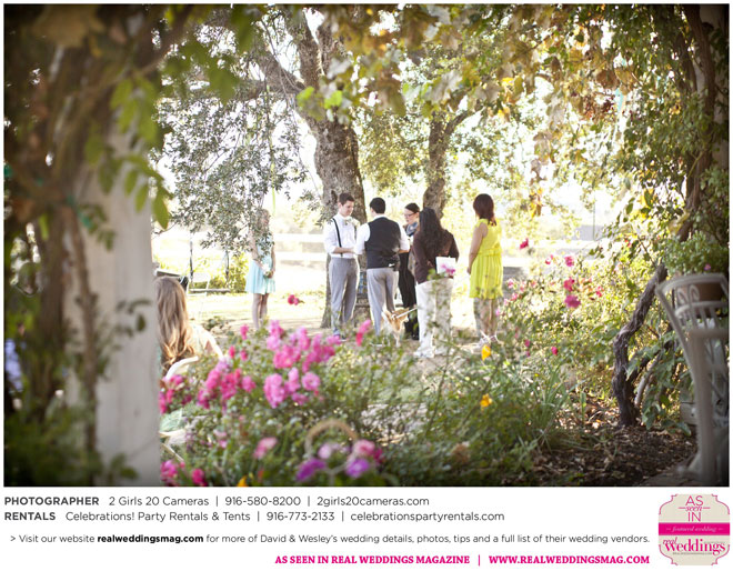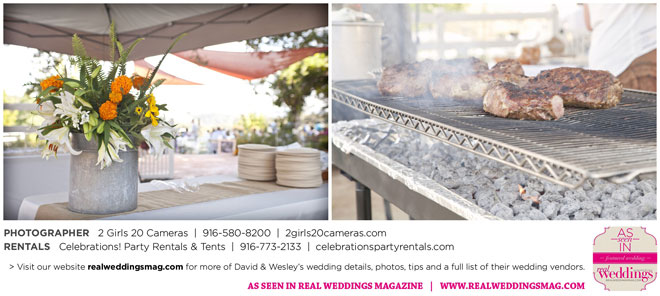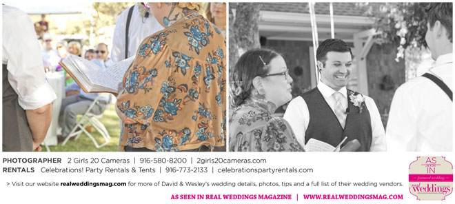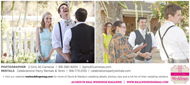 The couple had to plan their wedding on a budget, so they cut out what they could, including videography and a wedding planner. “The DJ, lighting, flowers, décor, wine, catering, and even venue had all been graciously offered as gifts from our talented friends and family,” David says. Both the ceremony and reception took place in a friend’s backyard in the foothills, also bringing costs down. “A lot of people contributed to making the wedding successful,” Wesley says. “We kept referring to the wedding as a barn raising, since so many people came together to help us.”