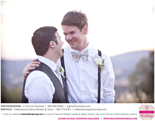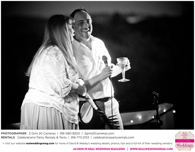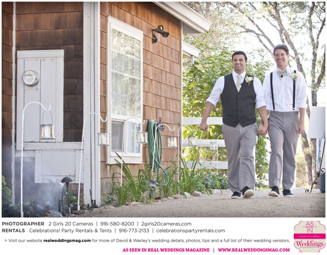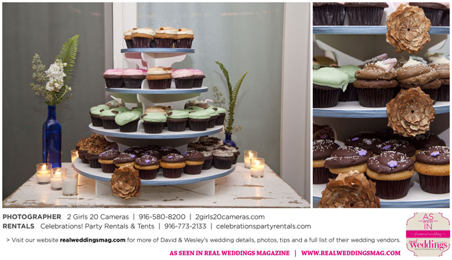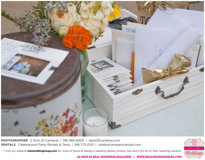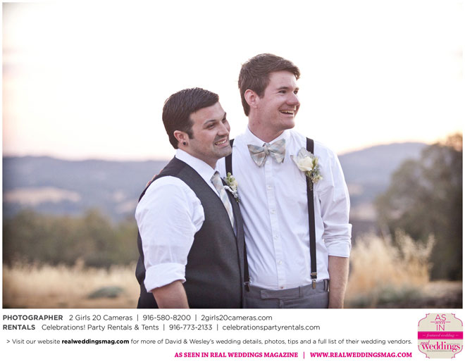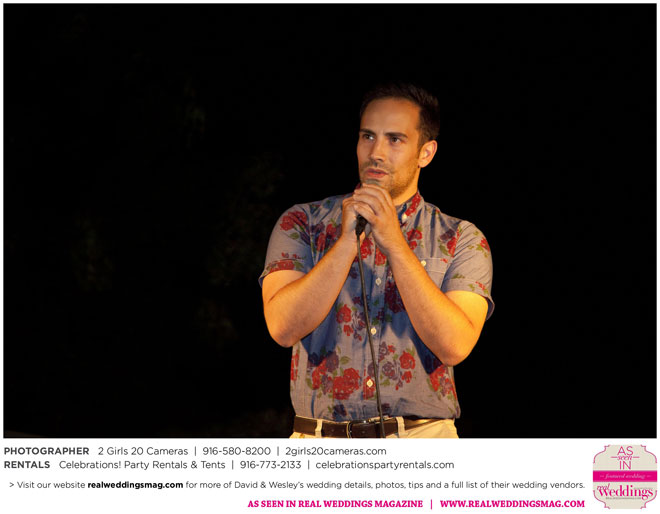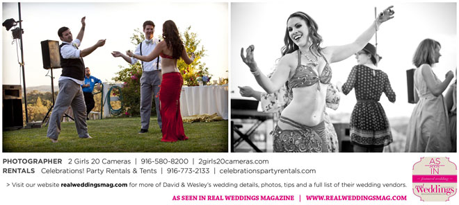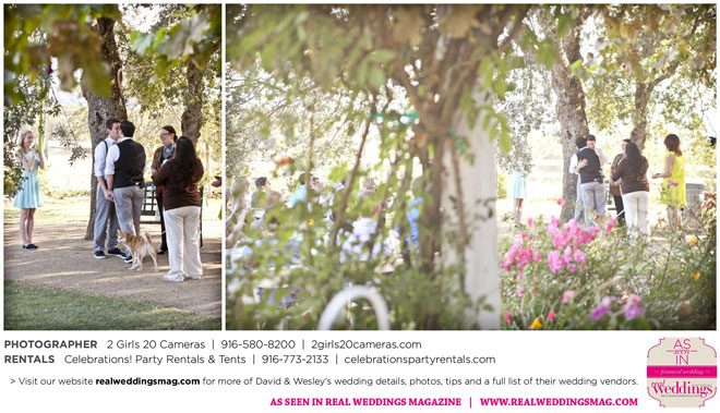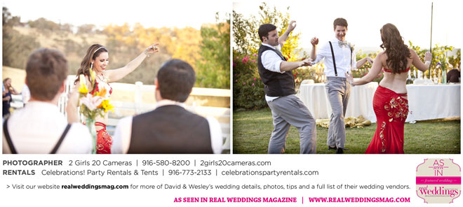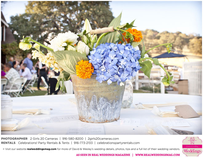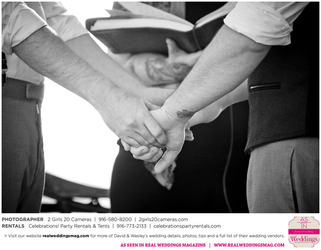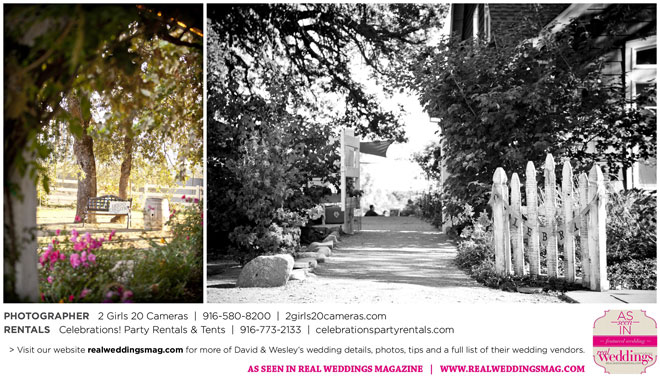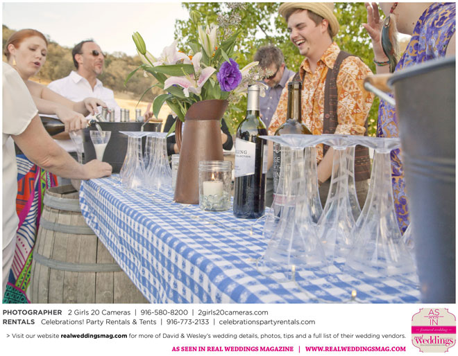 The couple had to plan their wedding on a budget, so they cut out what they could, including videography and a wedding planner. “The DJ, lighting, flowers, décor, wine, catering, and even venue had all been graciously offered as gifts from our talented friends and family,” David says. Both the ceremony and reception took place in a friend’s backyard in the foothills, also bringing costs down. “A lot of people contributed to making the wedding successful,” Wesley says. “We kept referring to the wedding as a barn raising, since so many people came together to help us.”