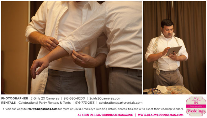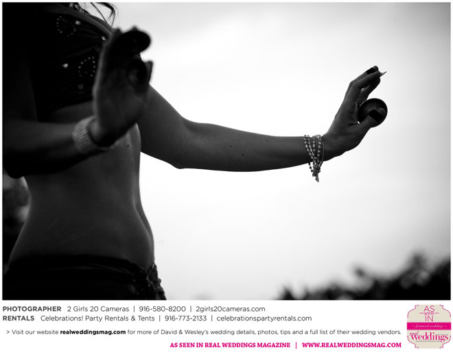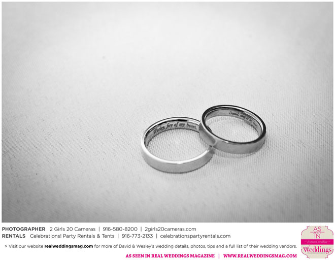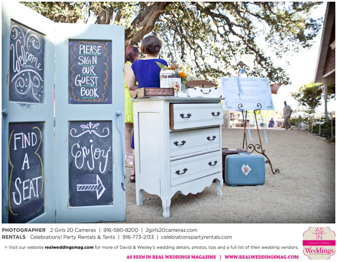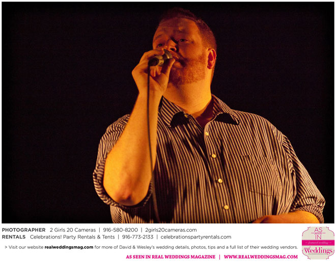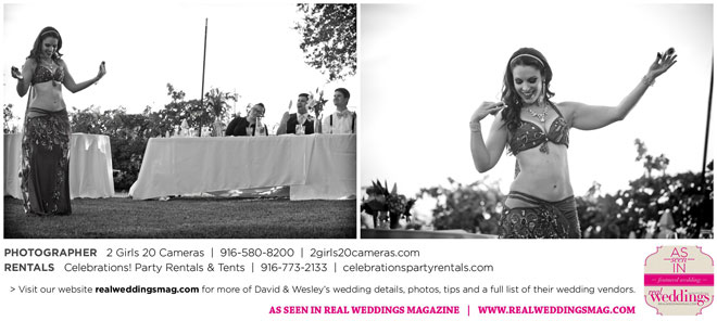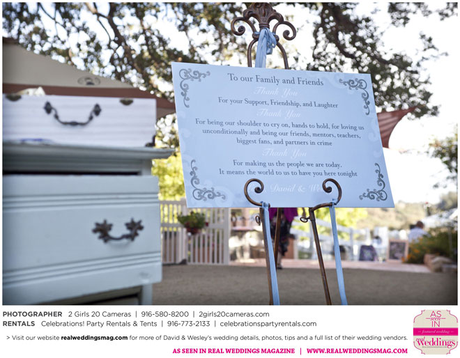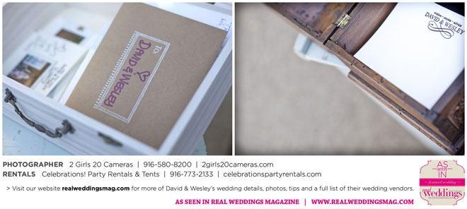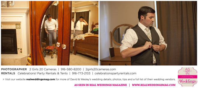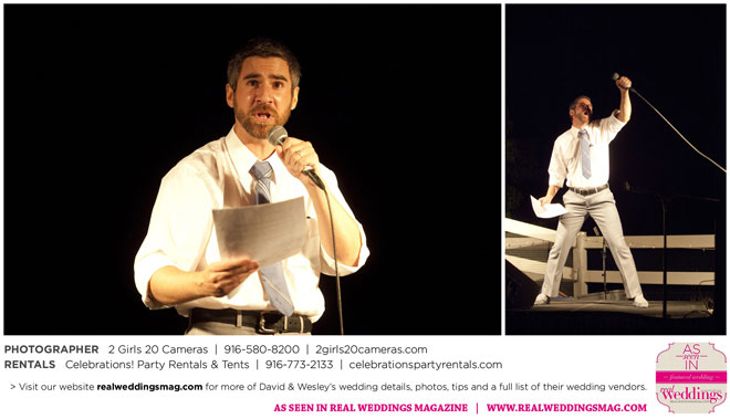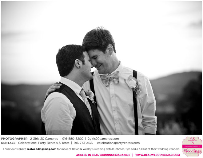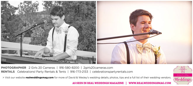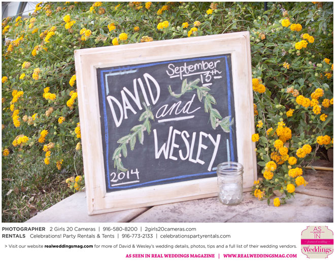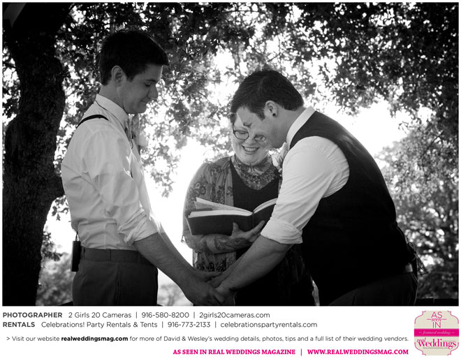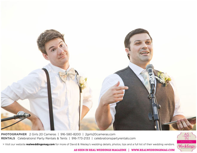 The couple had to plan their wedding on a budget, so they cut out what they could, including videography and a wedding planner. “The DJ, lighting, flowers, décor, wine, catering, and even venue had all been graciously offered as gifts from our talented friends and family,” David says. Both the ceremony and reception took place in a friend’s backyard in the foothills, also bringing costs down. “A lot of people contributed to making the wedding successful,” Wesley says. “We kept referring to the wedding as a barn raising, since so many people came together to help us.”