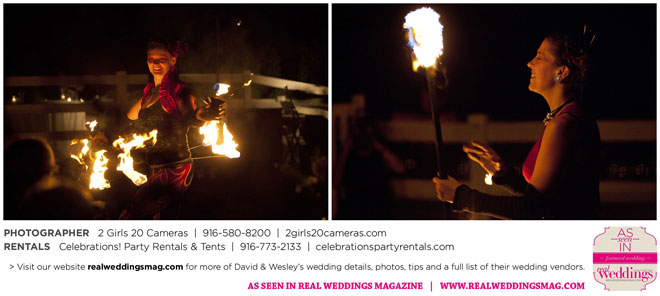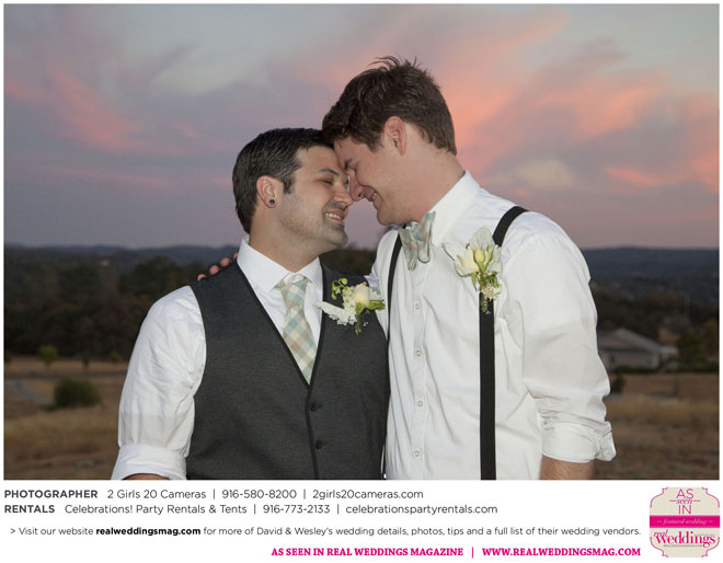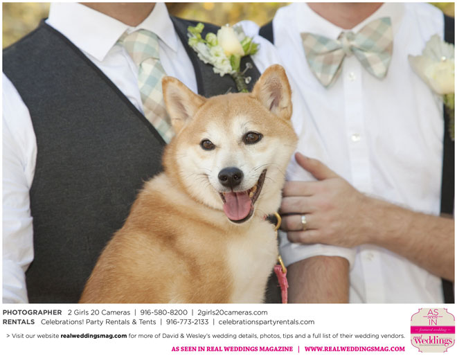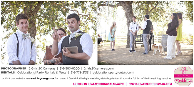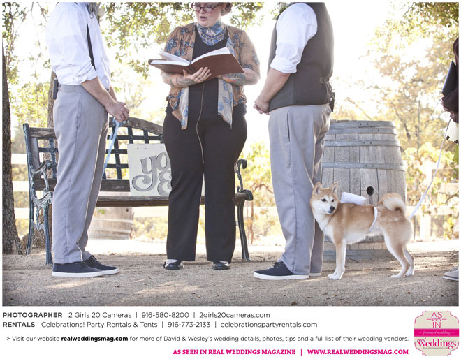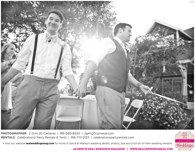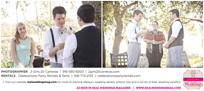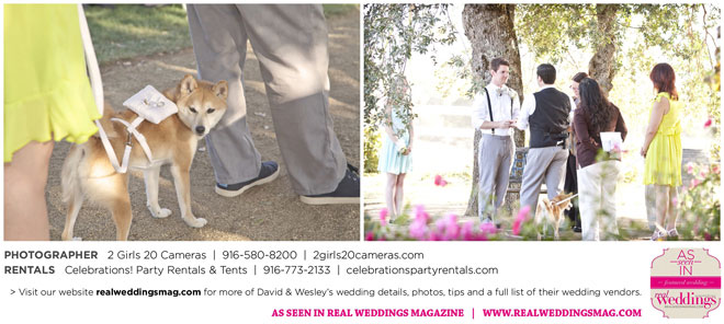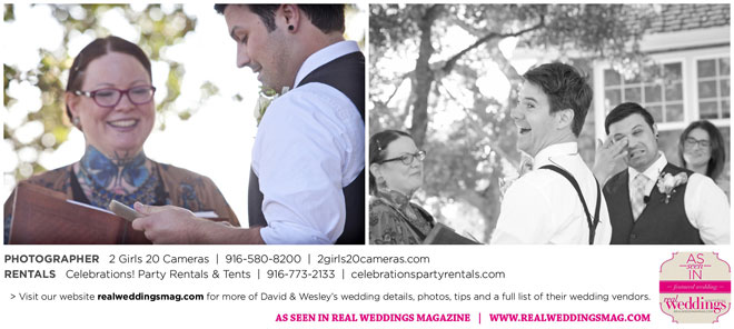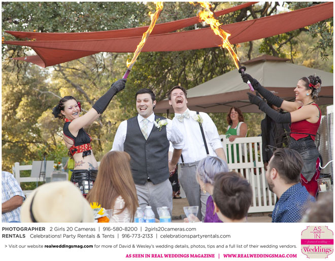 For Wesley, the highlight was the puppet show. “Our friends made these Muppet-style puppets of each of us and reenacted our relationship from dating to marriage via tap dance and puppetry. It was hilarious!” And for David, he will never forget all the love he felt that day. “There was a moment I had by myself when Wesley was changing into his fire performance costume,” he says. “I had our dog, and I’d snuck to the very edge of the yard; my friend Sandy said to me, ‘Just look at all these people who love you.’ I looked out at the twinkling lights and the people smiling, laughing and having a wonderful time. It was nice to breathe and soak it in.”