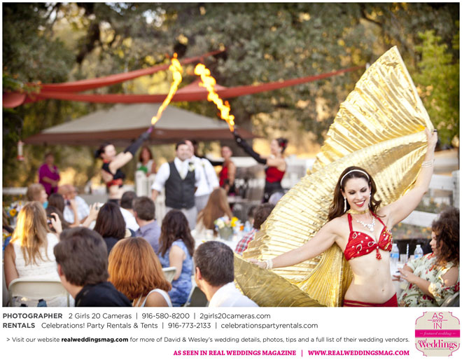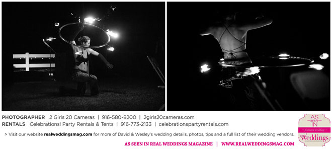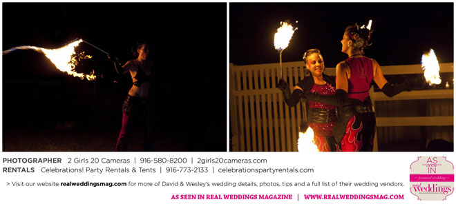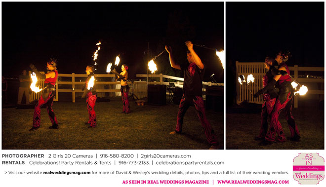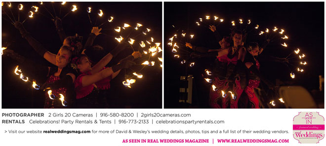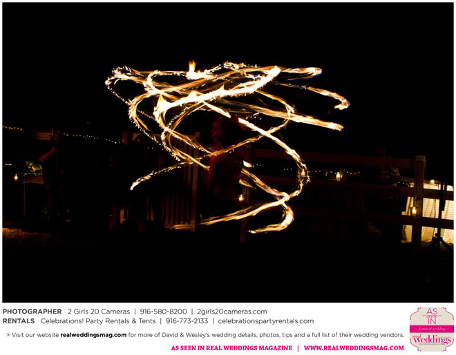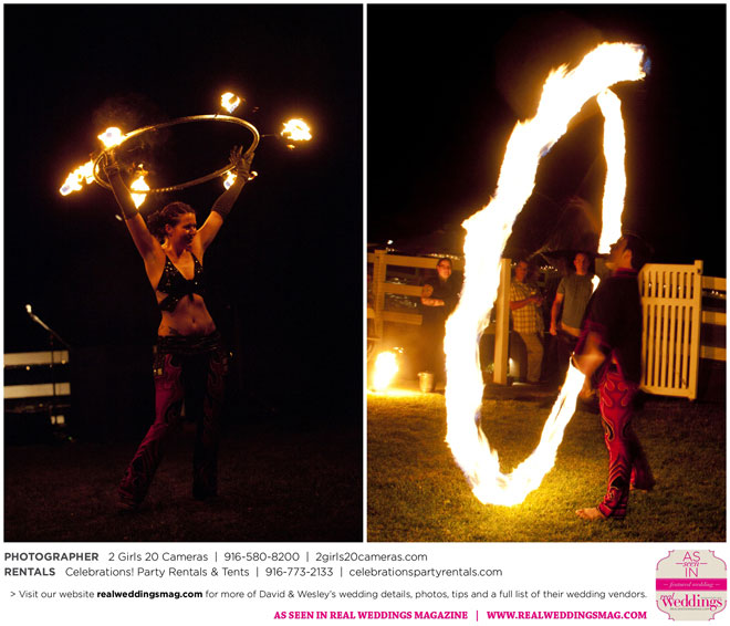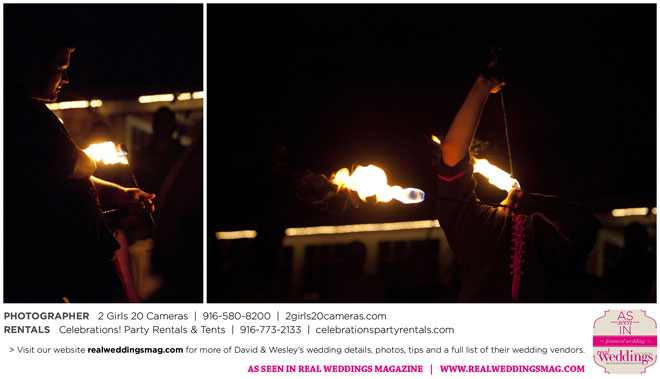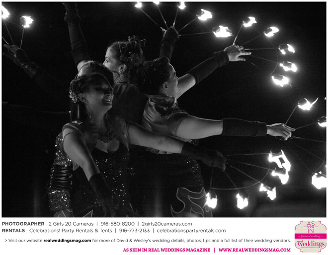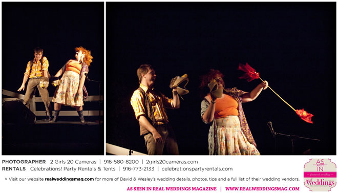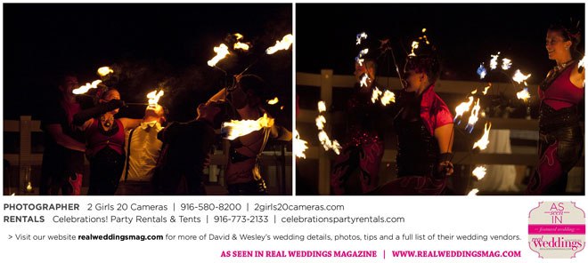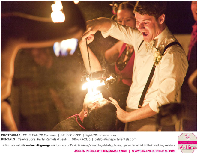 Both Wesley and David are performers—Wesley is a fire dancer and David a musician. Naturally, many of their friends are just as talented and creative. Using this as inspiration, the couple essentially planned a four-hour variety show as their wedding reception.