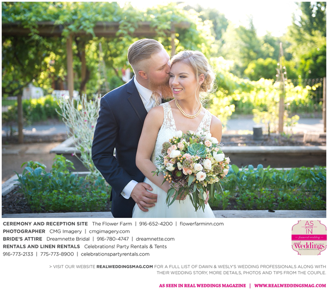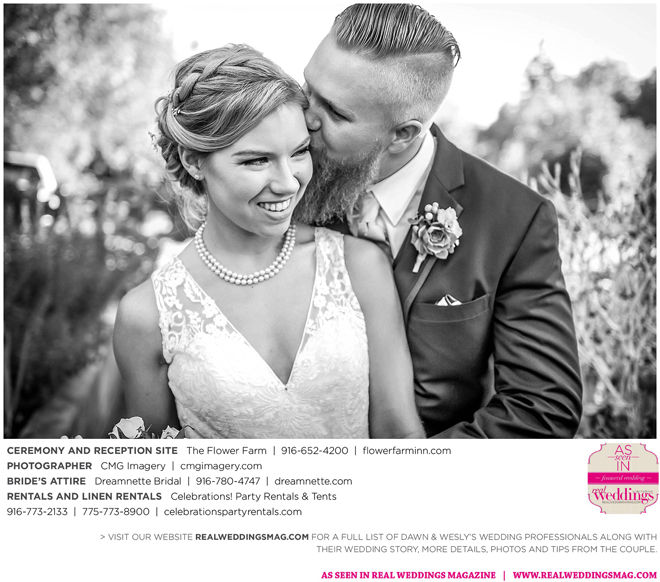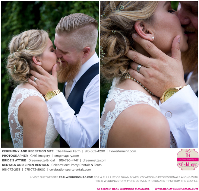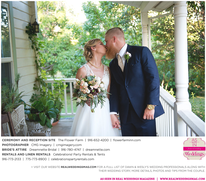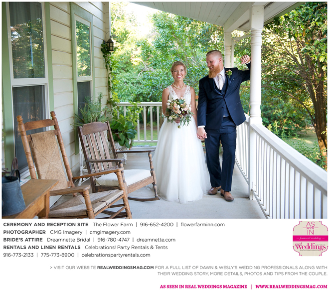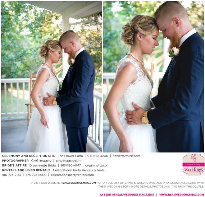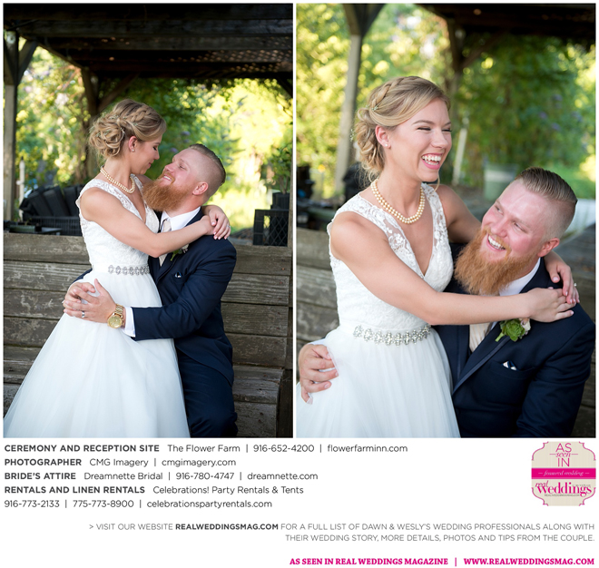 Their favorite funny wedding moment came during the ceremony. “When Wes was told, ‘You may kiss the bride,’ he stuck out his finger, like saying wait a minute,” says Dawn. “He leaned back to his best man, who sprayed breath spray into his mouth. Everyone was dying at that point and then cheering.”
