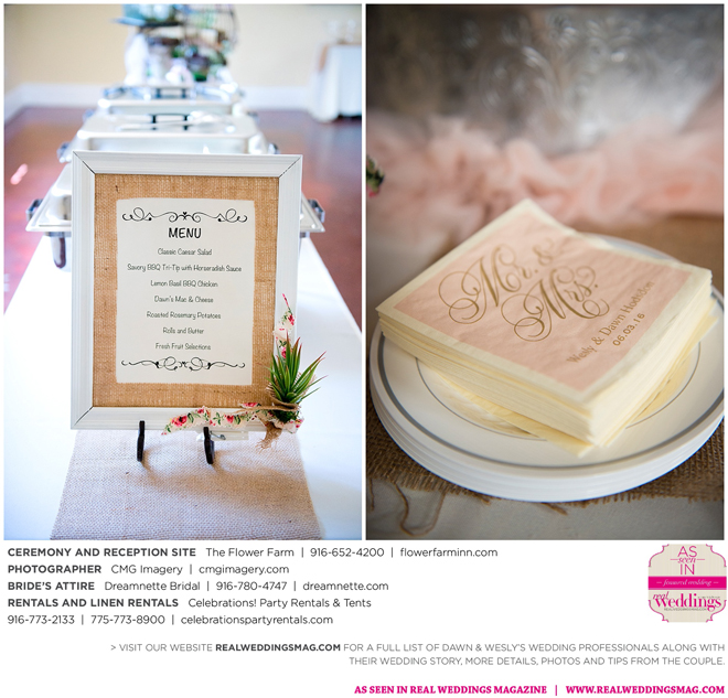 The celebration continued with the reception inside The Flower Farm’s barn, where guests ate BBQ tri-tip and chicken with macaroni and cheese—the bride’s favorite!